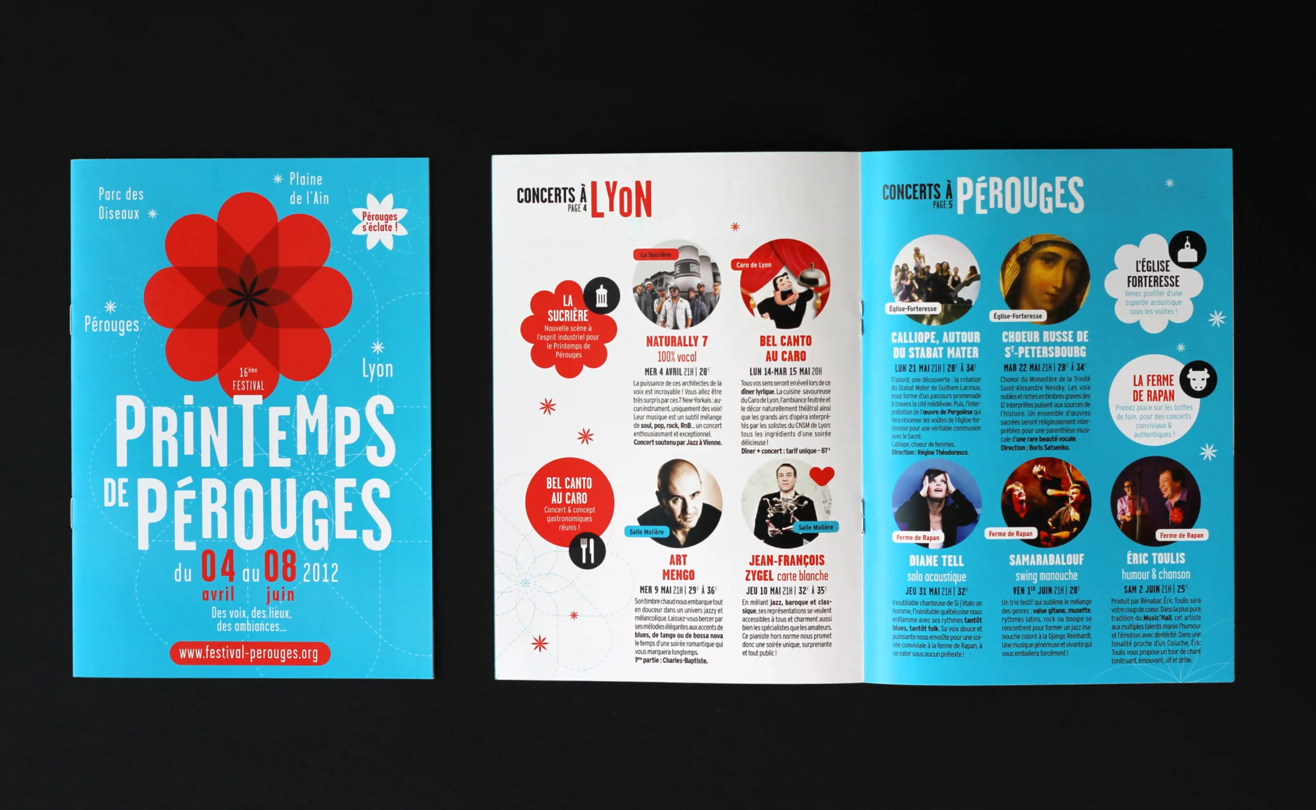 Depuis sa création, le festival de musique du Printemps de Pérouges utilise le coquelicot dans sa communication. Fleur du printemps par excellence, sa couleur résonne bien avec la terminaison « rouge » de « Pérouges »… Nous avons donc proposé d’articuler l’identité visuelle autour de ce coquelicot, que nous avons retravaillé en format papier de manière géométrique et gigantesque. La composition typographique en Garage Gothic, vient juste faire danser les lettres et renforcer l’aspect festif. La trame de fond en pointillés vient tracer la silhouette du coquelicot, comme un mandala. Cela permet de relier les points entre les différents lieux du festival musical qui “s’éclate”.