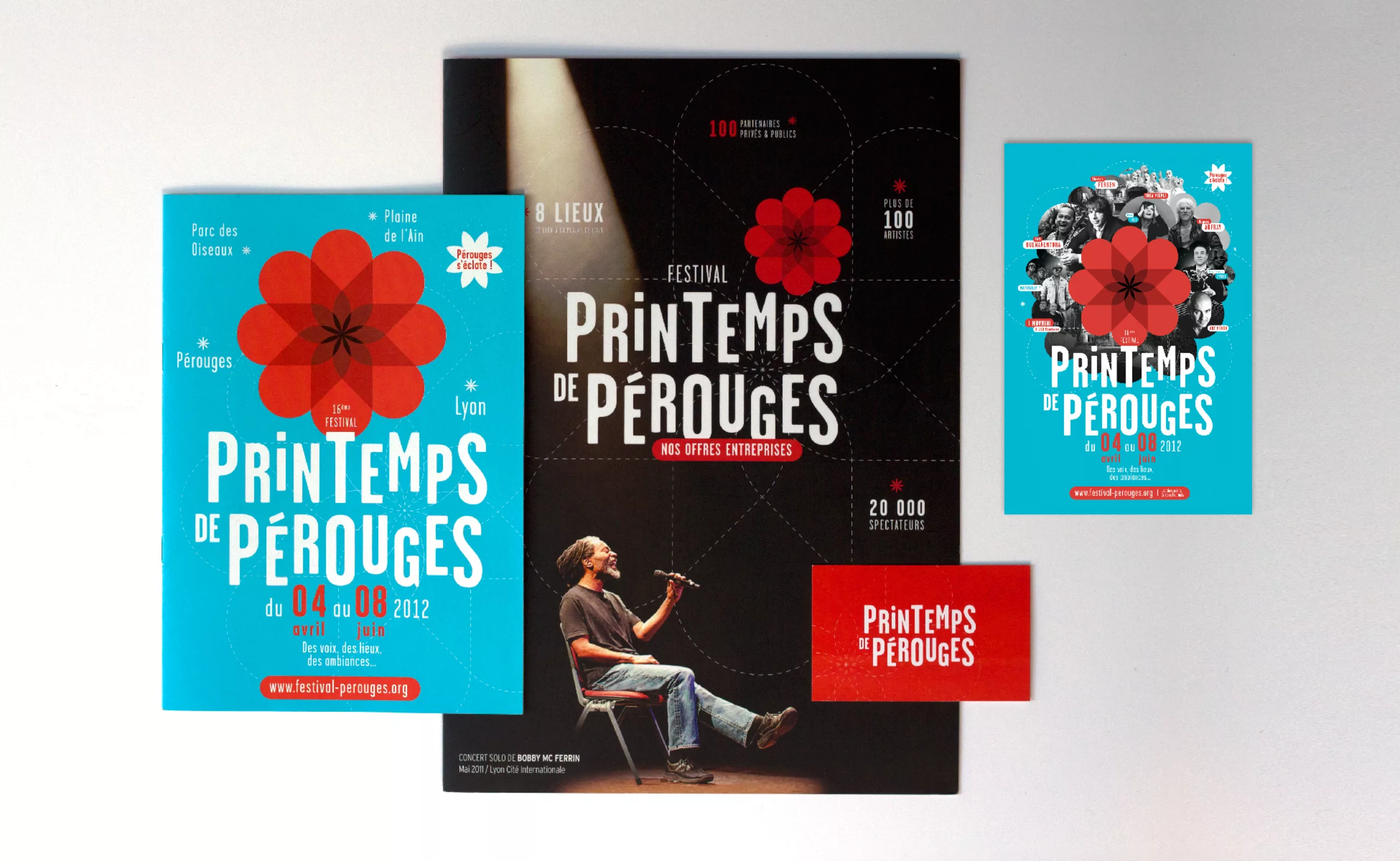 Depuis sa création il y a 20 ans, le coquelicot s’est imposé comme le signe annonciateur du Printemps de Pérouges, un festival musical et éclectique. Sa graine provient d’un ancien partenariat avec le parfum “flower” de Kenzo, puis il a refleuri chaque année. Pour cette occasion, nous faisons les jardiniers de papier en faisant fleurir le coquelicot à travers les différents supports de communication de ce festival de musique.