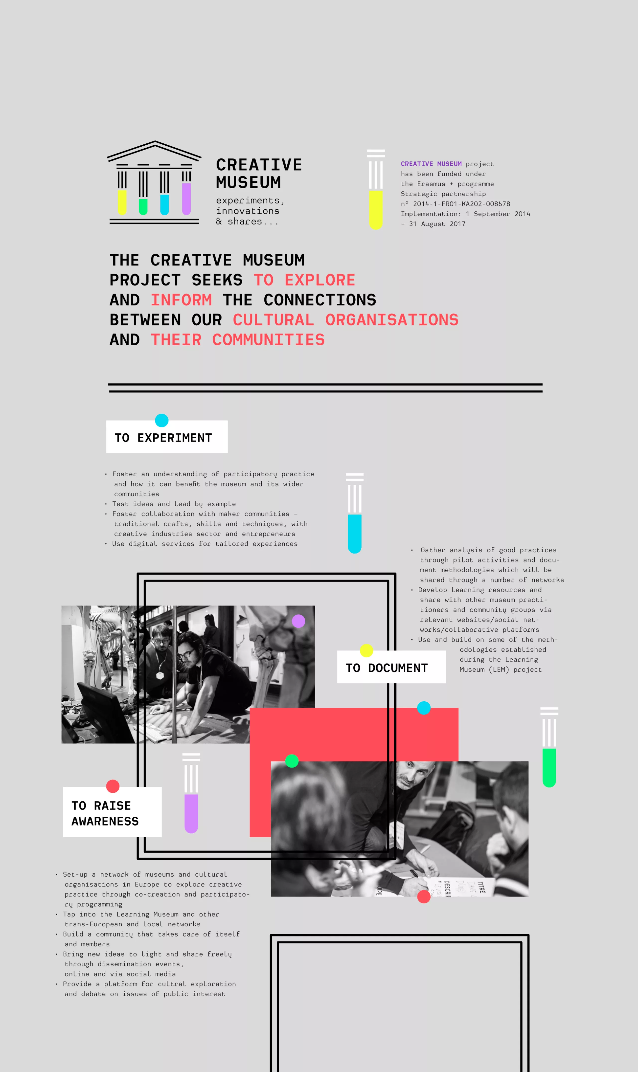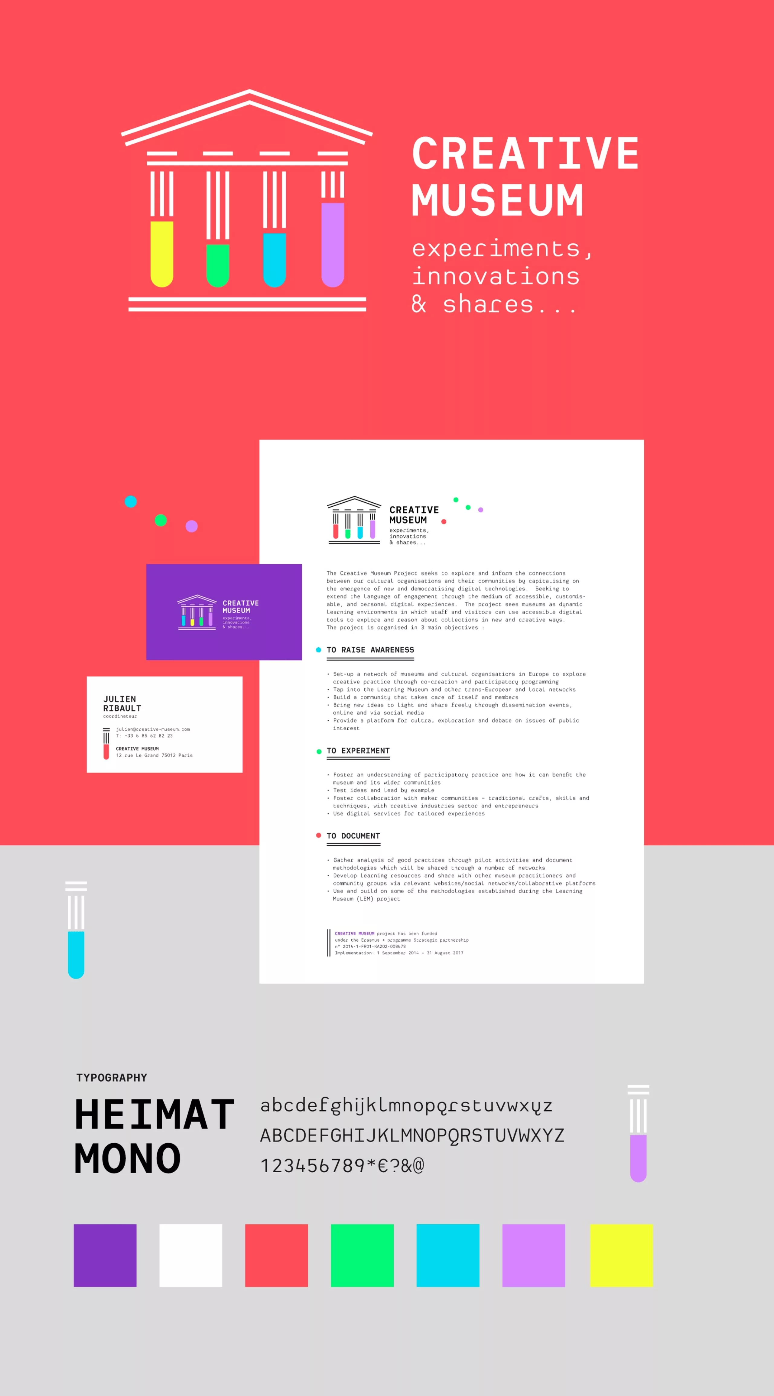 Le programme Creative Museum cherche à explorer et à étudier les liens entre nos institutions culturelles et leurs communautés en capitalisant sur la démocratisation des technologies numériques. Ce programme cherche à étendre le langage de l’engagement par l’entremise d’expériences numériques accessibles, personnalisables, et personnelles. Le musée devient un environnement d’apprentissage dynamique dans lequel le personnel et les visiteurs peuvent utiliser les outils numériques pour explorer les collections de façons nouvelles et créatives. Ce programme est soutenu et financé par l’Union Européenne à travers ERAMUS +. Voici le projet d’identité visuelle (non retenu) que nous avons présenté.