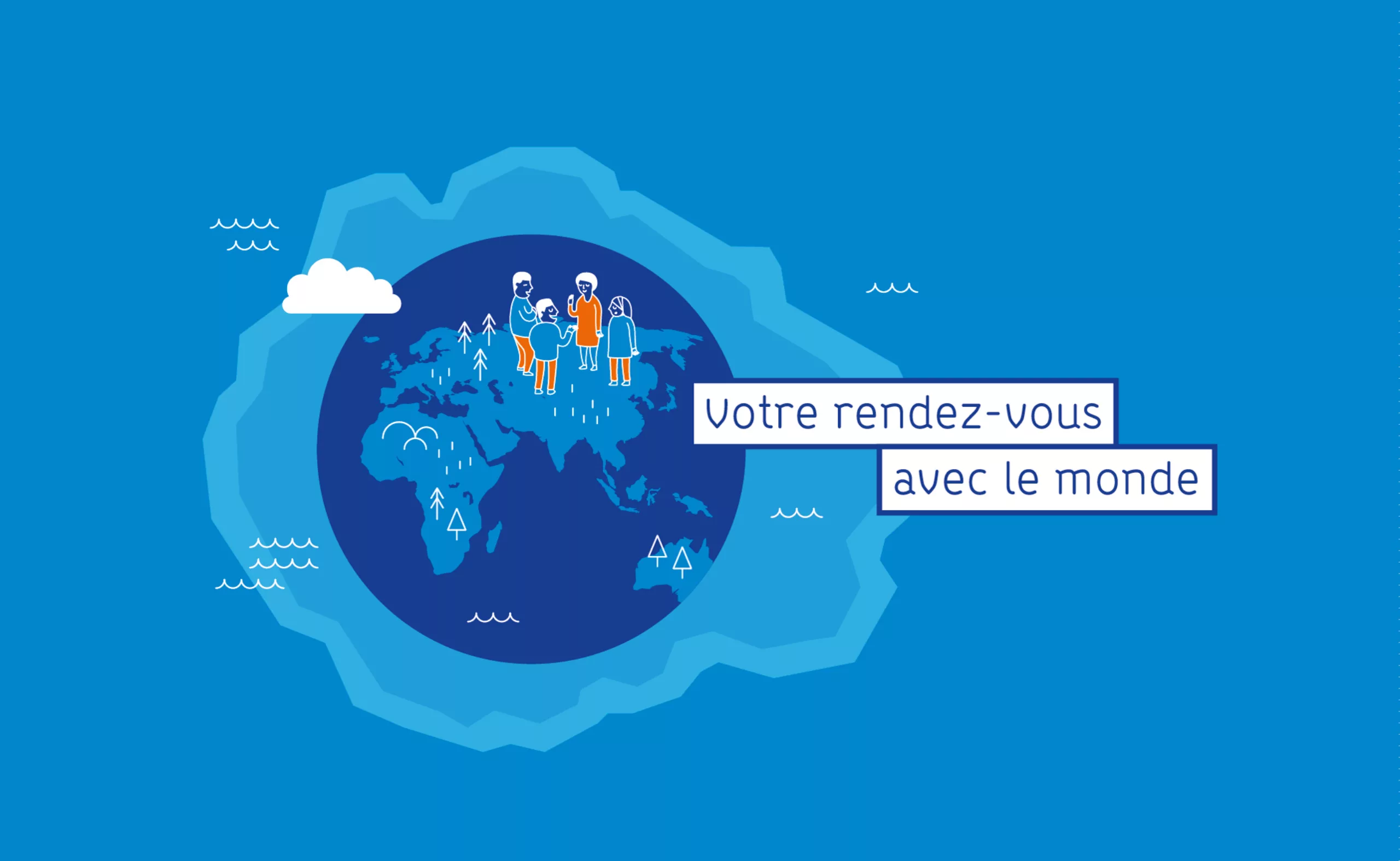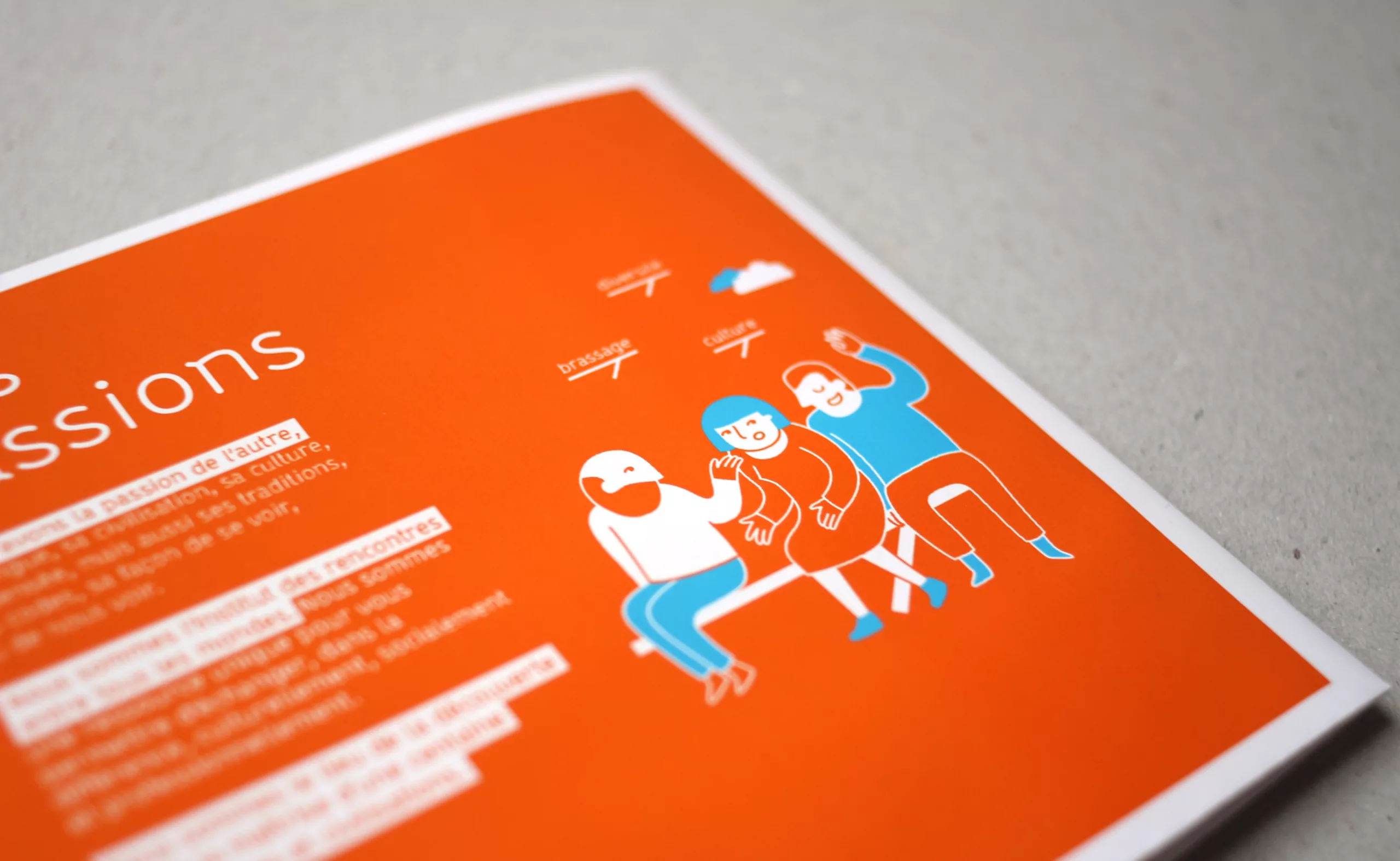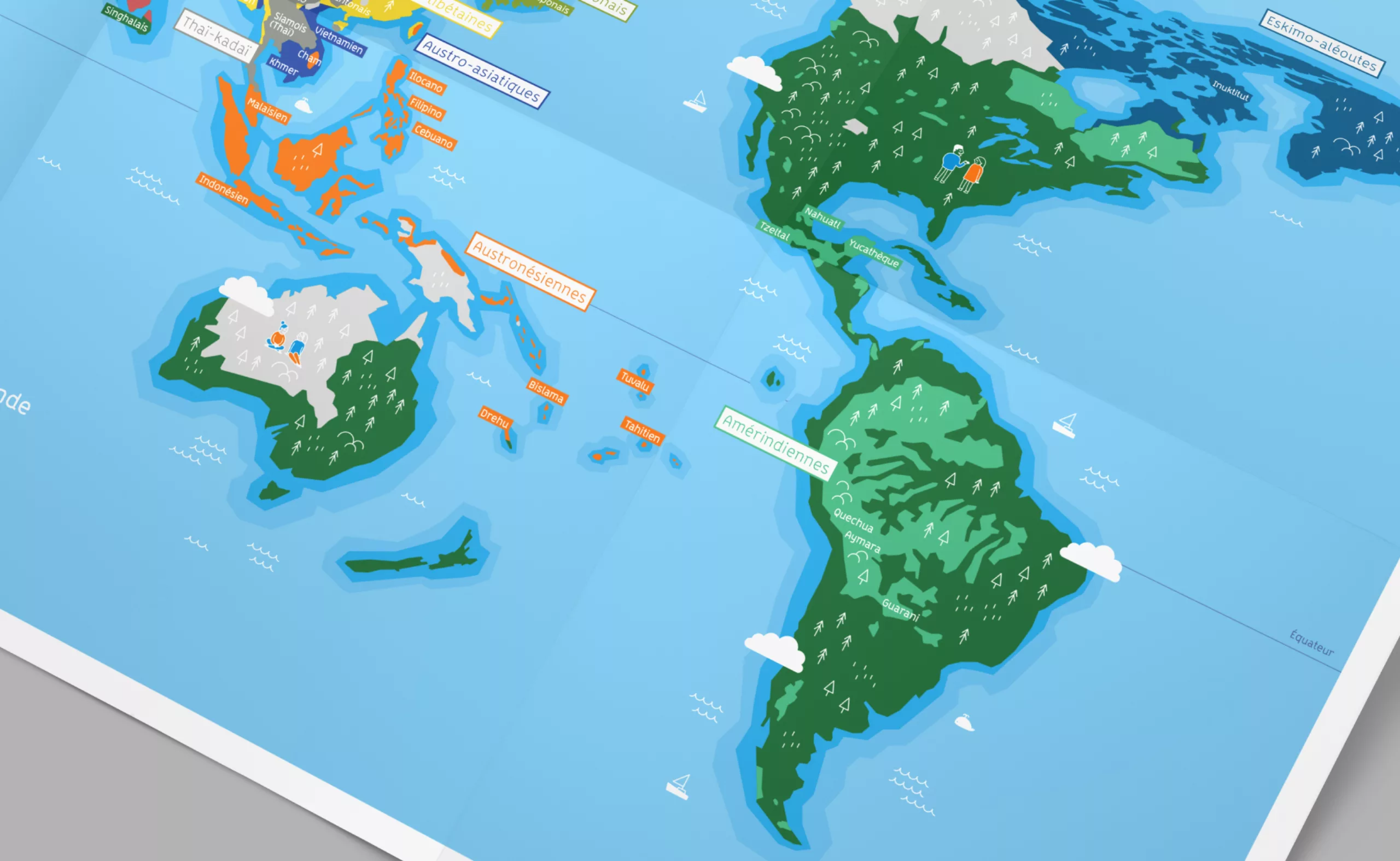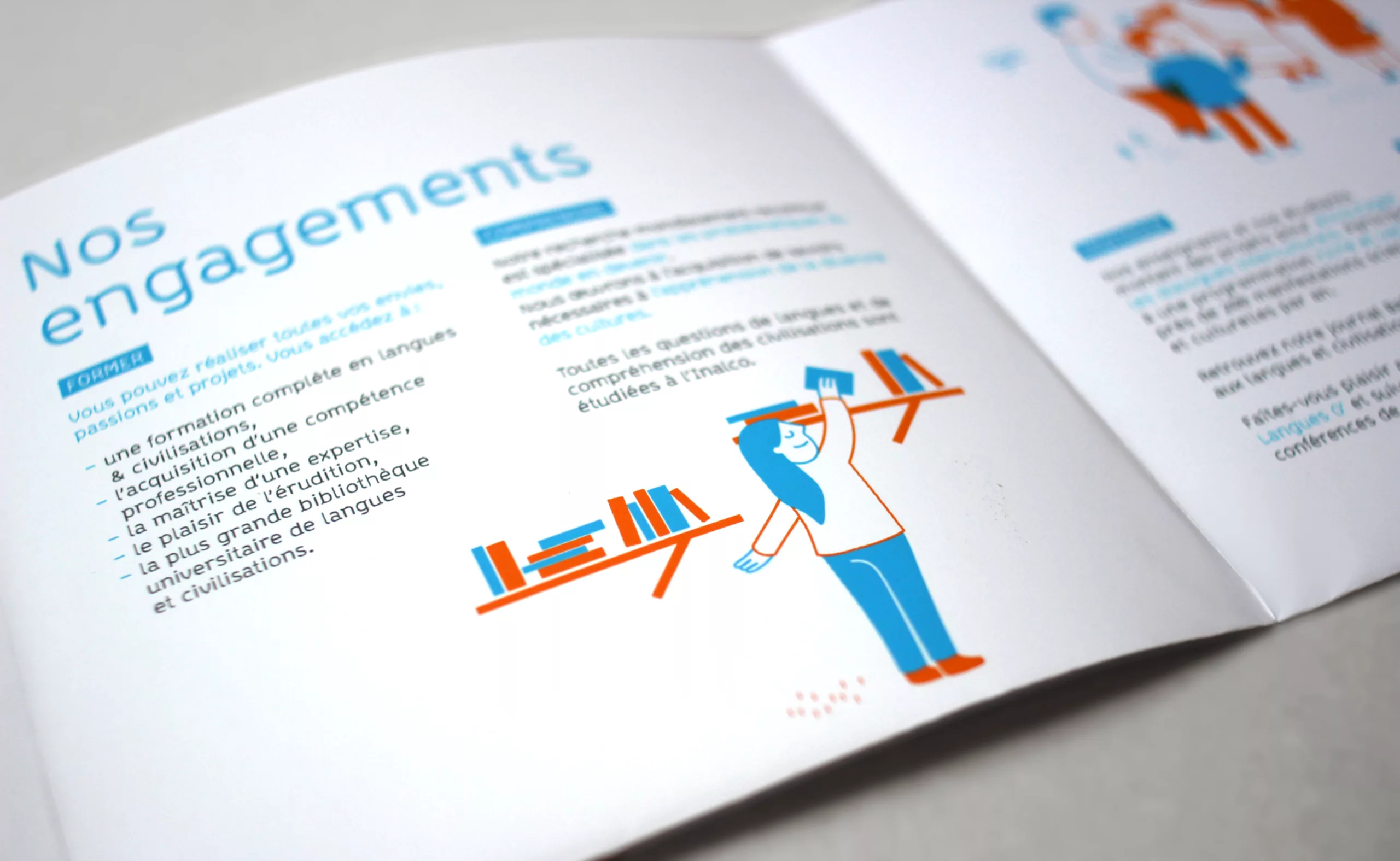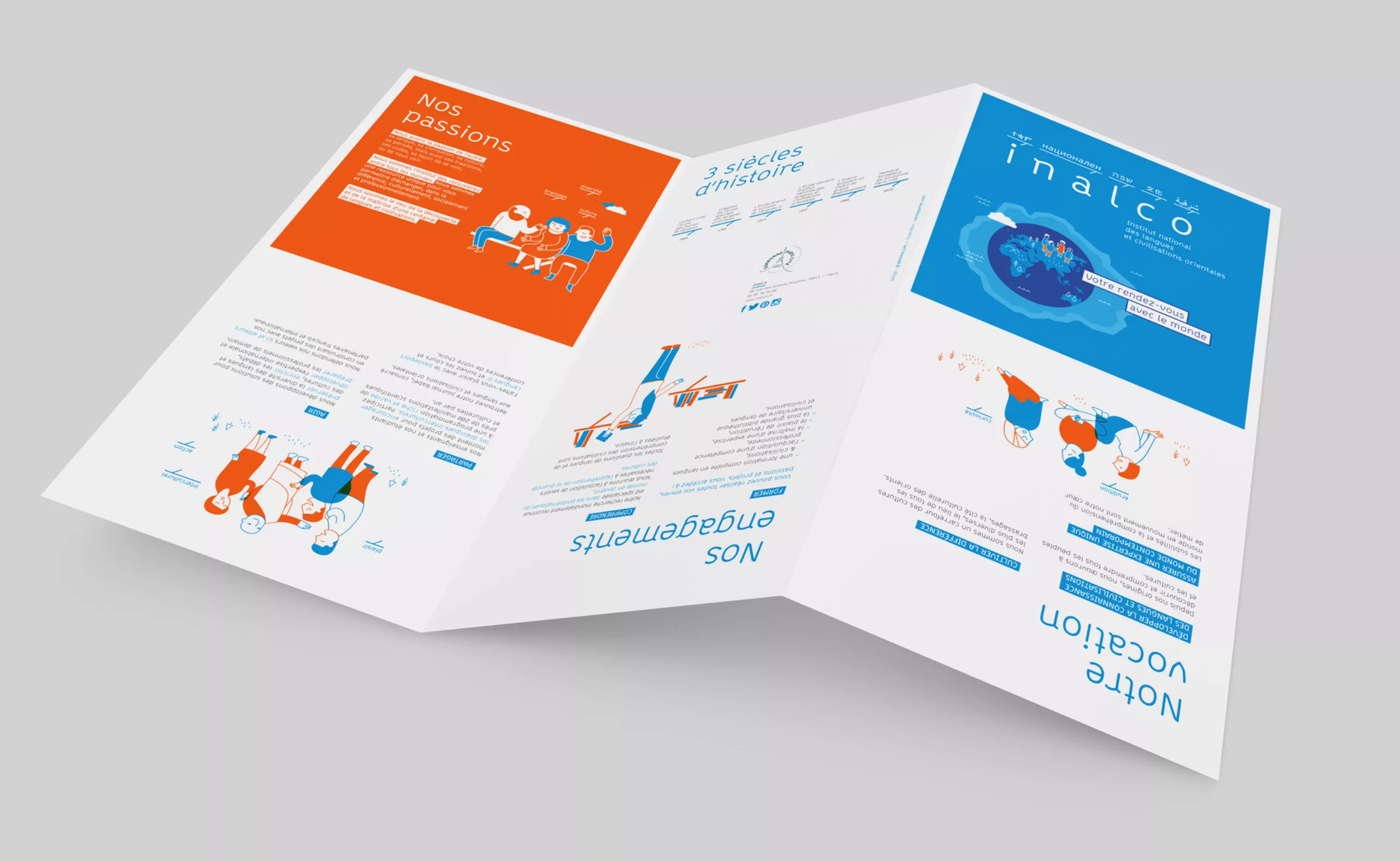 Pour ce dépliant nous avons choisi de présenter au verso une carte des différentes langues enseignées à l’Inalco. Afin d’éviter une représentation du monde centrée sur l’Europe, nous avons proposé une représentation inhabituelle. Cela illustre parfaitement la promesse d’ouverture sur le monde de cet établissement. Un travail d’illustration subtile et poétique permet de valoriser l’idée d’échanges interculturels. Toutes les cultures sont mises en avant.