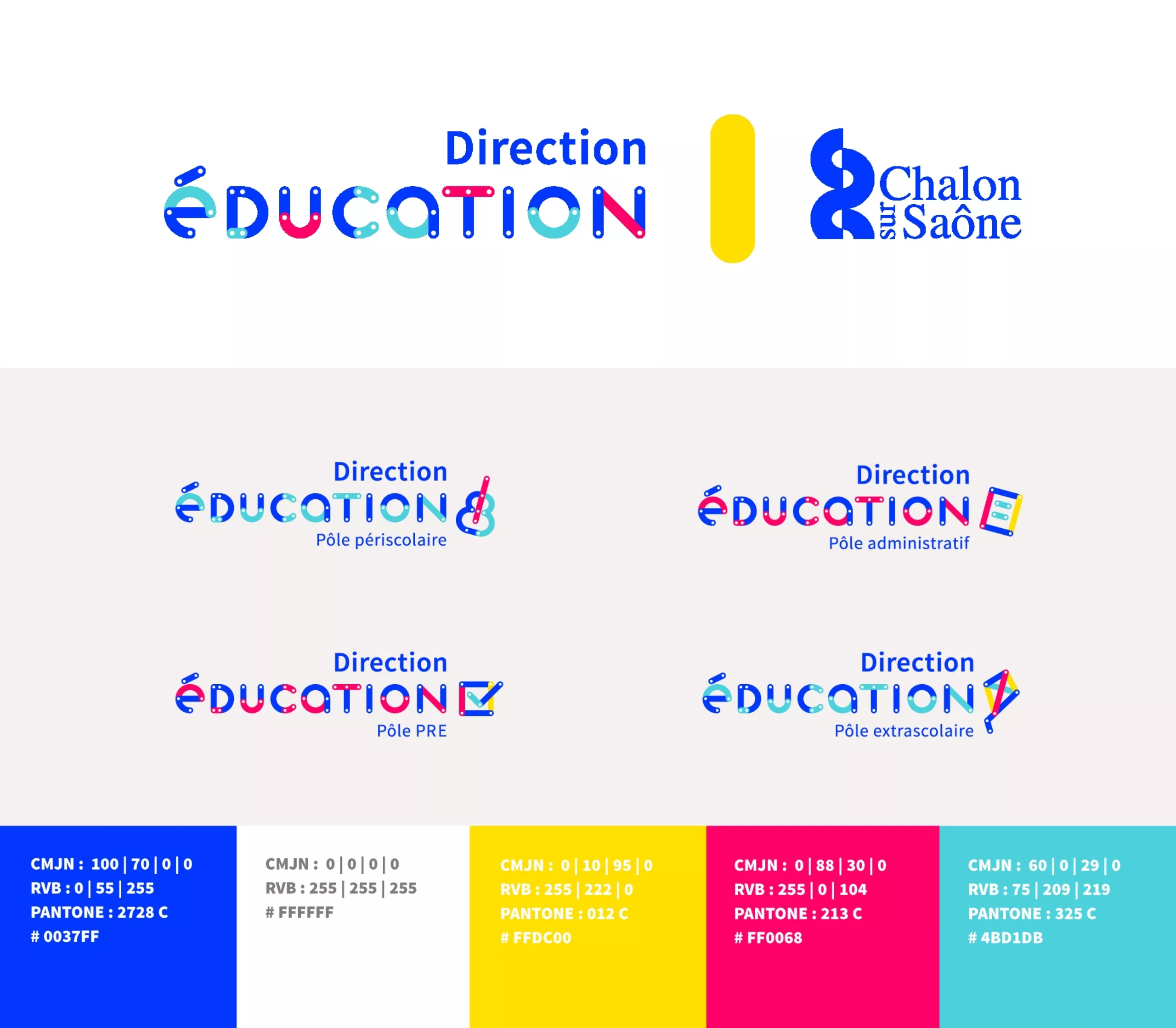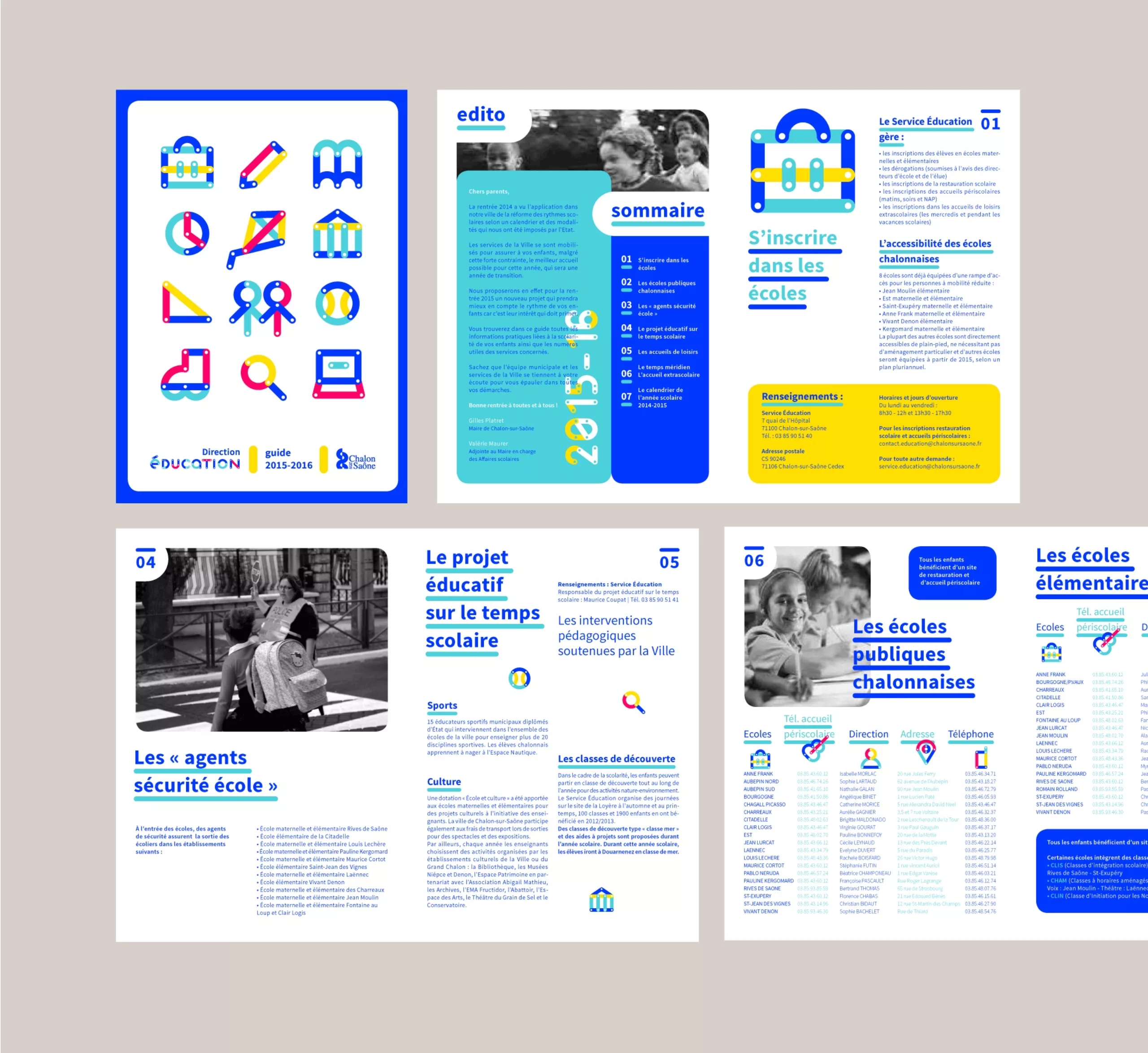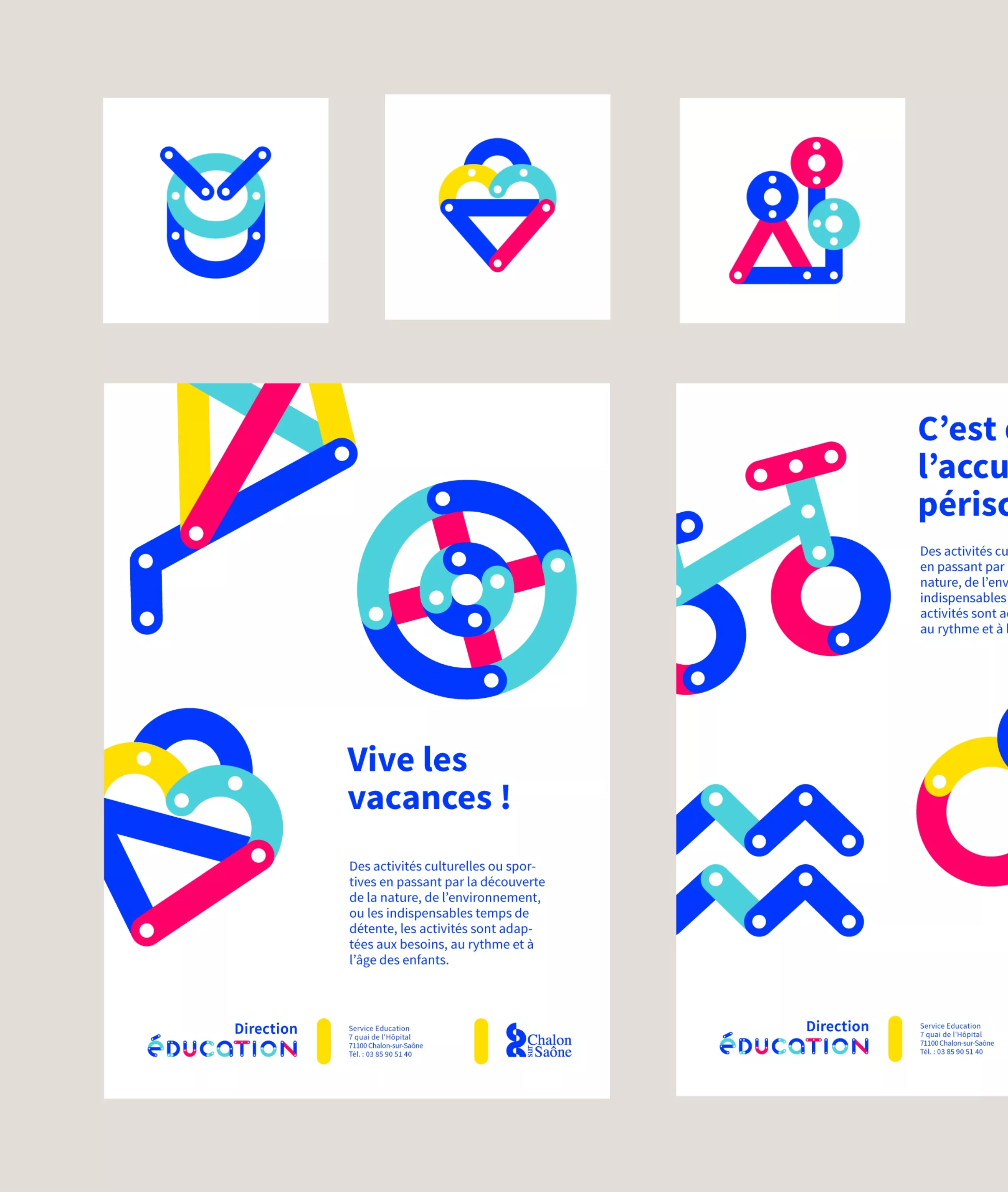 Voici l’identité visuelle que nous avons créée pour la Direction de l’Éducation de la Ville de Chalon-sur-Saône. Il s’agissait de concevoir une charte graphique facilement déclinable afin d’harmoniser et faciliter, entre autres, les communications extrascolaire et périscolaire. Nous avons conçu ce travail à la manière d’un jeu de construction, permettant tour à tour de composer le logo, des pictogrammes, des illustrations, ou encore une typographie multicolore ! Le système graphique se veut simple et ludique et doit permettre à la Direction de l’Éducation de réaliser de multiples supports de communication facilement. Nous avons ainsi réalisé une cinquantaine de pictogrammes afin de pouvoir illustrer une infinité de sujets.