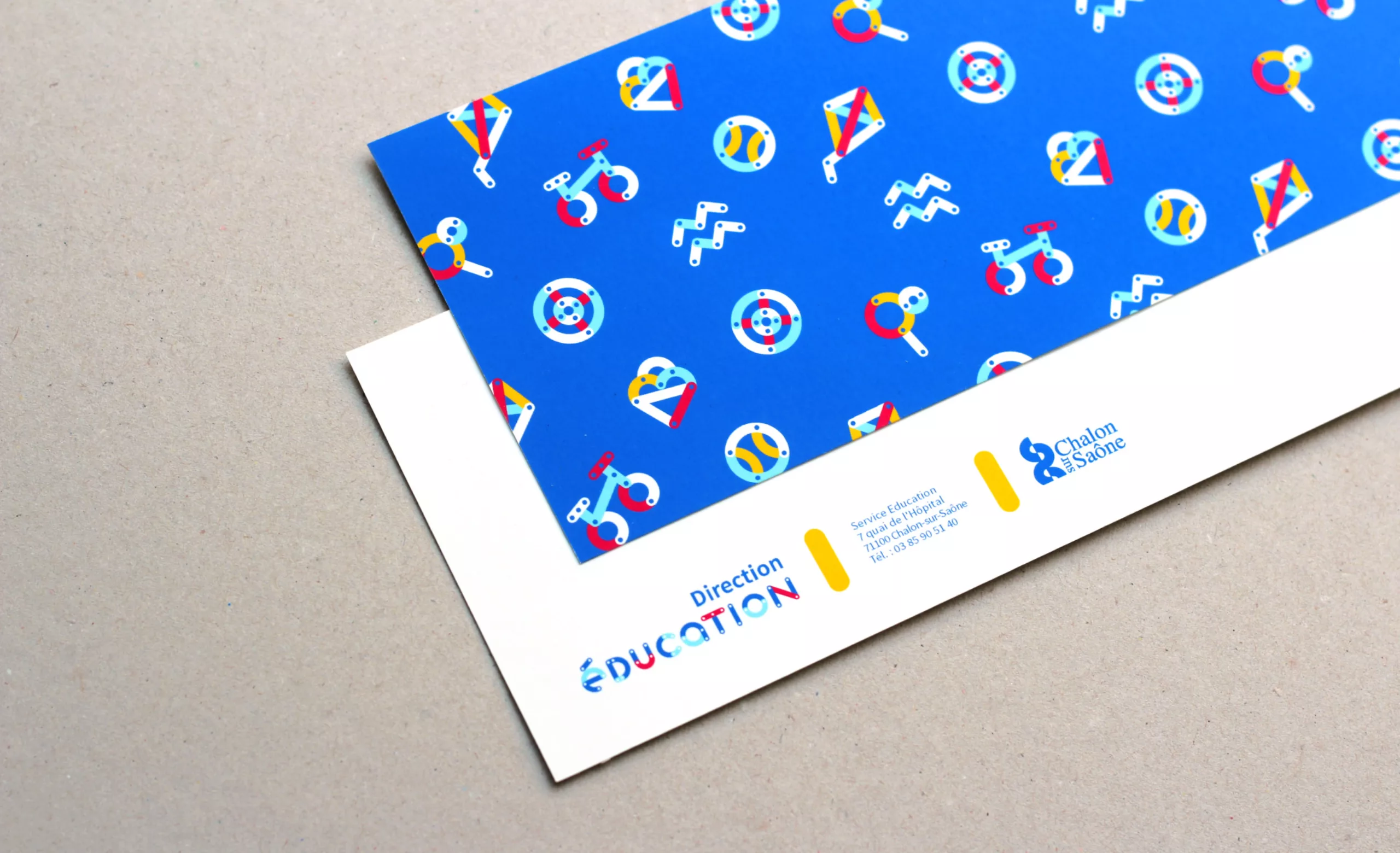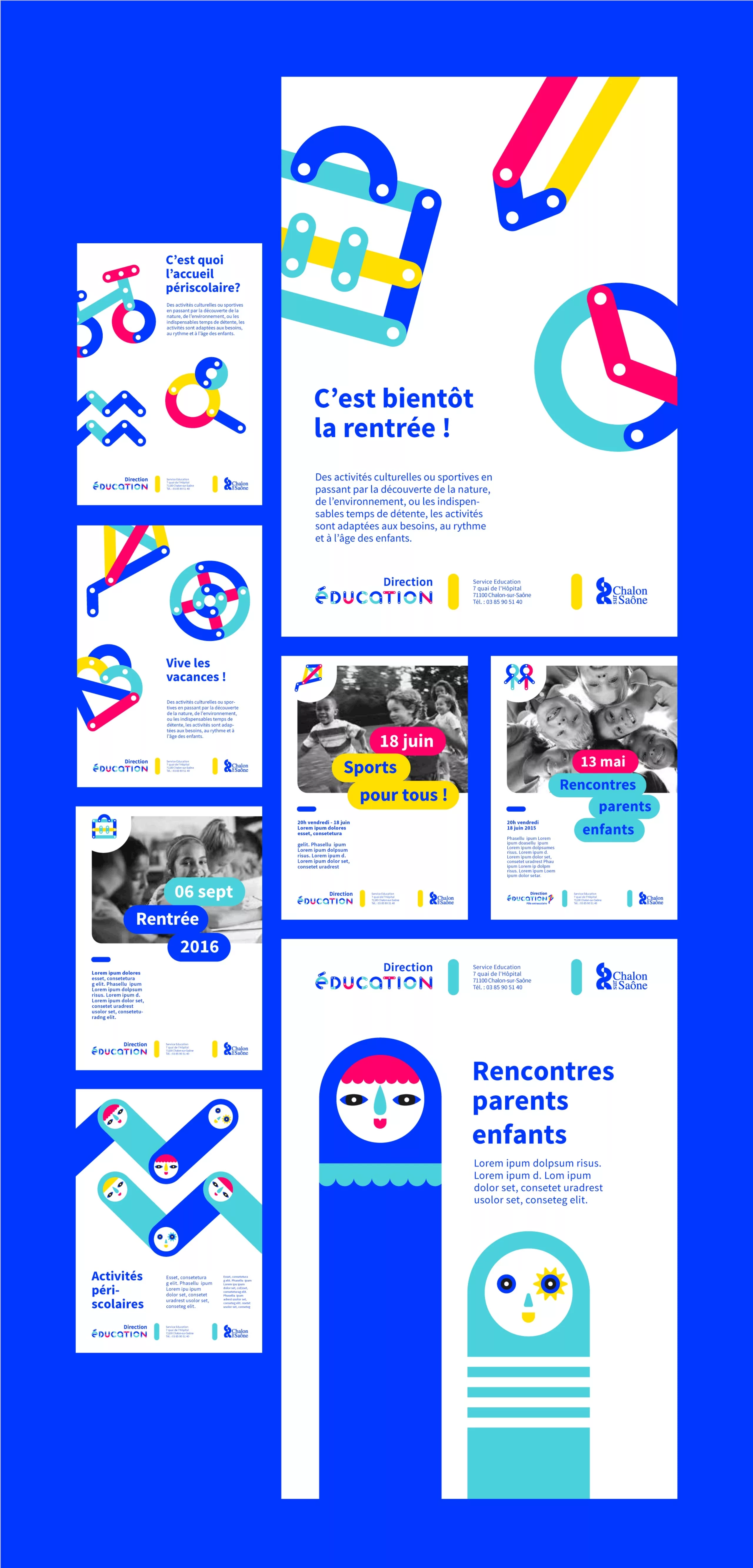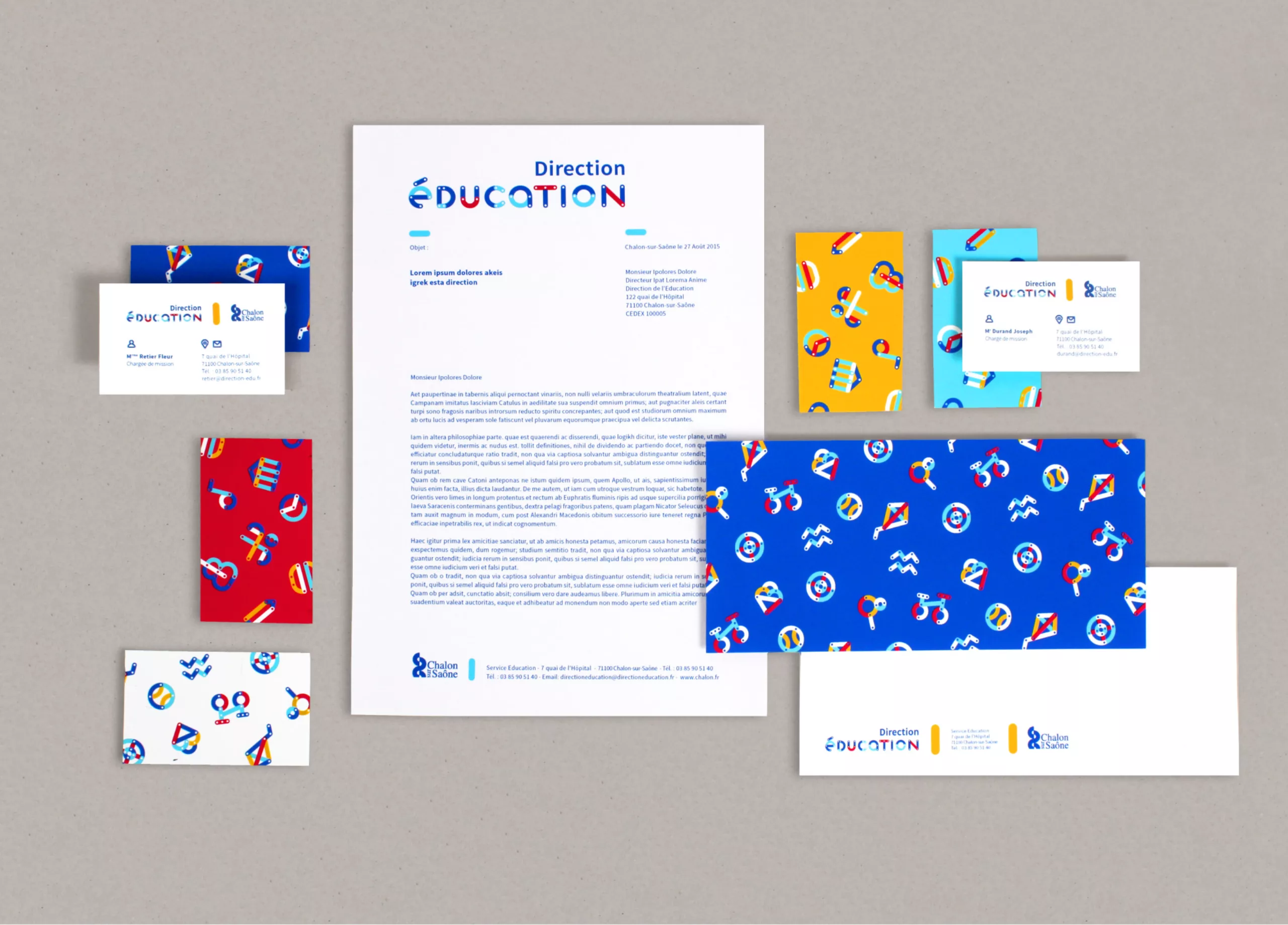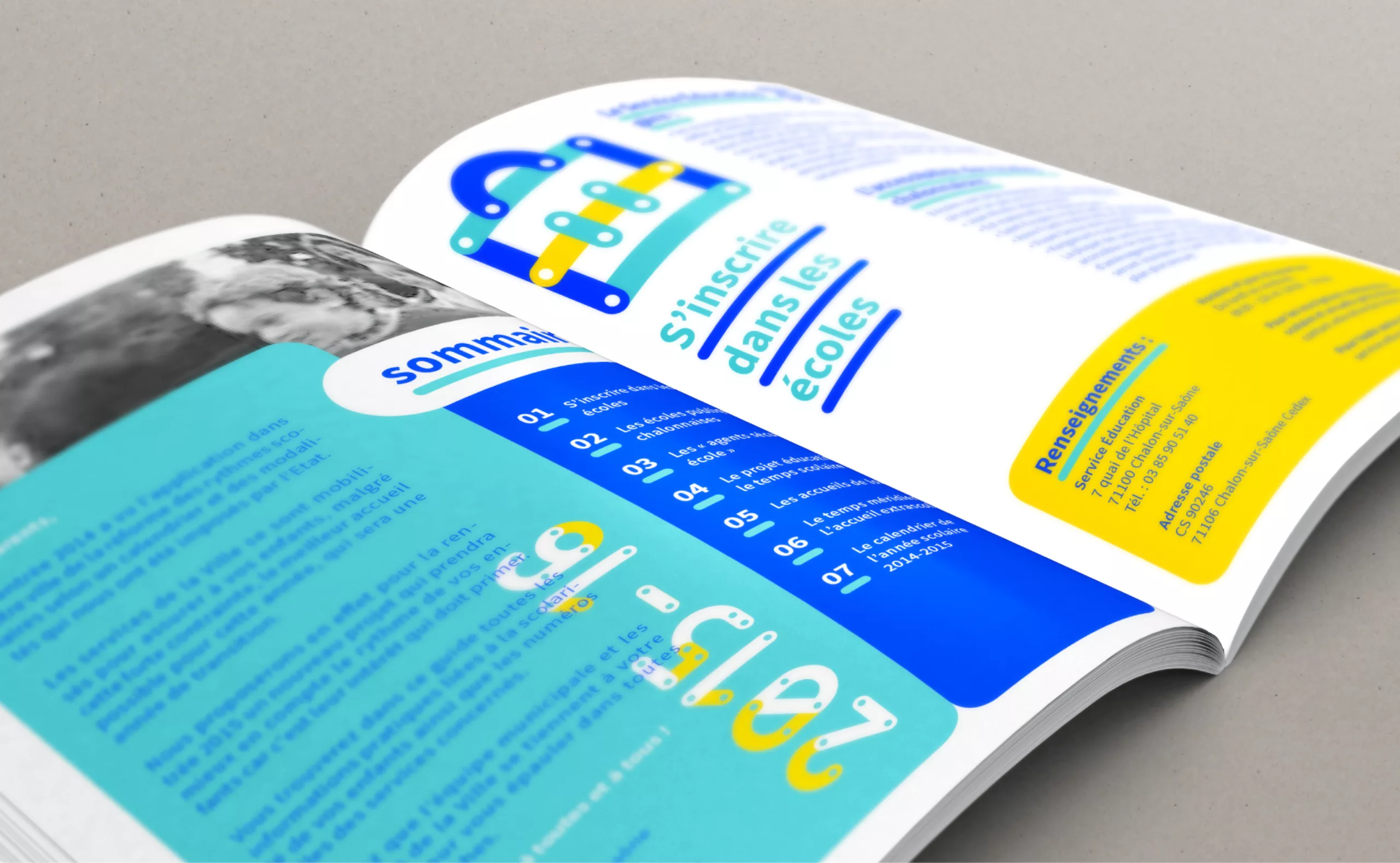 Voici l’identité visuelle que nous avons créée pour la Direction de l’Éducation de la Ville de Chalon-sur-Saône. Il s’agissait de concevoir une charte graphique facilement déclinable afin d’harmoniser et faciliter, entre autres, les communications extrascolaire et périscolaire. Nous avons conçu ce travail à la manière d’un jeu de construction, permettant tour à tour de composer le logo, des pictogrammes, des illustrations, ou encore une typographie multicolore ! Le système graphique se veut simple et ludique et doit permettre à la Direction de l’Éducation de réaliser de multiples supports de communication facilement. Nous avons ainsi réalisé une cinquantaine de pictogrammes afin de pouvoir illustrer une infinité de sujets.