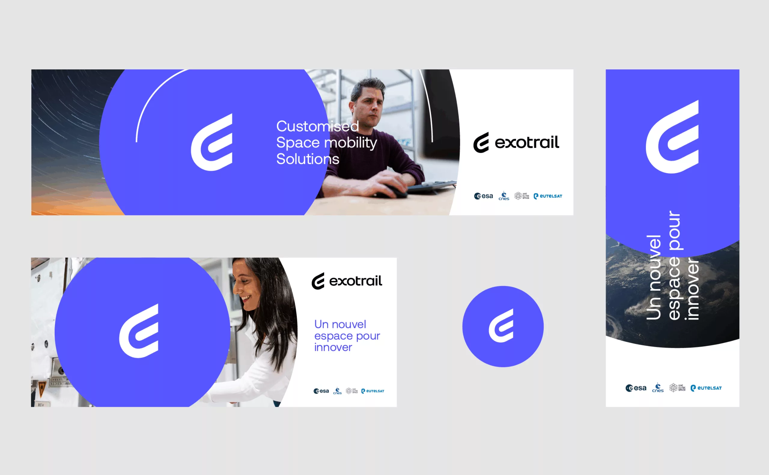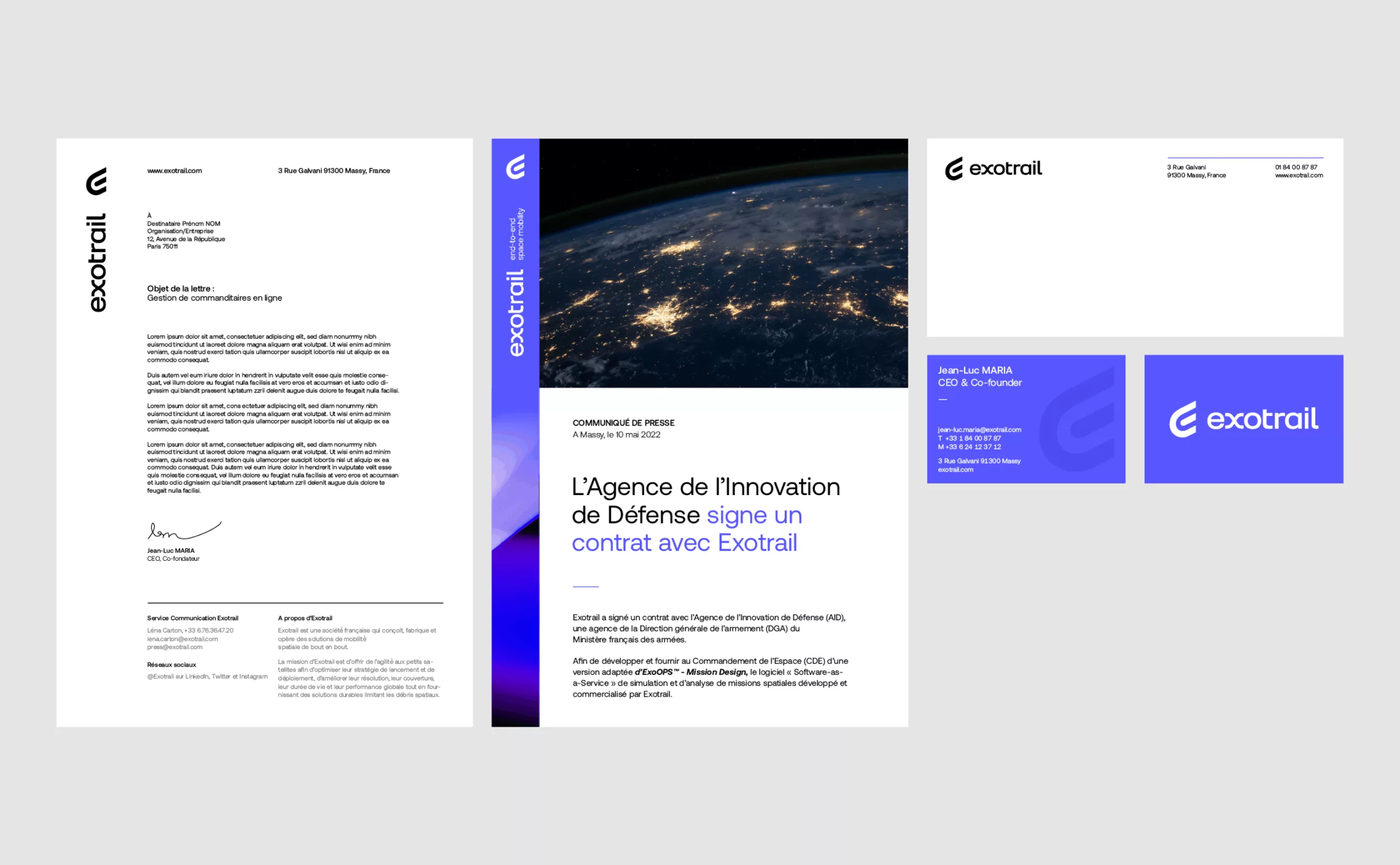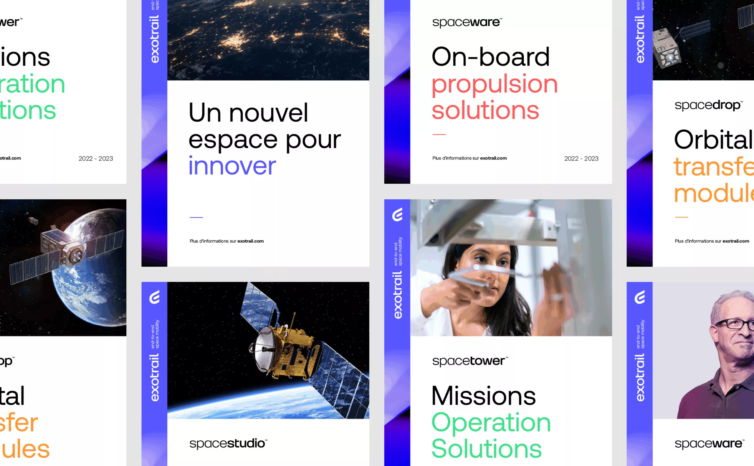 Nous avons créé une charte graphique qui préconise une utilisation stratégique de la palette de couleurs. La couleur principale de la marque, le bleu propulsion, est la couleur emblématique de l’identité. Cependant, toutes les couleurs secondaires sont utilisées par touche pour souligner les visuels. Une présence importante reste accordée à l’univers noir et blanc. « Aeonik », de la fonderie CoType, a été choisie comme typographie officielle de la marque. Cette typographie s’accorde parfaitement avec le nouveau logo et le lettrage grâce à ses détails qui font échos au bloc marque — la queue du Q, l’horizontalité des terminaisons des t, a, j et y minuscules. Non seulement cette horizontalité répond au lettrage Exotrail, mais elle constitue également une version contemporaine de l’esthétique du logo « worm » de la NASA. Tous les éléments de la marque sont liés par un système de grille modulaire qui permet de placer images, textes et assets de la marque. Les liserés colorés marquent les supports de communication et permettent une identification de la marque fille qui s’exprime.