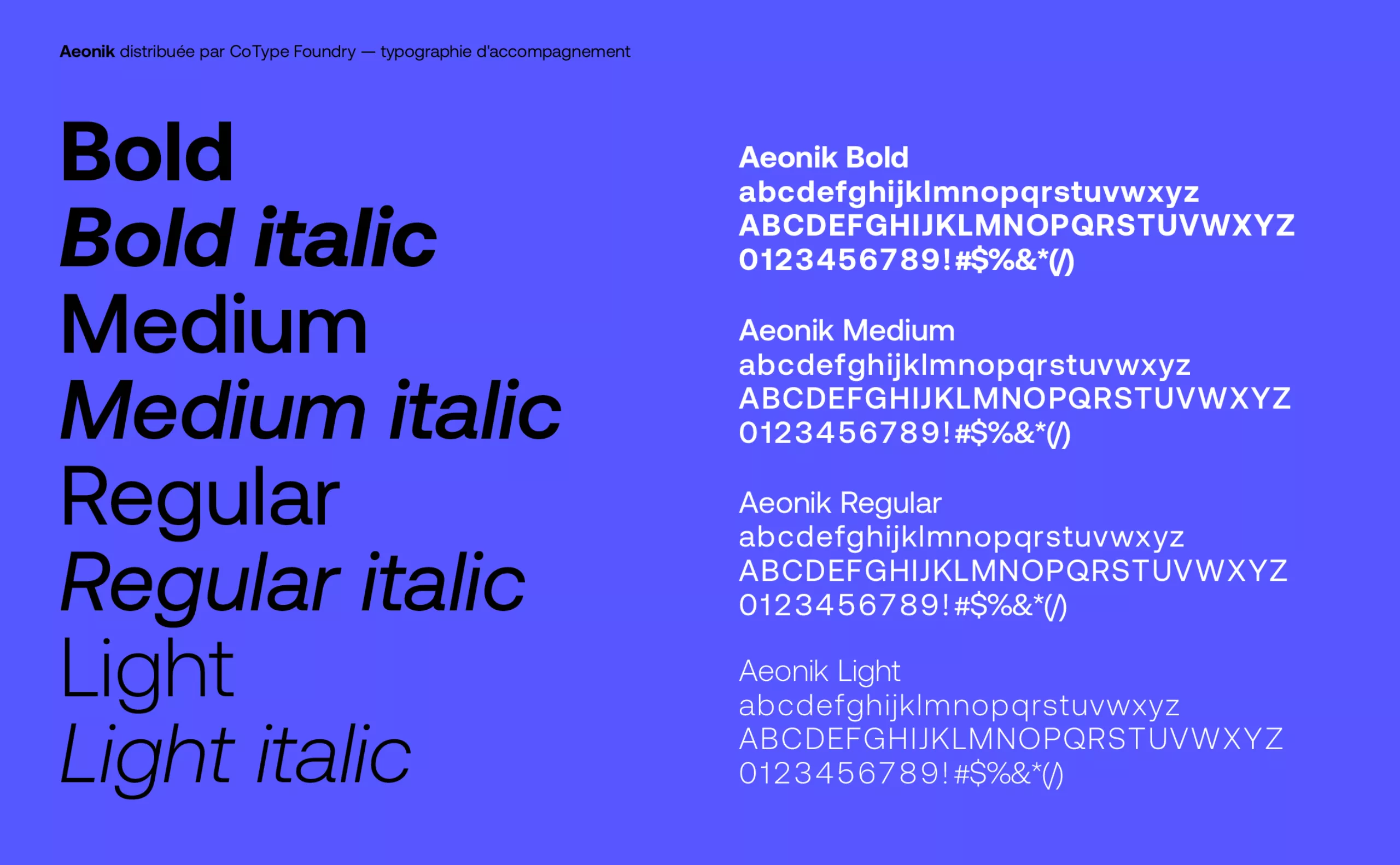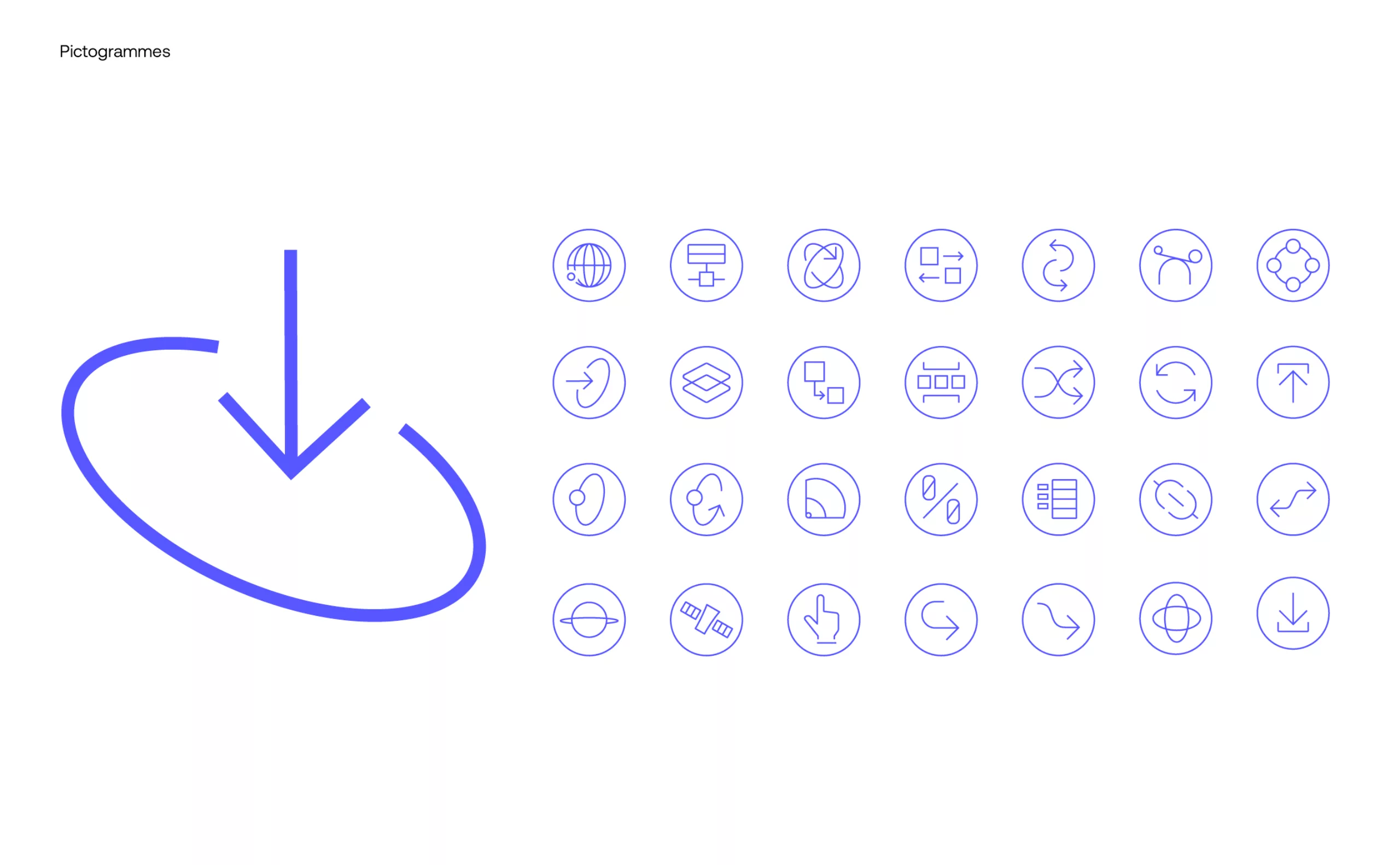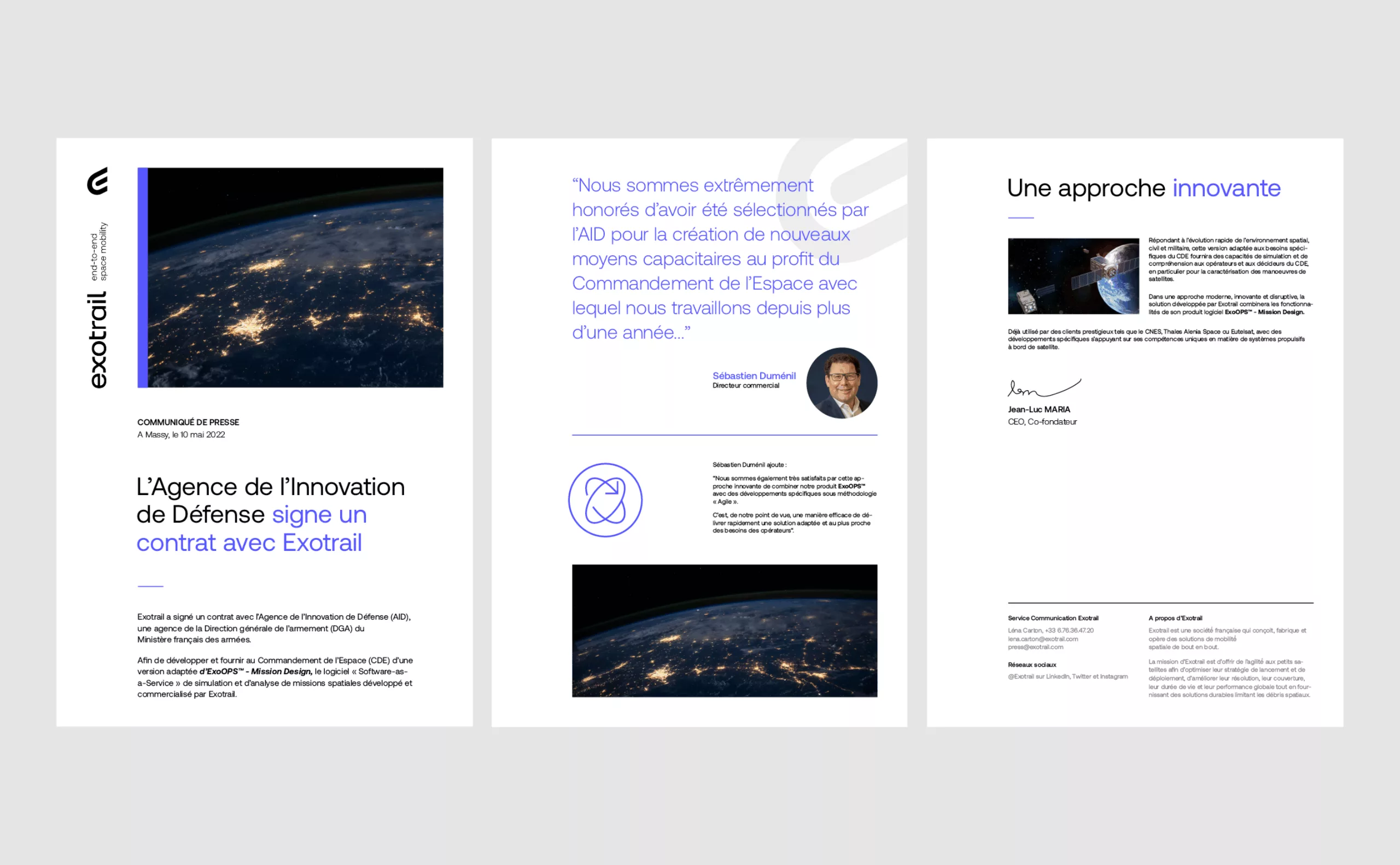 Nous avons créé une charte graphique qui préconise une utilisation stratégique de la palette de couleurs. La couleur principale de la marque, le bleu propulsion, est la couleur emblématique de l’identité. Cependant, toutes les couleurs secondaires sont utilisées par touche pour souligner les visuels. Une présence importante reste accordée à l’univers noir et blanc. « Aeonik », de la fonderie CoType, a été choisie comme typographie officielle de la marque. Cette typographie s’accorde parfaitement avec le nouveau logo et le lettrage grâce à ses détails qui font échos au bloc marque — la queue du Q, l’horizontalité des terminaisons des t, a, j et y minuscules. Non seulement cette horizontalité répond au lettrage Exotrail, mais elle constitue également une version contemporaine de l’esthétique du logo « worm » de la NASA. Tous les éléments de la marque sont liés par un système de grille modulaire qui permet de placer images, textes et assets de la marque. Les liserés colorés marquent les supports de communication et permettent une identification de la marque fille qui s’exprime.
