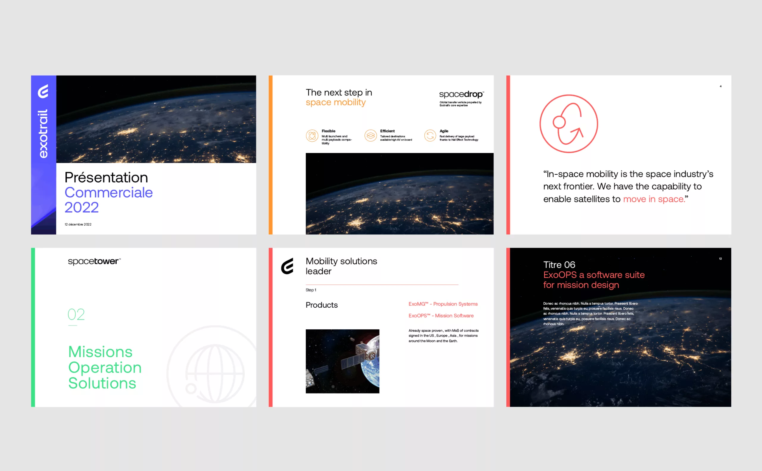 Exotrail, fournisseur de mobilité spatiale « end-to-end » ouvre la voie à une nouvelle ère logistique. Depuis sa création, Exotrail a toujours eu l’ambition de devenir leader de la logistique spatiale. Comme sur Terre à la fin du XXe siècle, où les leaders de la logistique sont apparus peu après l’essor du commerce mondialisé ; Exotrail prévoit que l’essor actuel du secteur spatial donnera naissance à un nouveau monde de mobilité dans l’espace. Graphéine a travaillé avec Exotrail à l’évolution de son identité visuelle. Nous avons conçu un nouveau logotype et repensé l’architecture de marque produits et services, dotant ainsi Exotrail d’une charte graphique complète.
