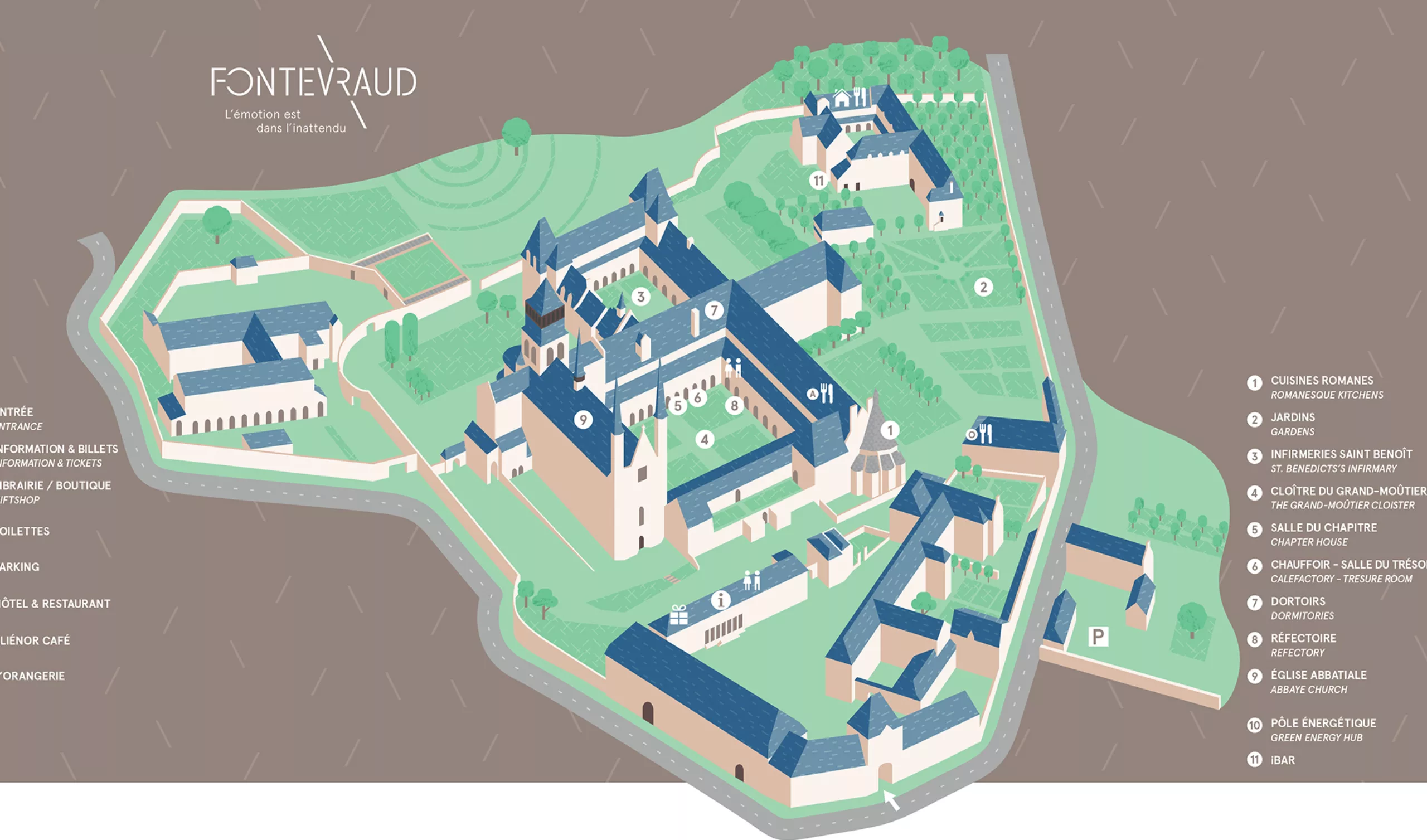 Installés à différents endroits du domaine, sur des écrans orientés parfois à l’horizontale, parfois à la verticale, ils constituent à la fois la nouvelle signalétique et l’audioguide de l’expérience Fontevraud. Dans un graphisme sobre et respectueux de l’architecture environnante, visuels d’archives, pictogrammes et illustrations de data-visualisation se mêlent afin de fournir aux visiteurs les informations clés.