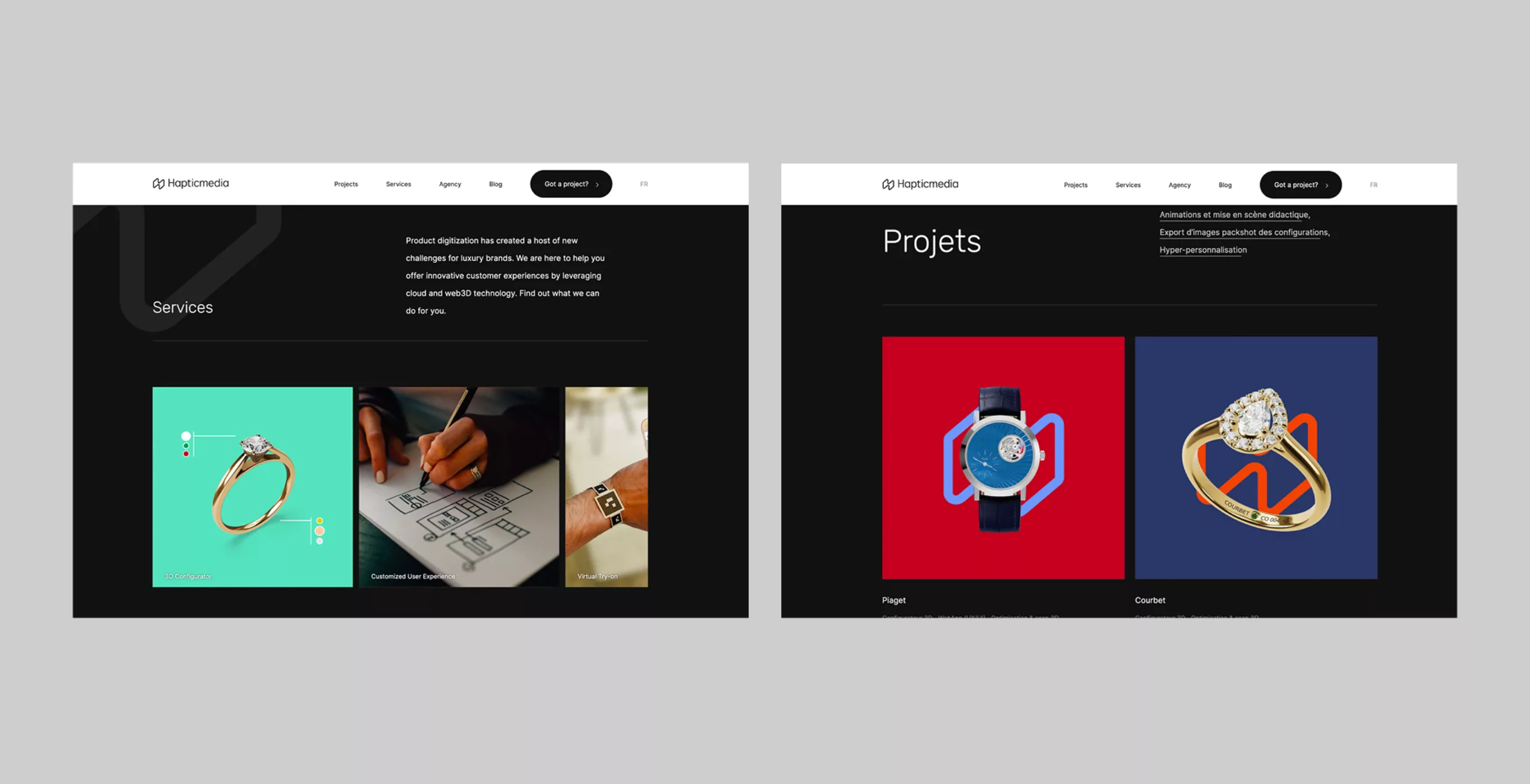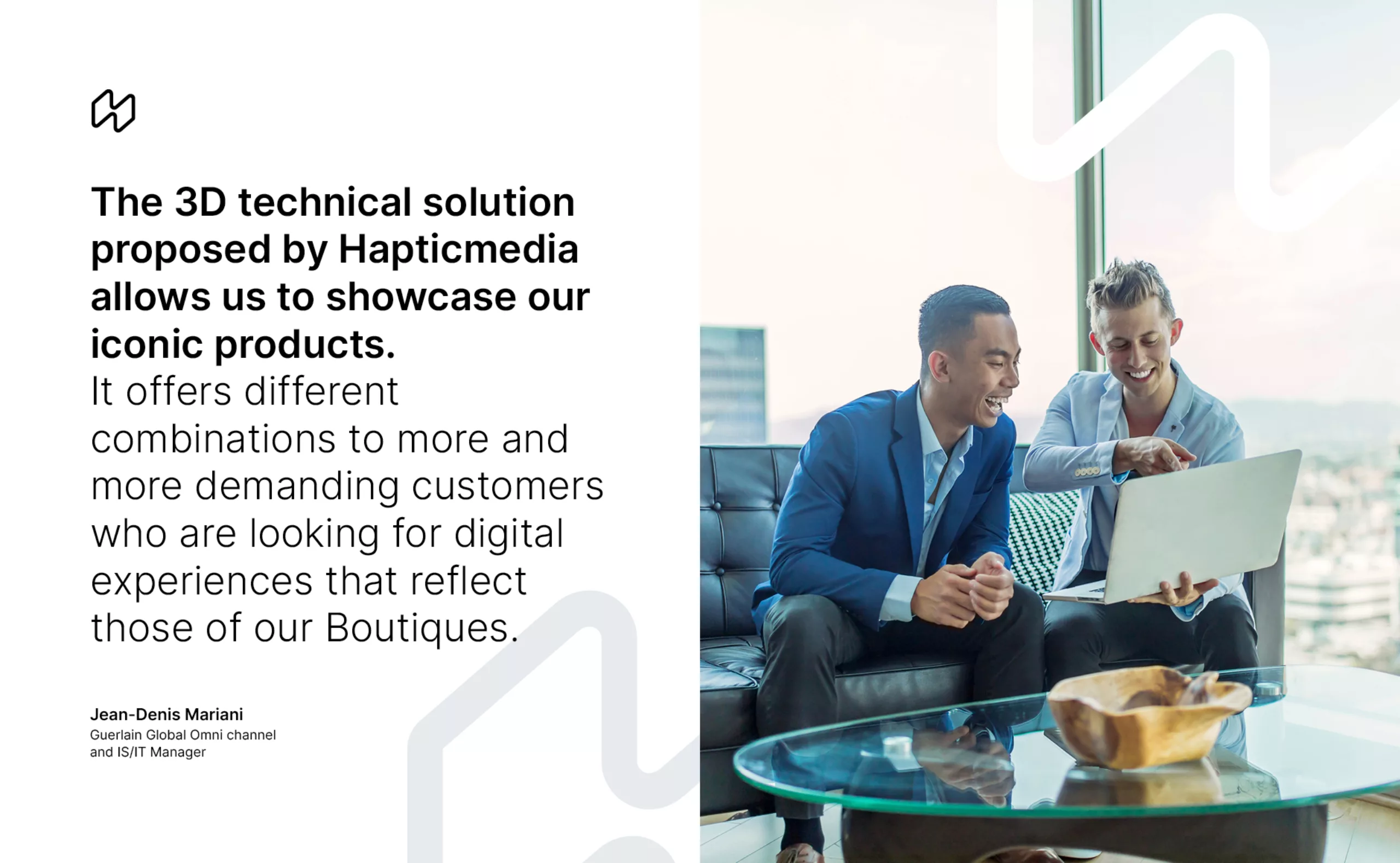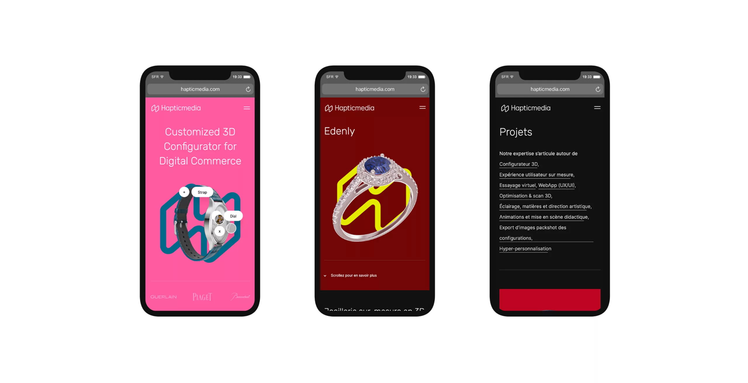 Créée en 2014, Hapticmedia est une agence spécialisée dans la création de configurateur 3D haut de gamme pour le commerce connecté. Cette nouvelle expérience client permet de mieux voir, d’essayer, de personnaliser, et d’afficher des informations sur les produits. Depuis 2018, Hapticmedia est accélérée par LVMH ce qui permet à l’agence de développer un savoir-faire spécifique pour les marques d’horlogerie, de bijouterie, de parfumerie et de maroquinerie.