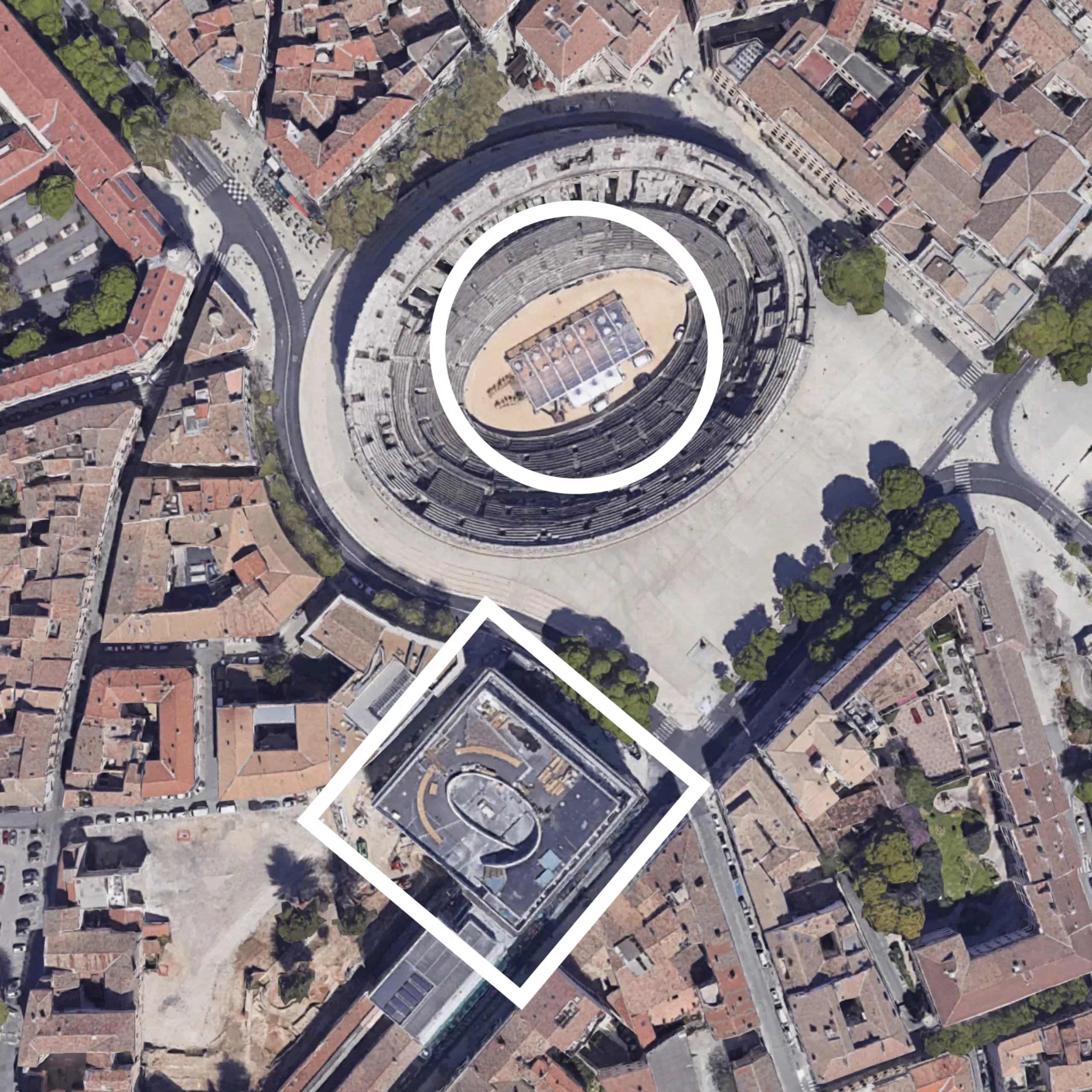 Lancé en juin 2011, le jury du concours architectural retient le projet d’Elizabeth de Portzamparc. Face aux Arènes nîmoises, le Musée engage un véritable dialogue architectural entre les deux bâtiments que séparent 2000 ans d’histoire. Les deux bâtiments s’opposent et se complètent harmonieusement par leurs formes, leurs lignes et leurs masses : le rond et le rectangle, le vertical et l’horizontal, la densité de la pierre et la légèreté du verre.