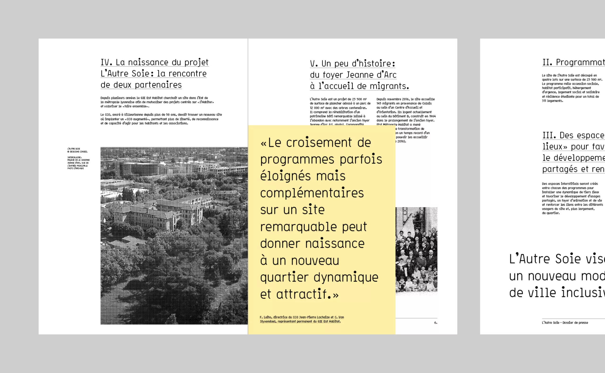 L’ambition est de faire de l’Autre Soie un lieu créatif et attractif de l’agglomération, avec une implication citoyenne forte. Chacun, dans sa diversité, pourra trouver sa place et disposer d’un environnement social, culturel et économique qui contribue au développement de sa capacité d’agir. Le projet est porté par un groupement d’intérêt économique composé d’Alynea, d’Aralis, d’Est Métropole Habitat (EMH) et de Rhône Saône Habitat (RSH). Ils sont aussi accompagnés par le CCO, le Centre Culturel de Villeurbanne.