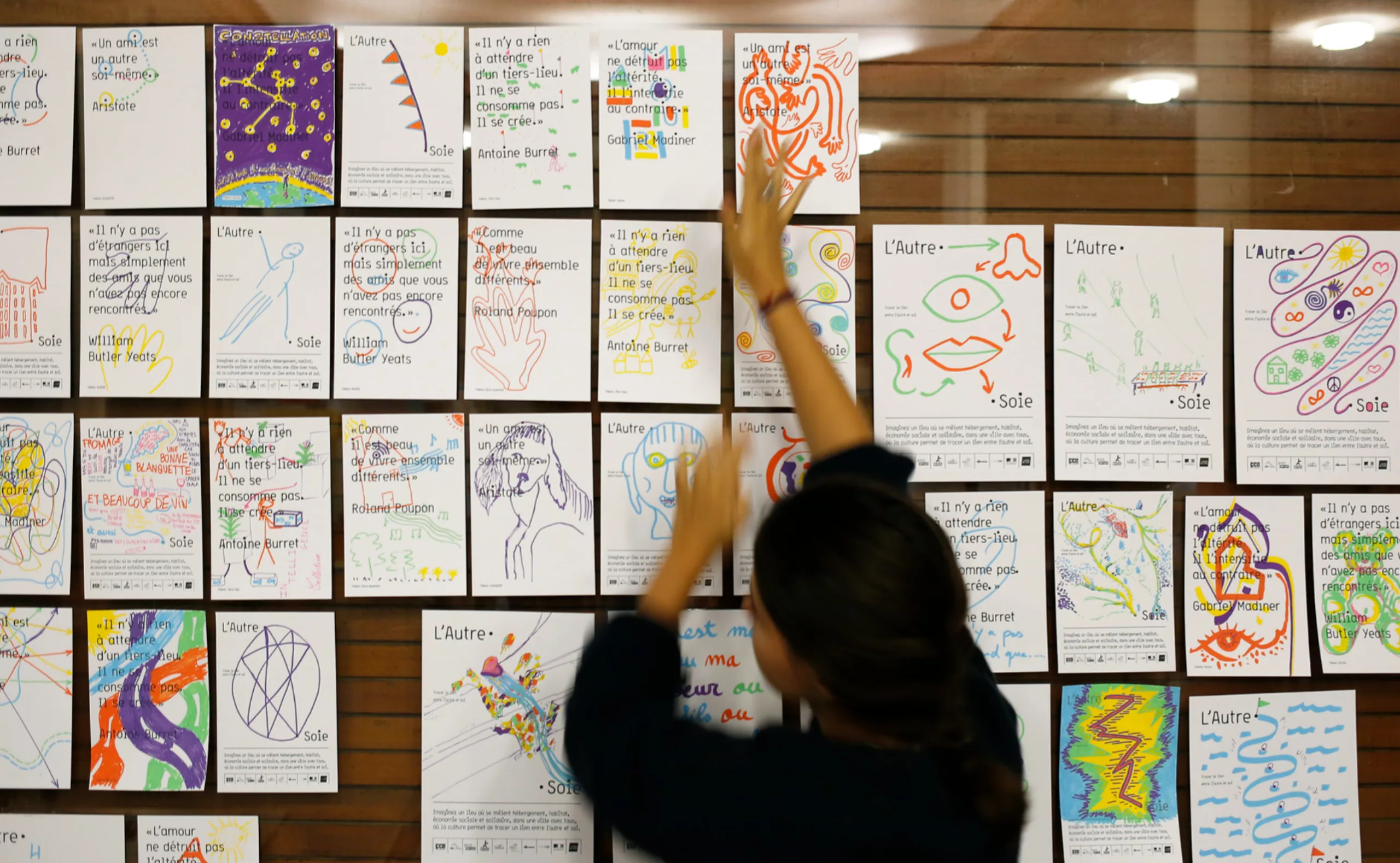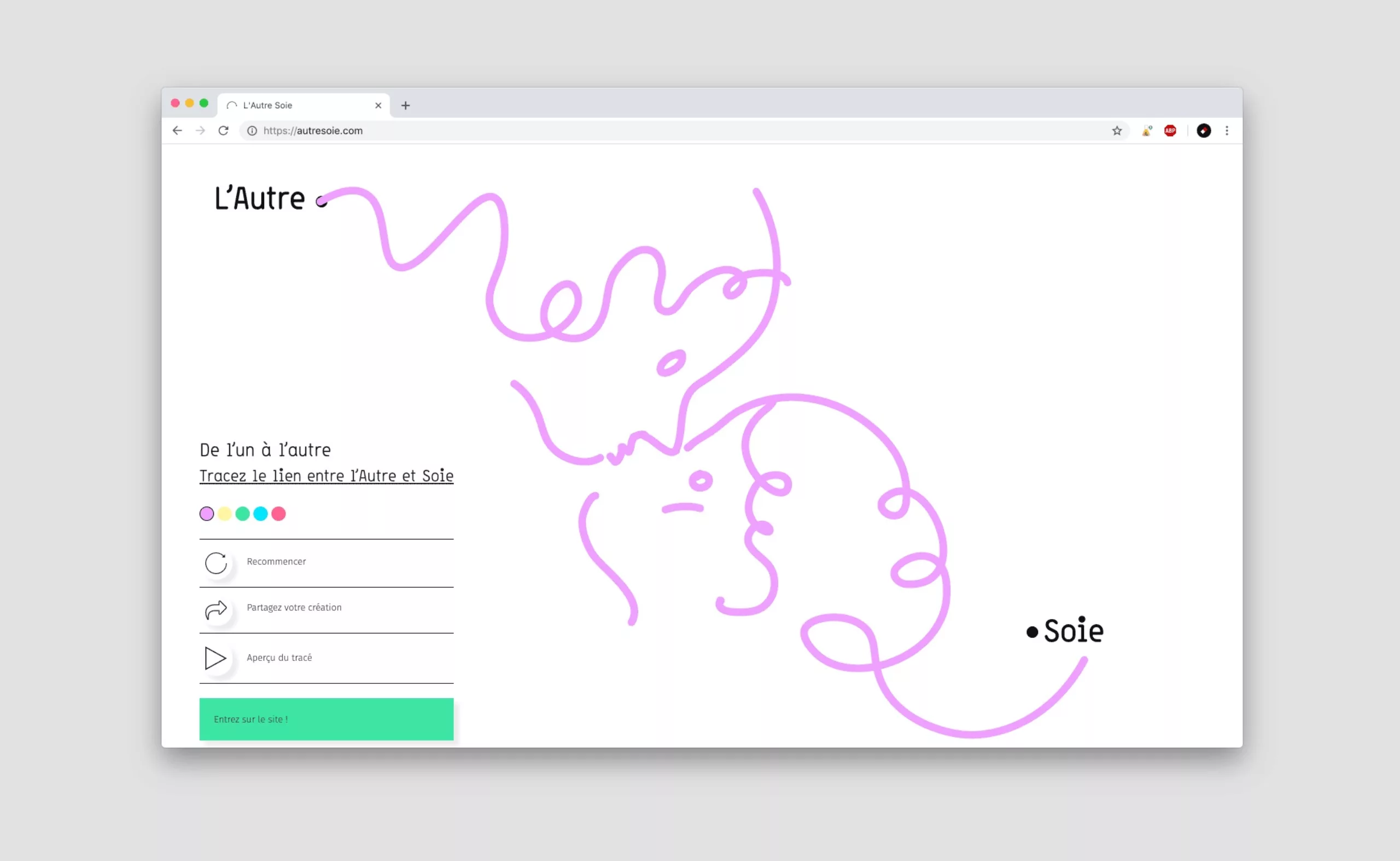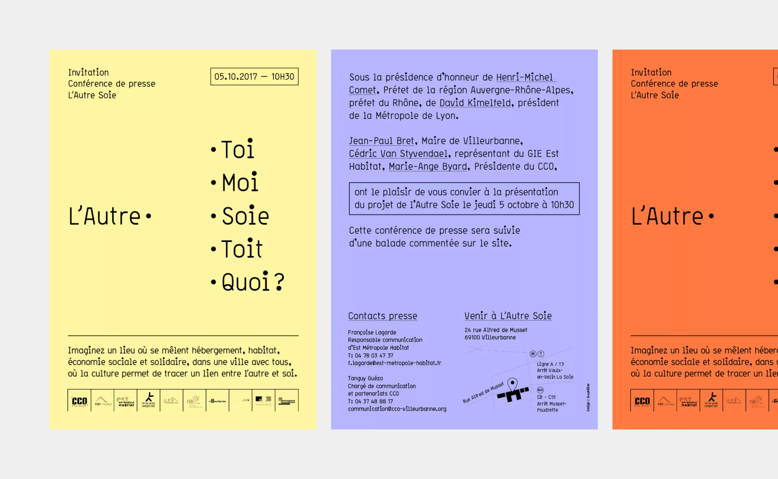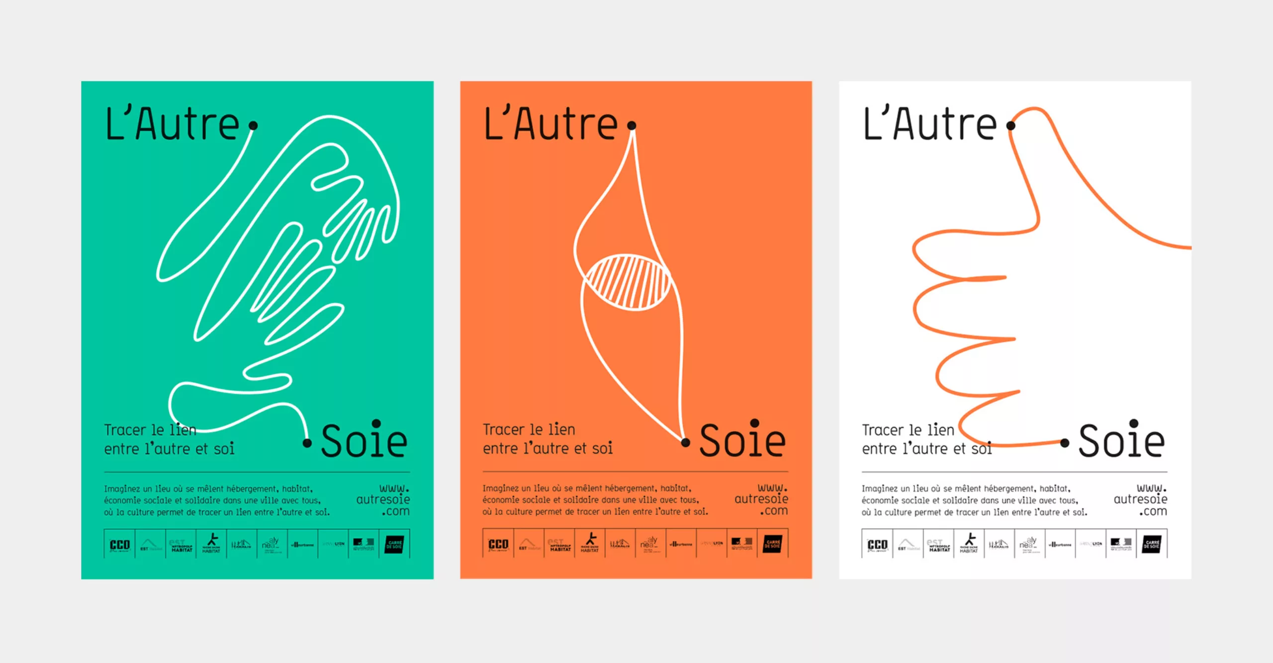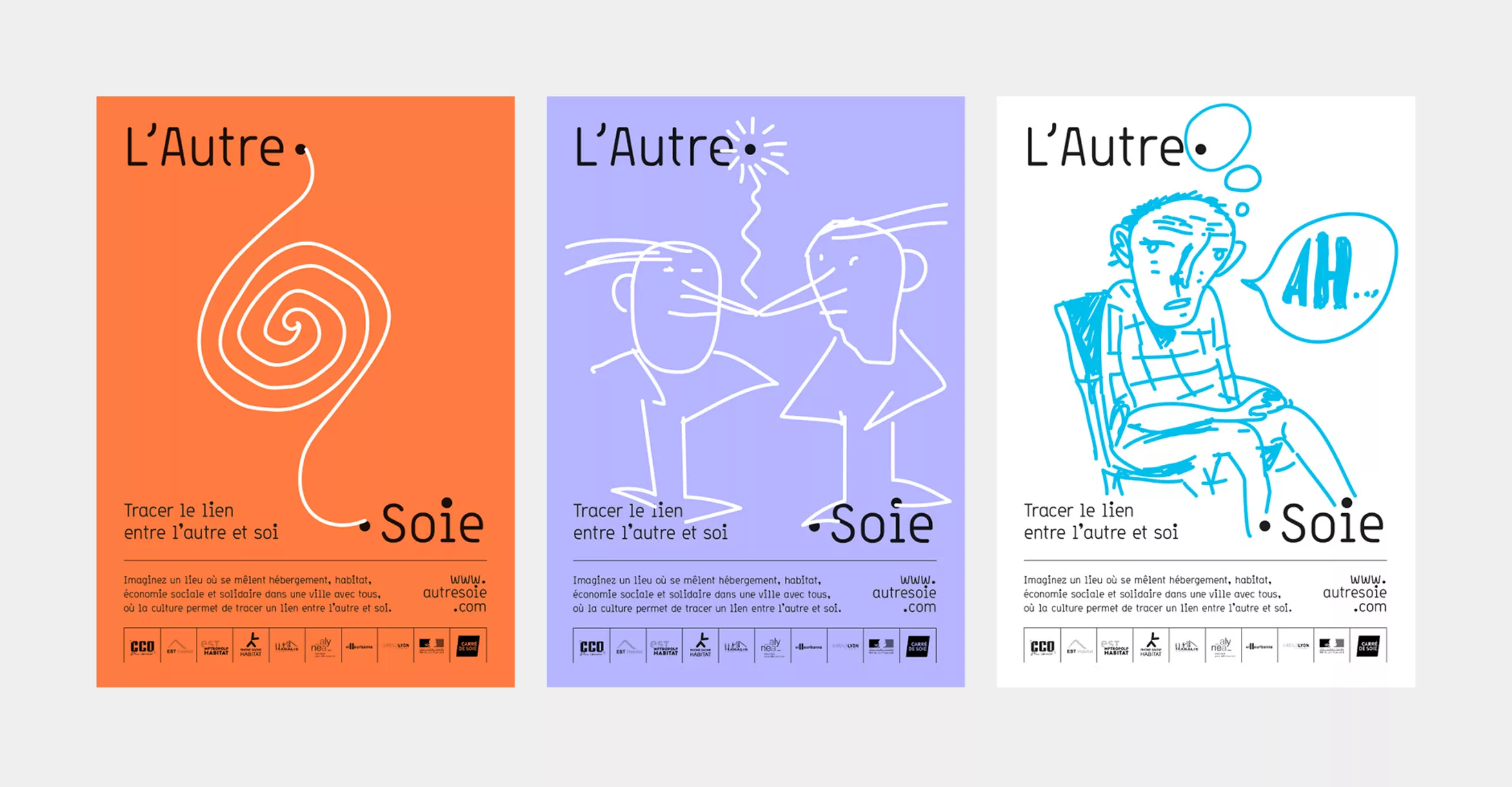 Nous avons imaginé une identité visuelle comme un manifeste. Un manifeste permettant de rendre tangible et concret le lien qui nous lie à l’autre. Une règle du jeu invitant au faire ensemble. Comme une œuvre collective et participative permettant de questionner le principe d’altérité. Un espace d’expression libre, ouvert et en devenir.