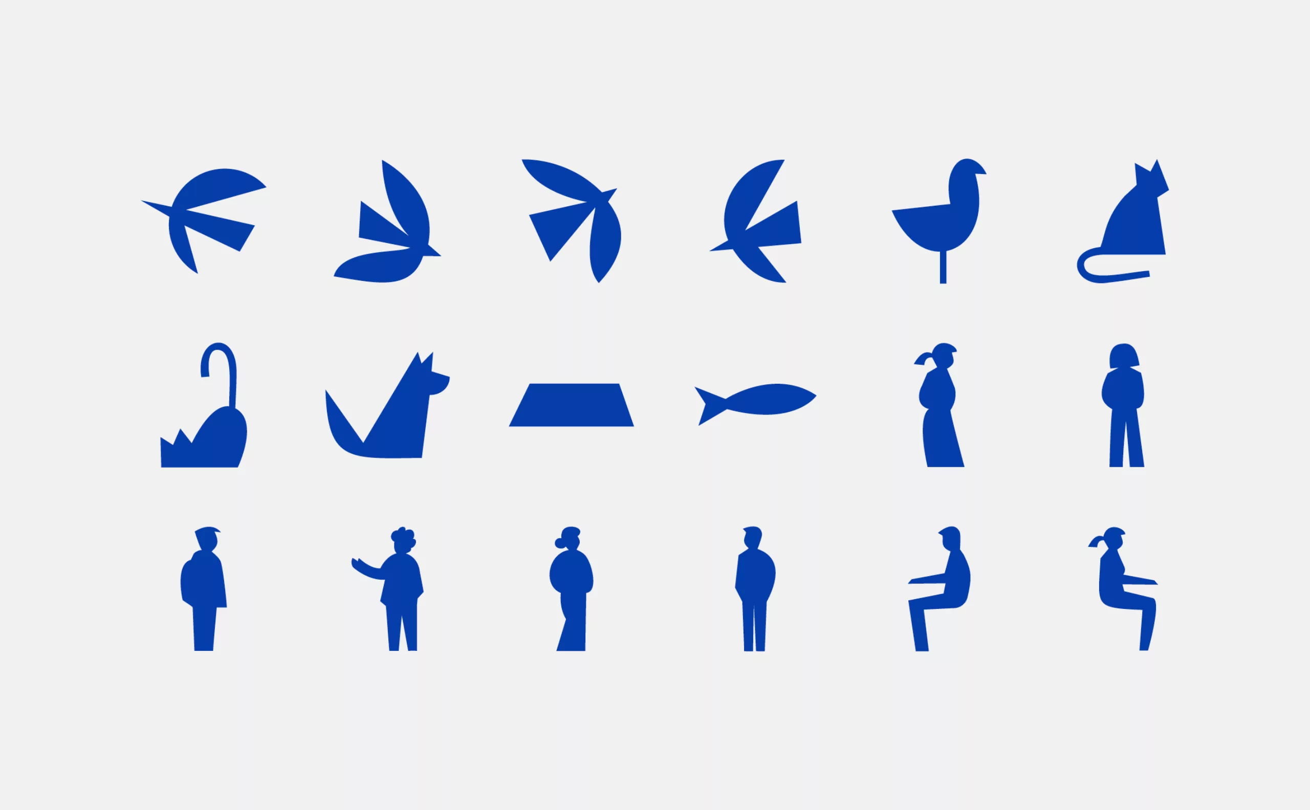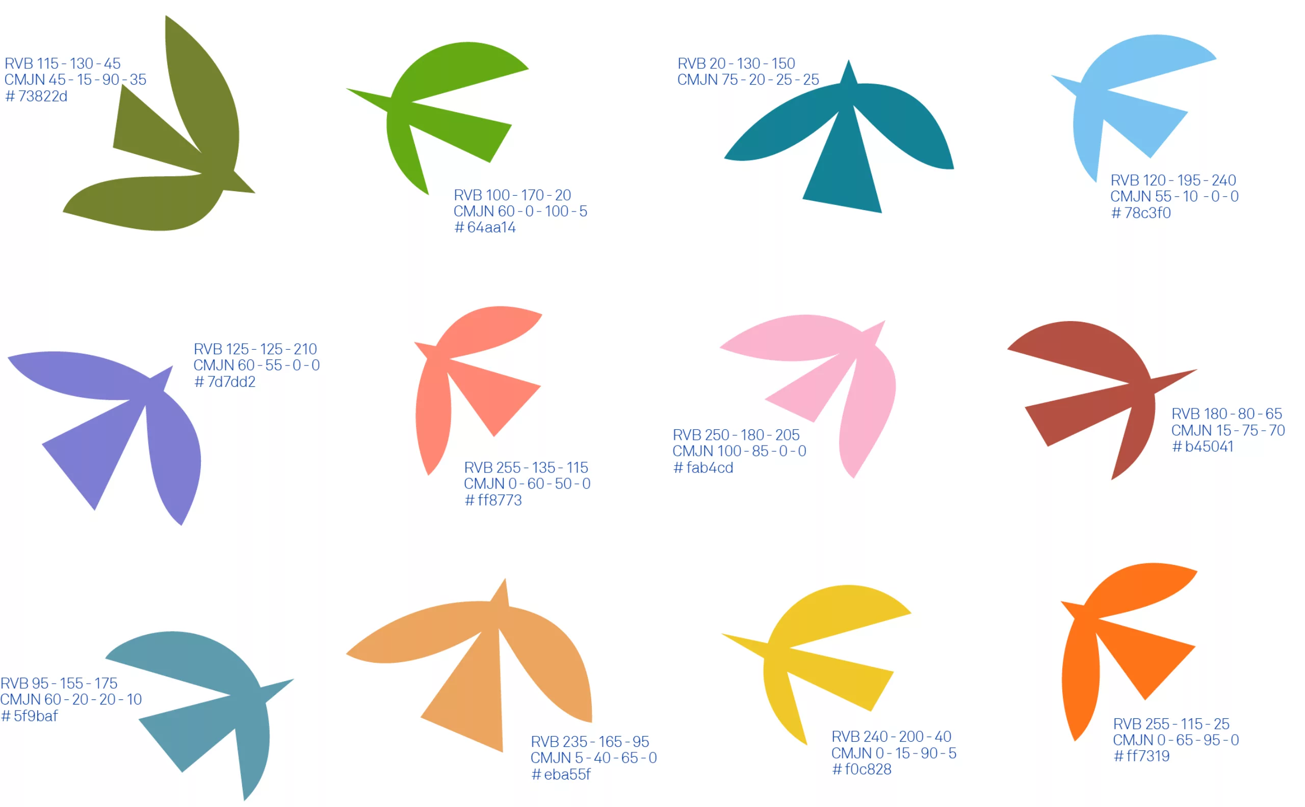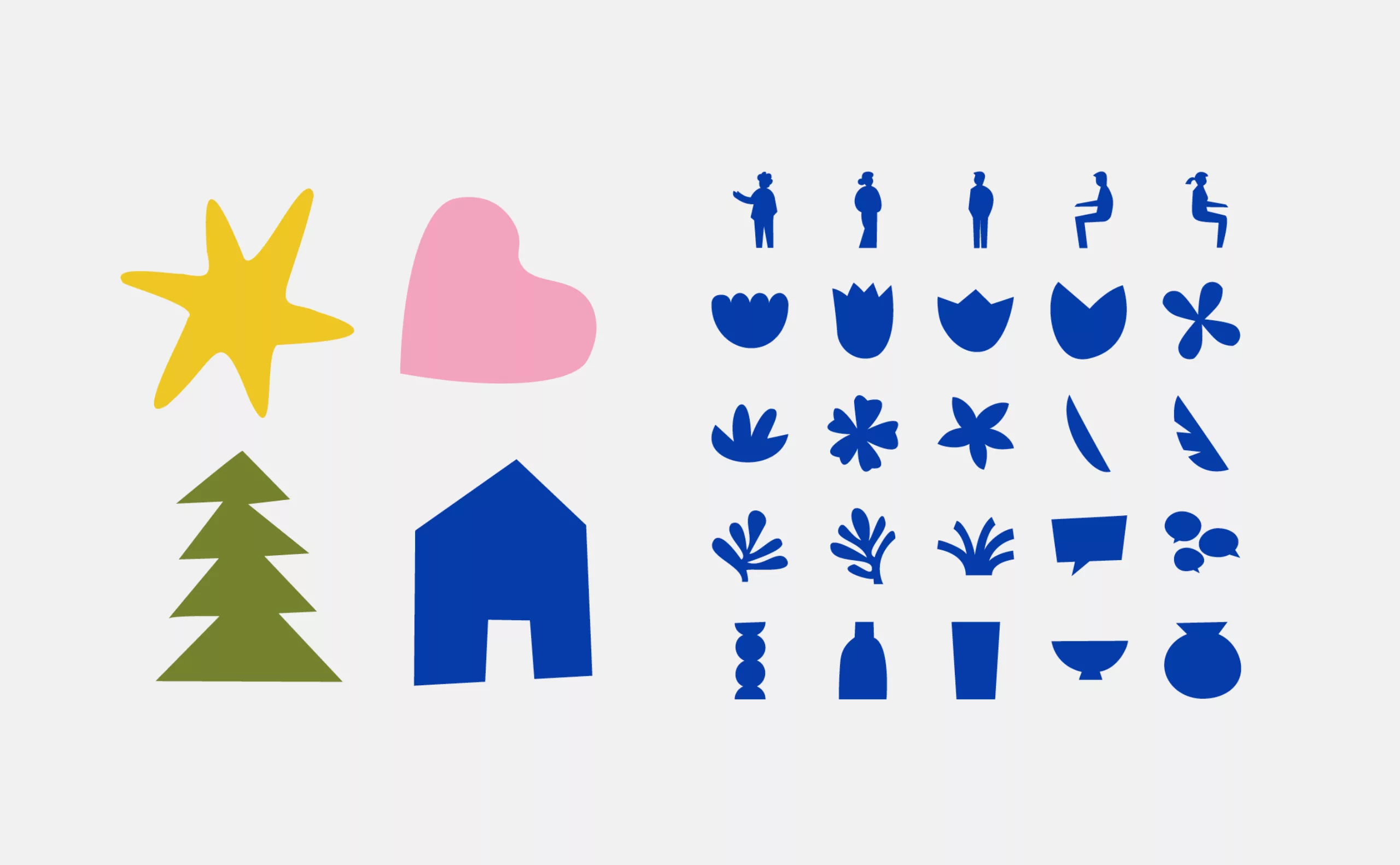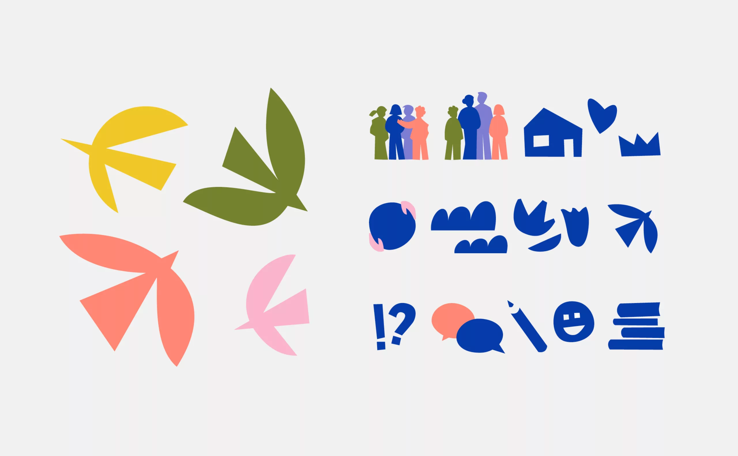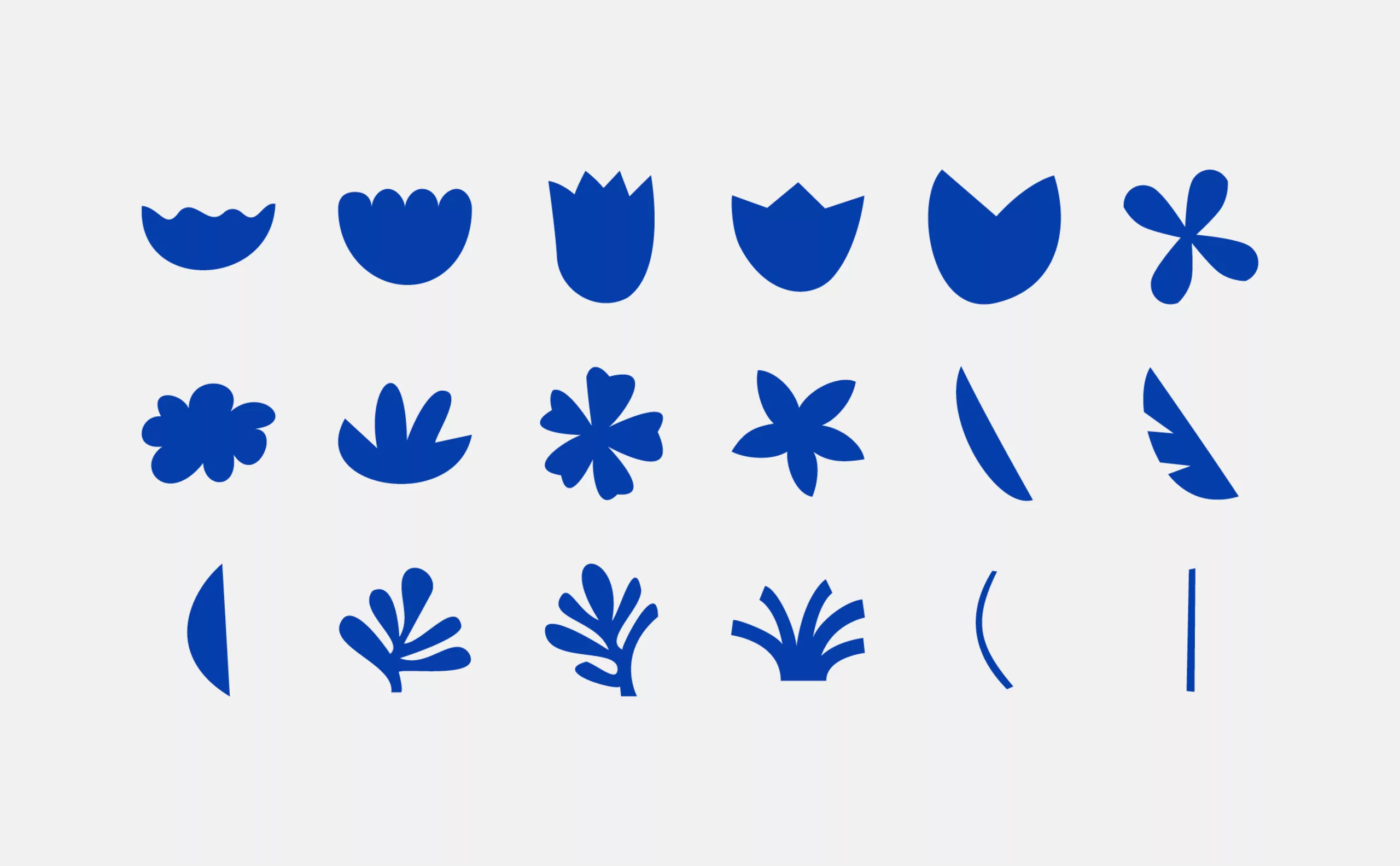 En accompagnement du logo, nous avons développé une gamme de formes et de pictogrammes, dans l’esprit “papier-découpé”. L’idée est d’utiliser ce langage visuel au fil des compositions.