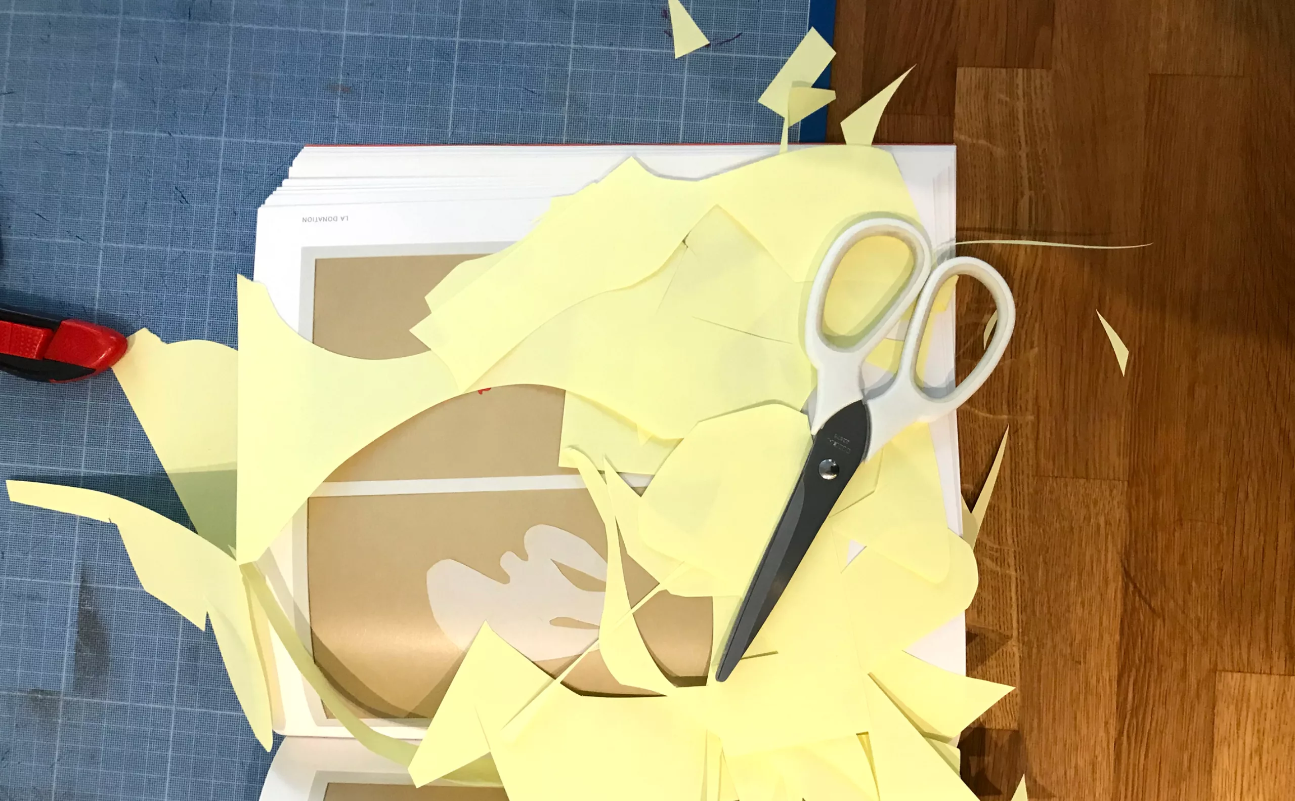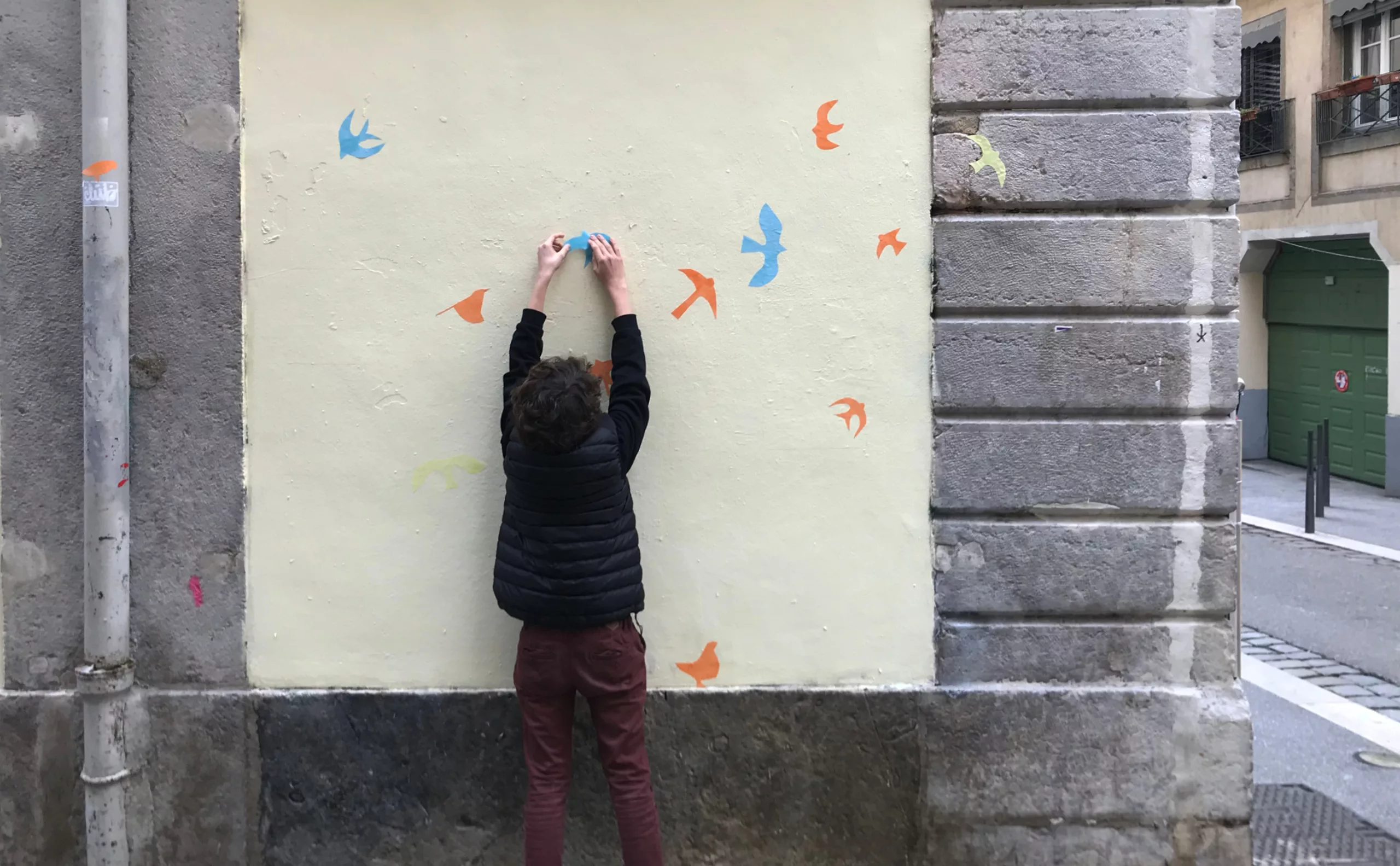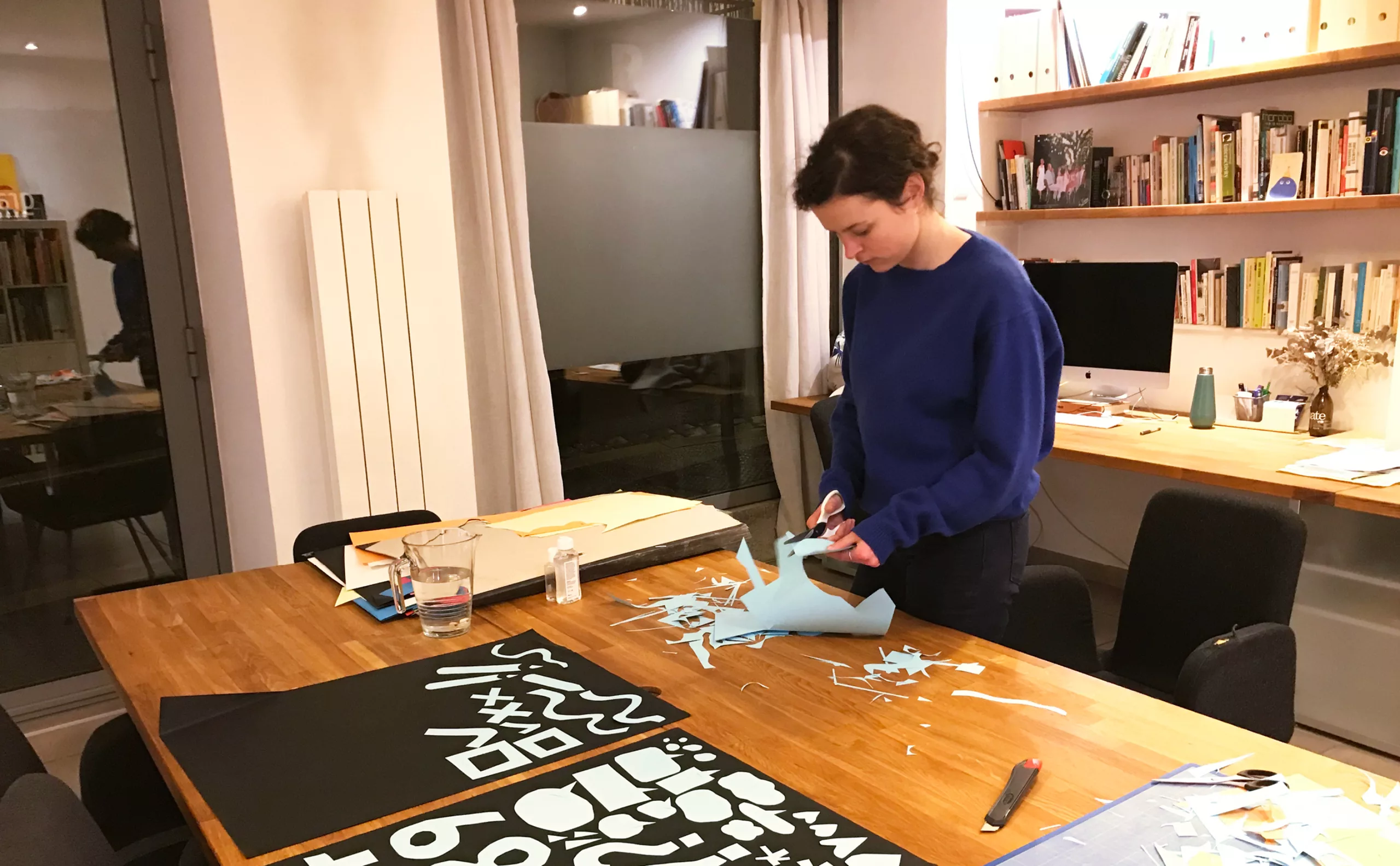 Afin d’enrichir l’univers illustratif, nous nous sommes lancés dans un atelier de papiers découpés. Une façon de quitter l’écran pour revenir à une forme de graphisme artisanal et sensible. Nous en avons profité pour accueillir un jeune stagiaire de 3e et créer un œuvre de street-art éphémère sur les murs du quartier.