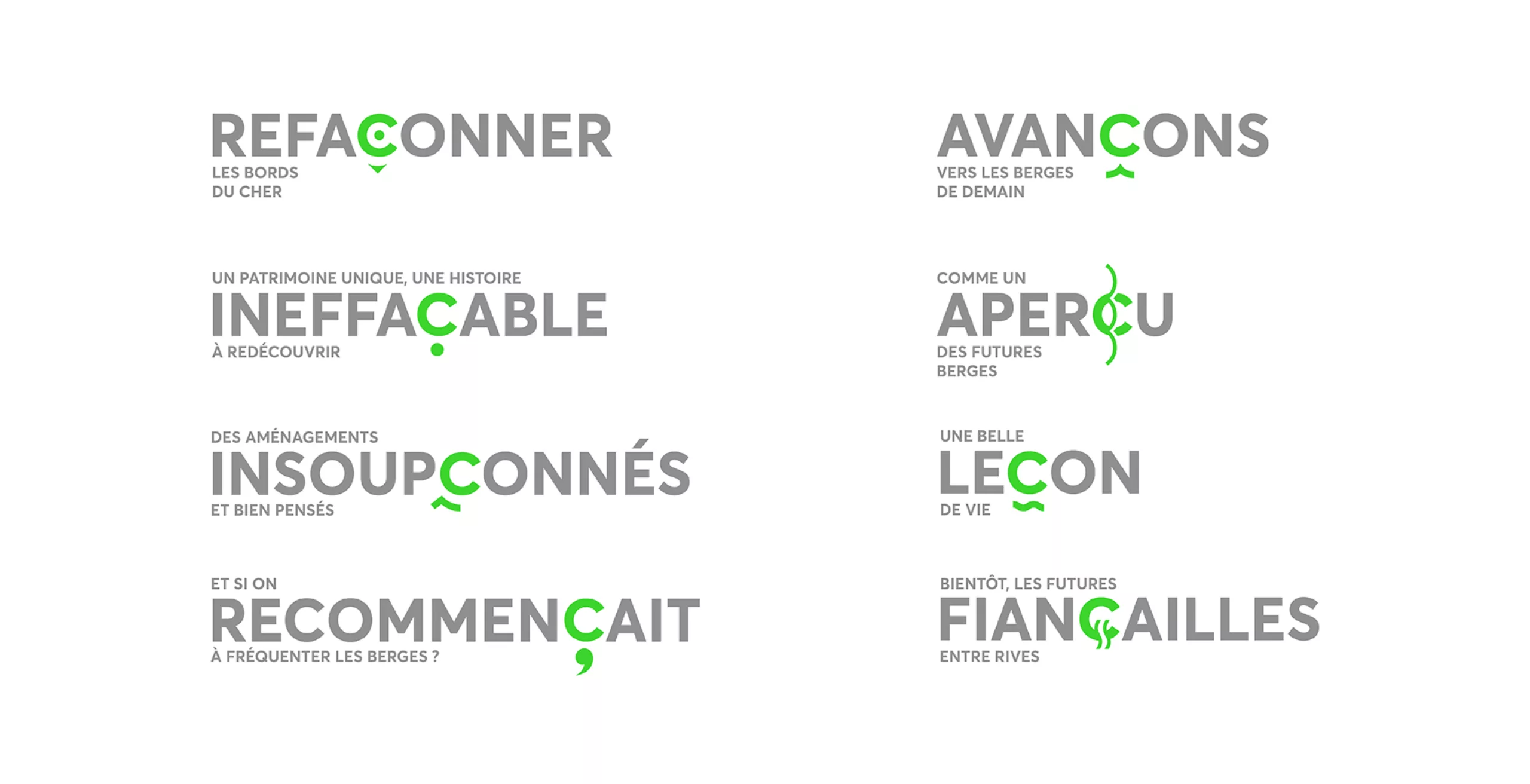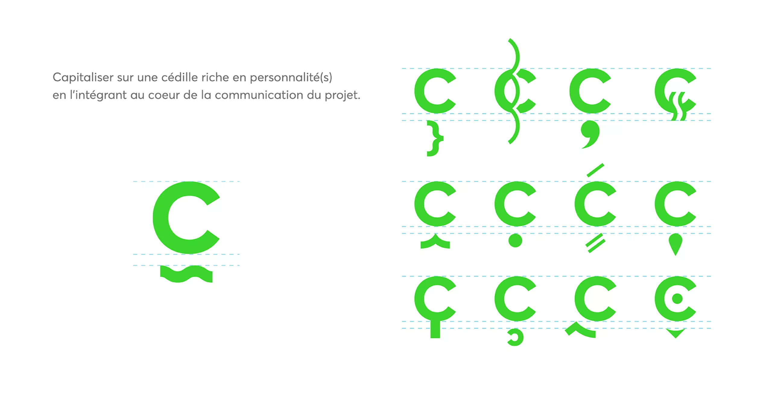 Ainsi la cédille devient l’élément central du dispositif de communication. Elle sera multiple, changeante, vivante, créant une infinité de variations, devenant le motif central de cette identité visuelle. Le choix de la couleur verte, vive et lumineuse, renvoie à l’idée d’une nature vibrante et contemporaine.