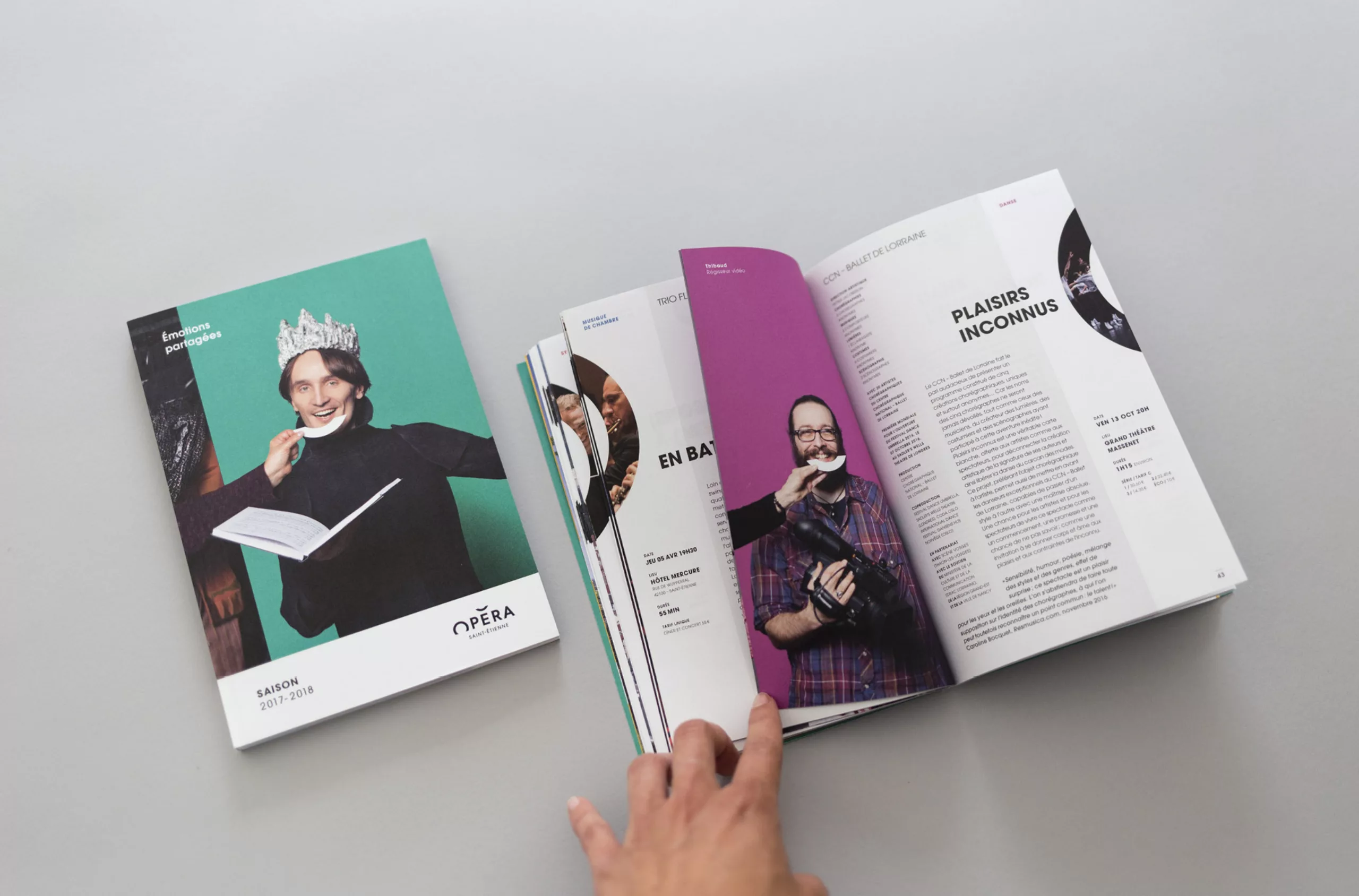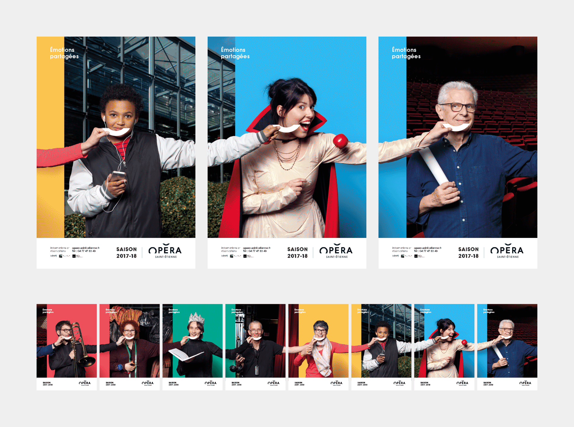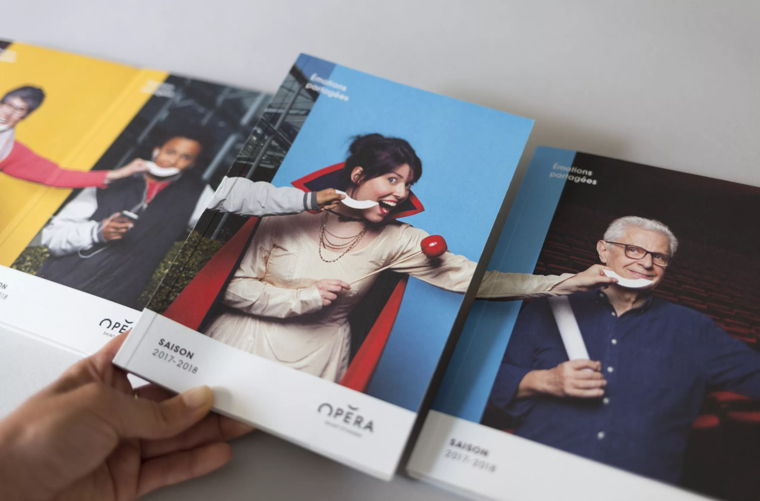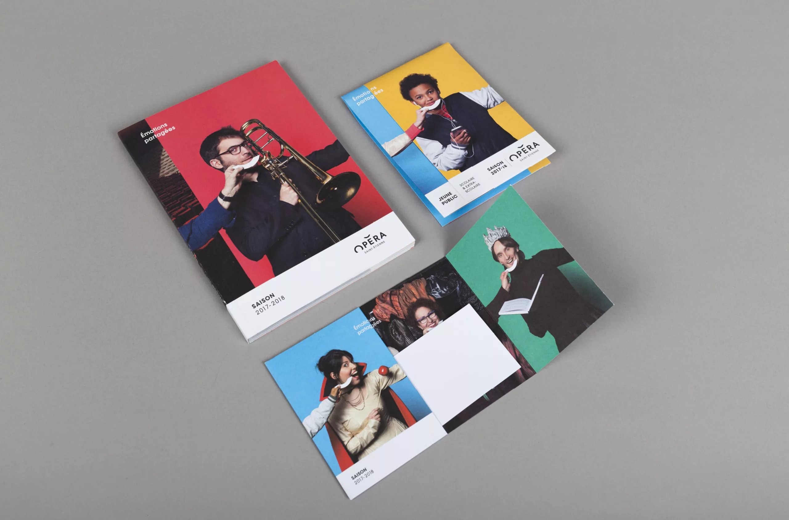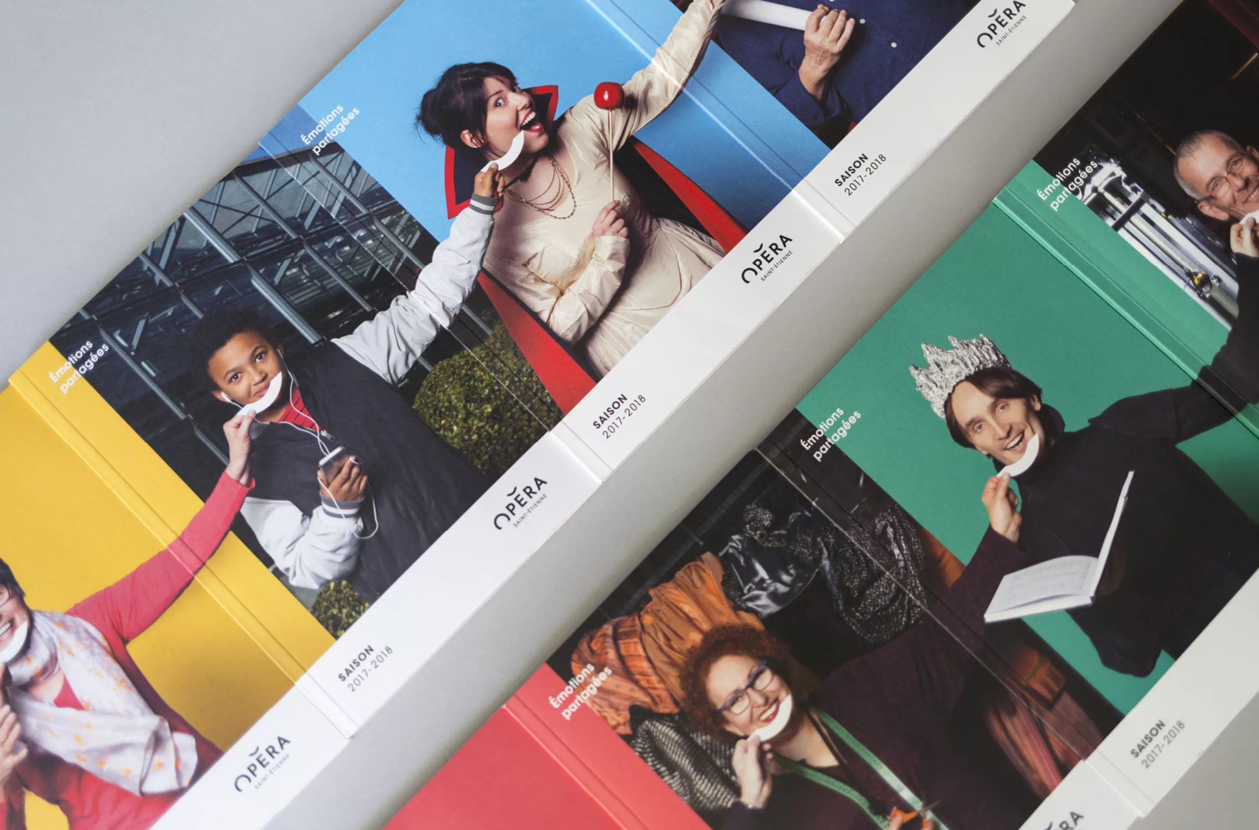 En 2015, nous concevions l’identité visuelle de l’opéra. Un logo typographique décrivant autant le bâtiment (avec son accent en forme de pagode) que la mission de cet opéra (accueillir et divertir tous les publics). Au fur et à mesure des saisons, le challenge était de poursuivre et renouveler cette histoire. Pour la première édition, nous mettions en avant les agents, puis l’orchestre l’année suivante. En 2017, nous avions décidé de mélanger les agents, les musiciens et les publics !