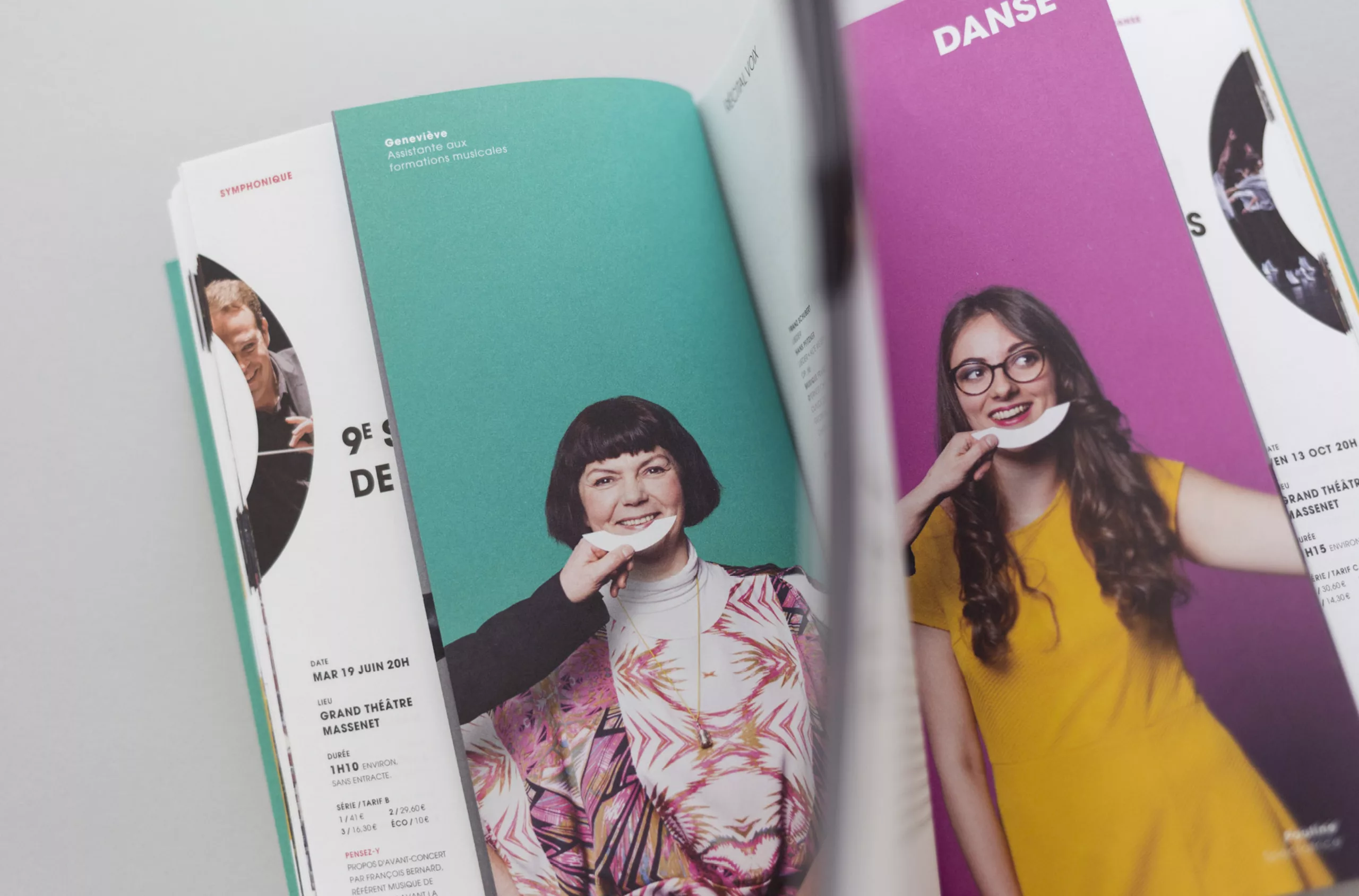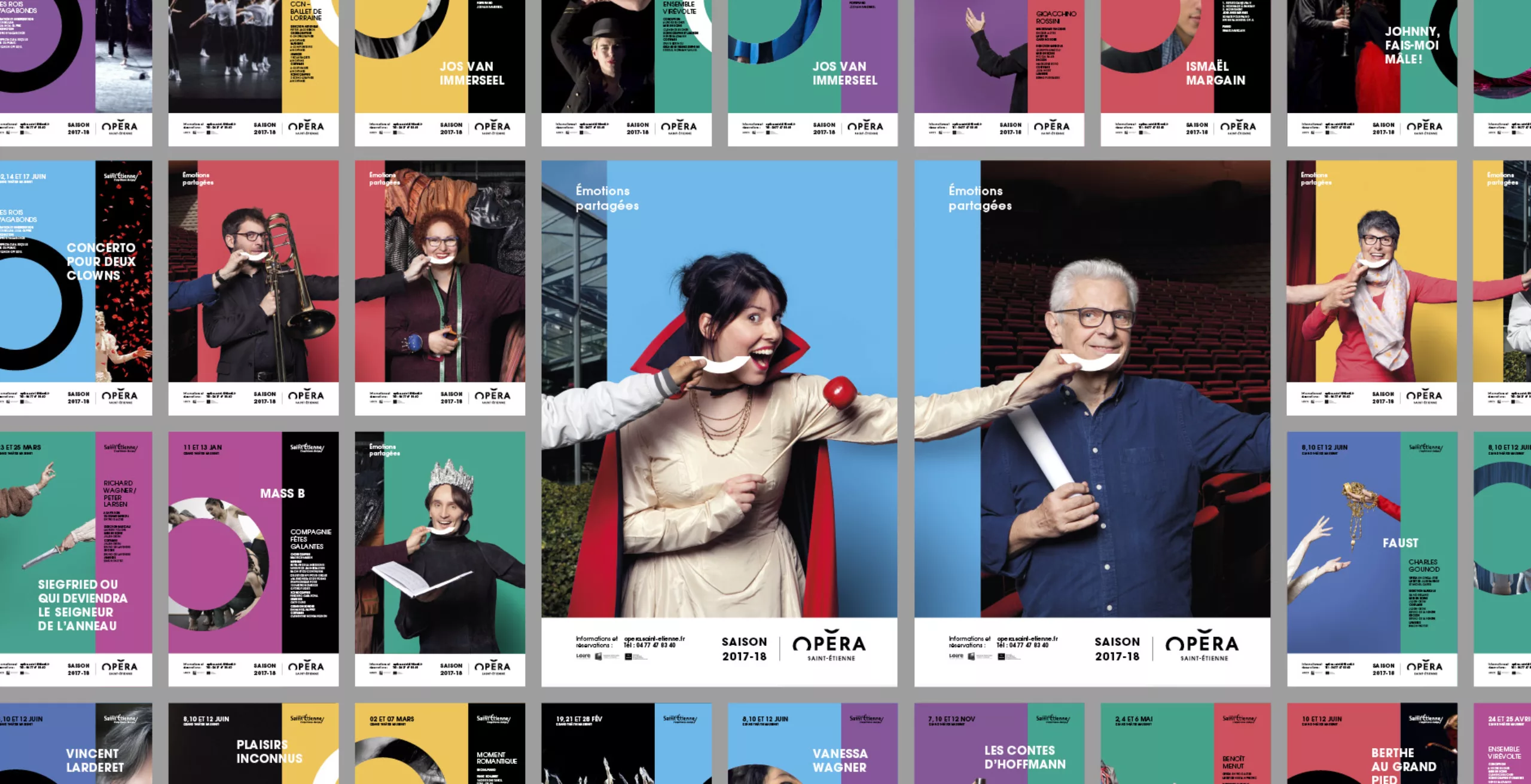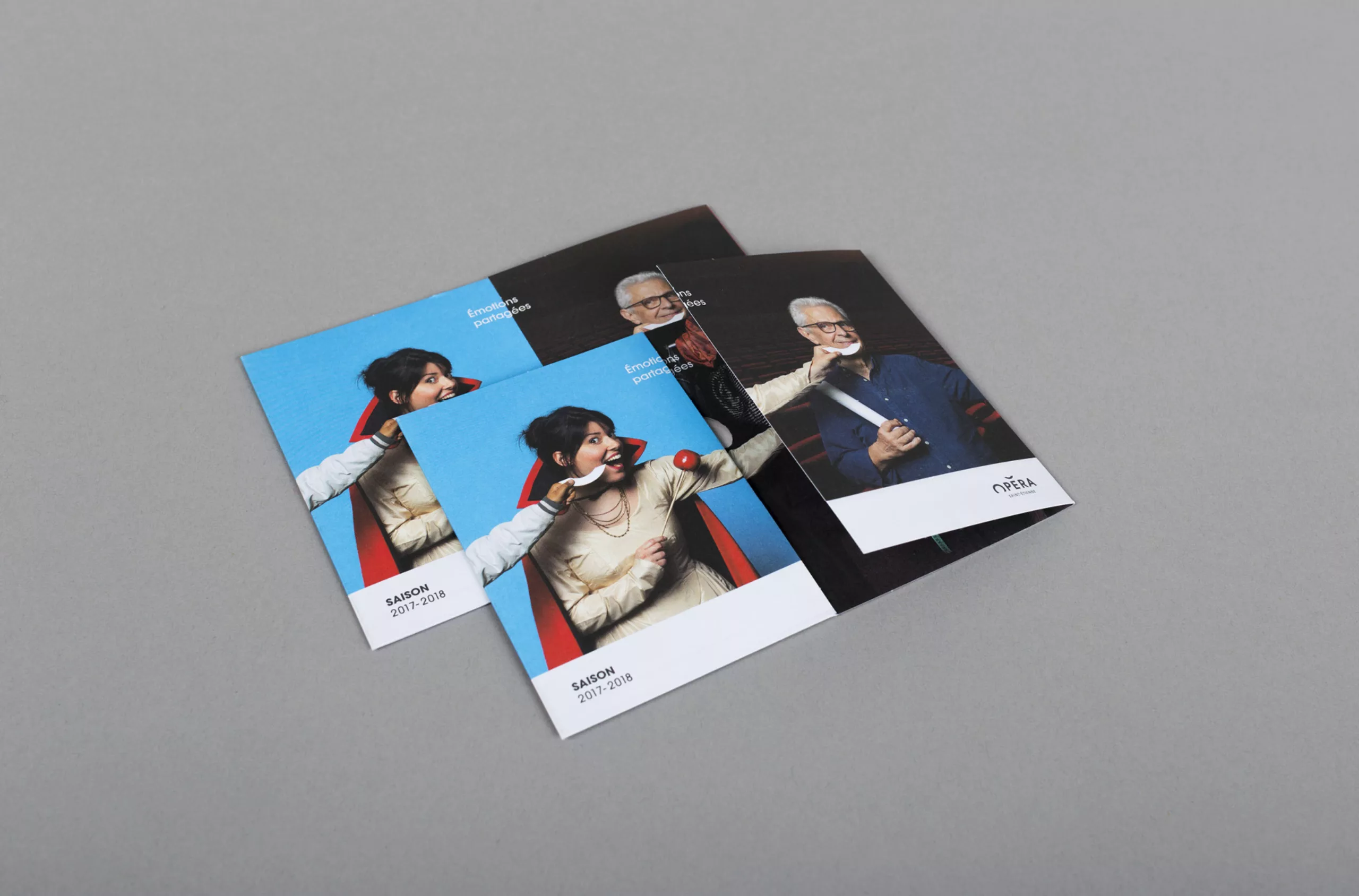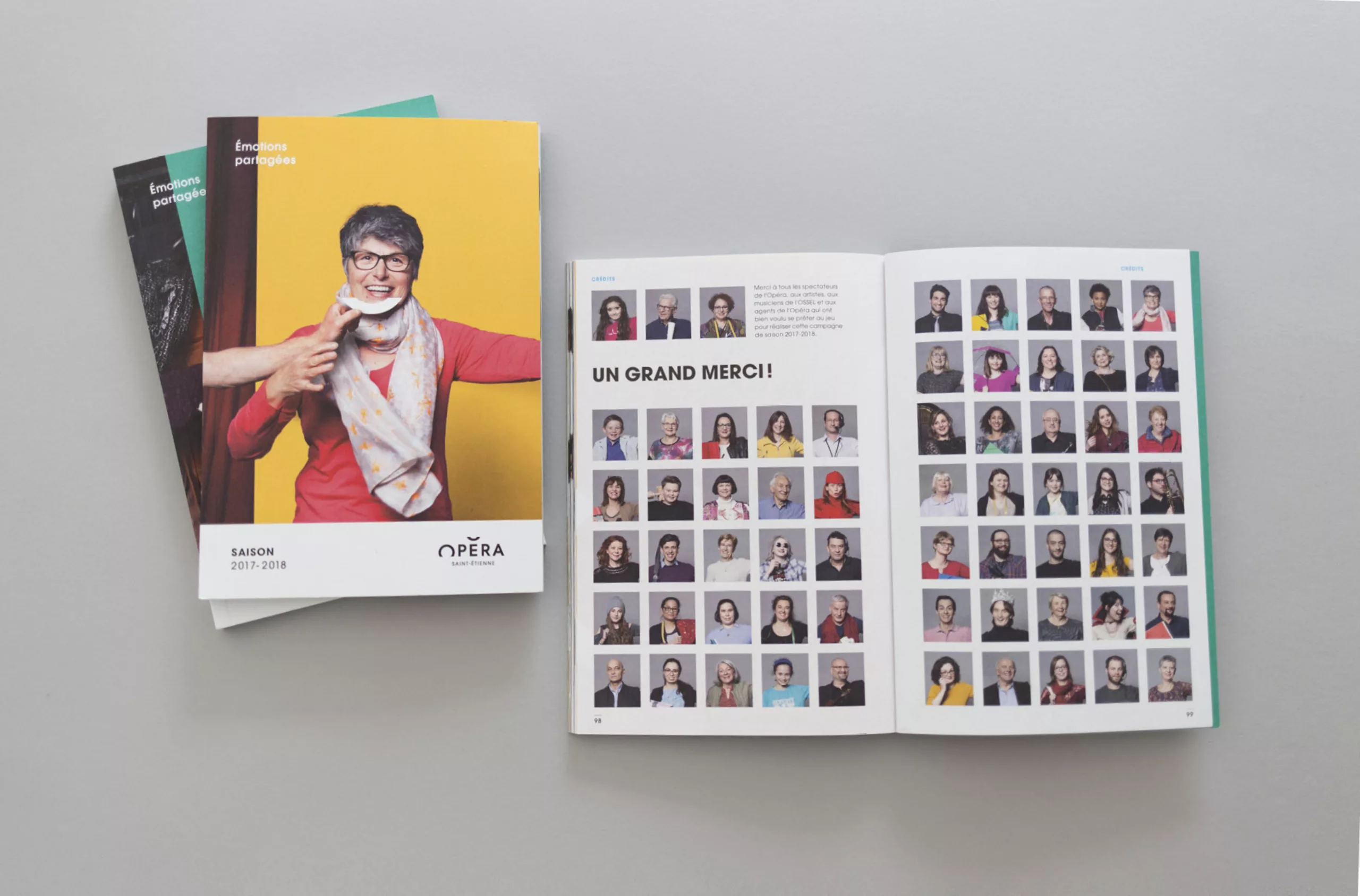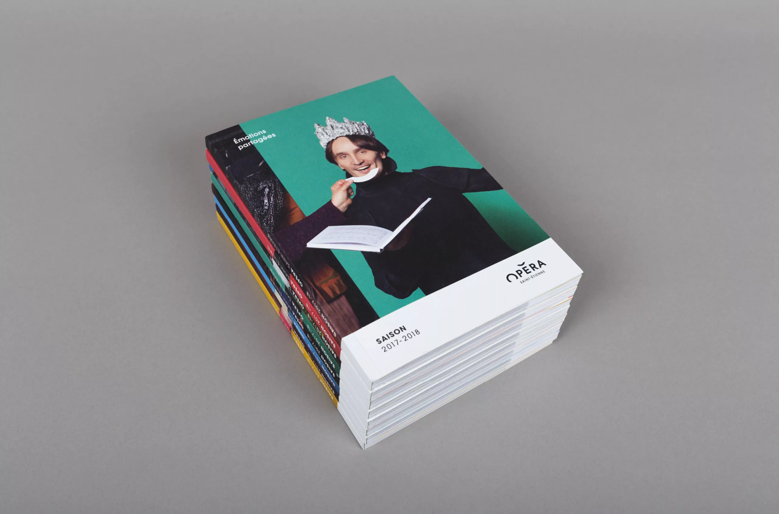 En 2015, nous concevions l’identité visuelle de l’opéra. Un logo typographique décrivant autant le bâtiment (avec son accent en forme de pagode) que la mission de cet opéra (accueillir et divertir tous les publics). Au fur et à mesure des saisons, le challenge était de poursuivre et renouveler cette histoire. Pour la première édition, nous mettions en avant les agents, puis l’orchestre l’année suivante. En 2017, nous avions décidé de mélanger les agents, les musiciens et les publics !