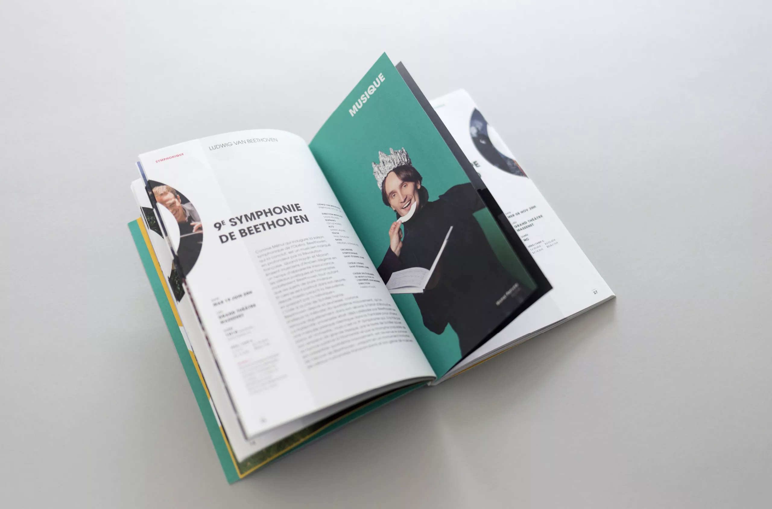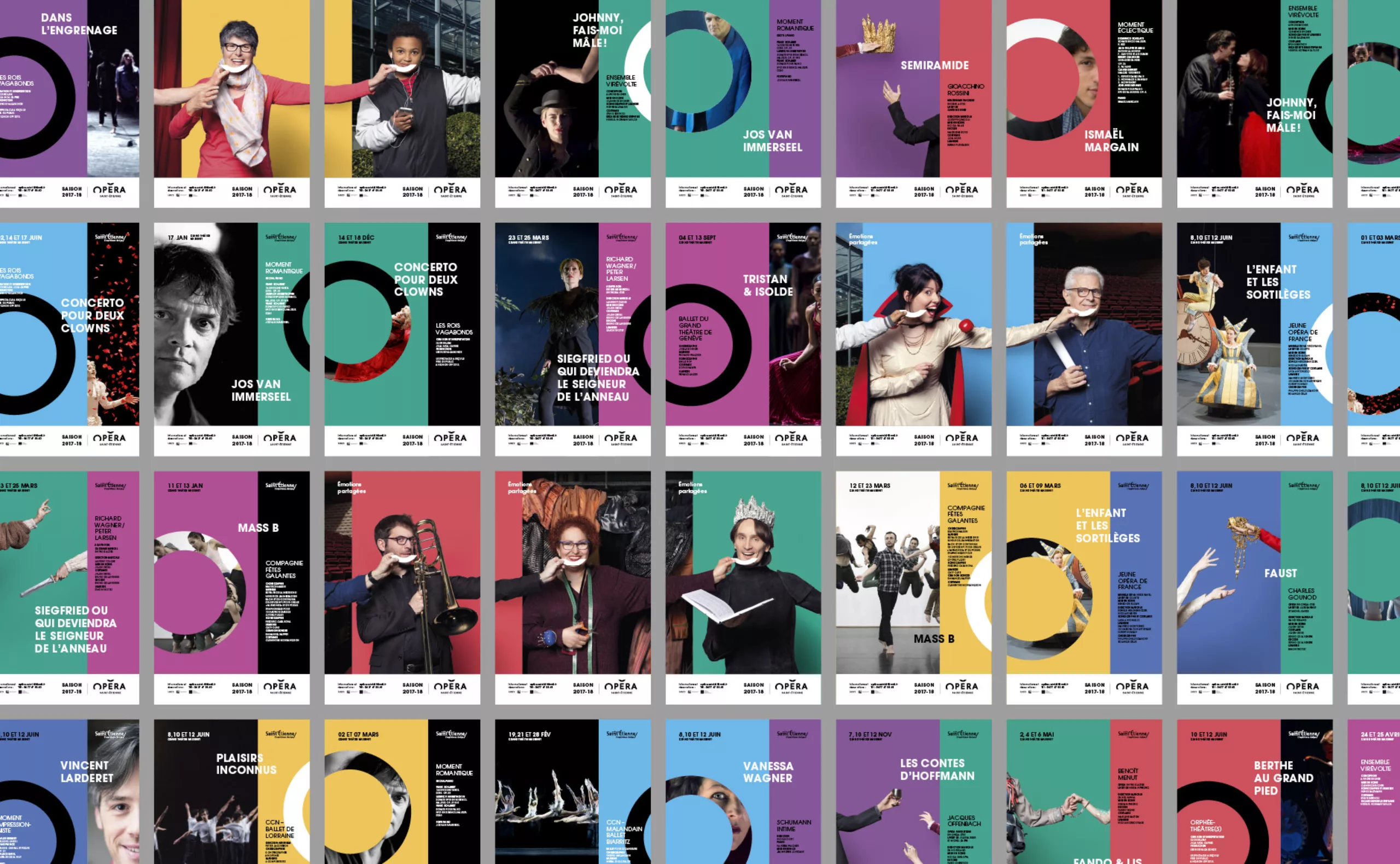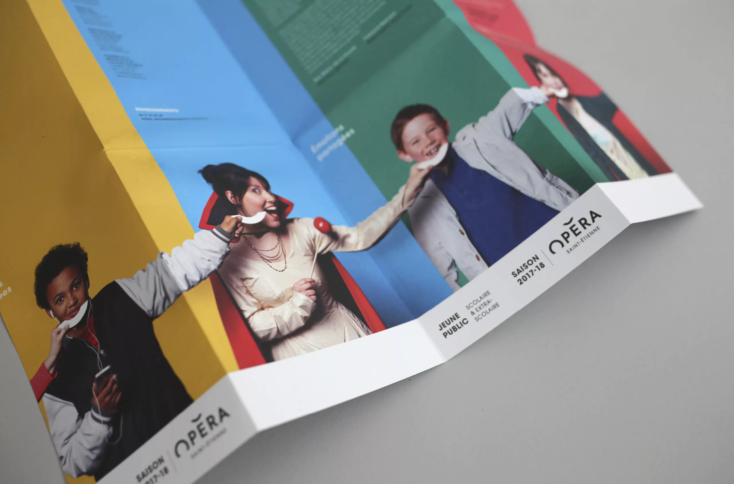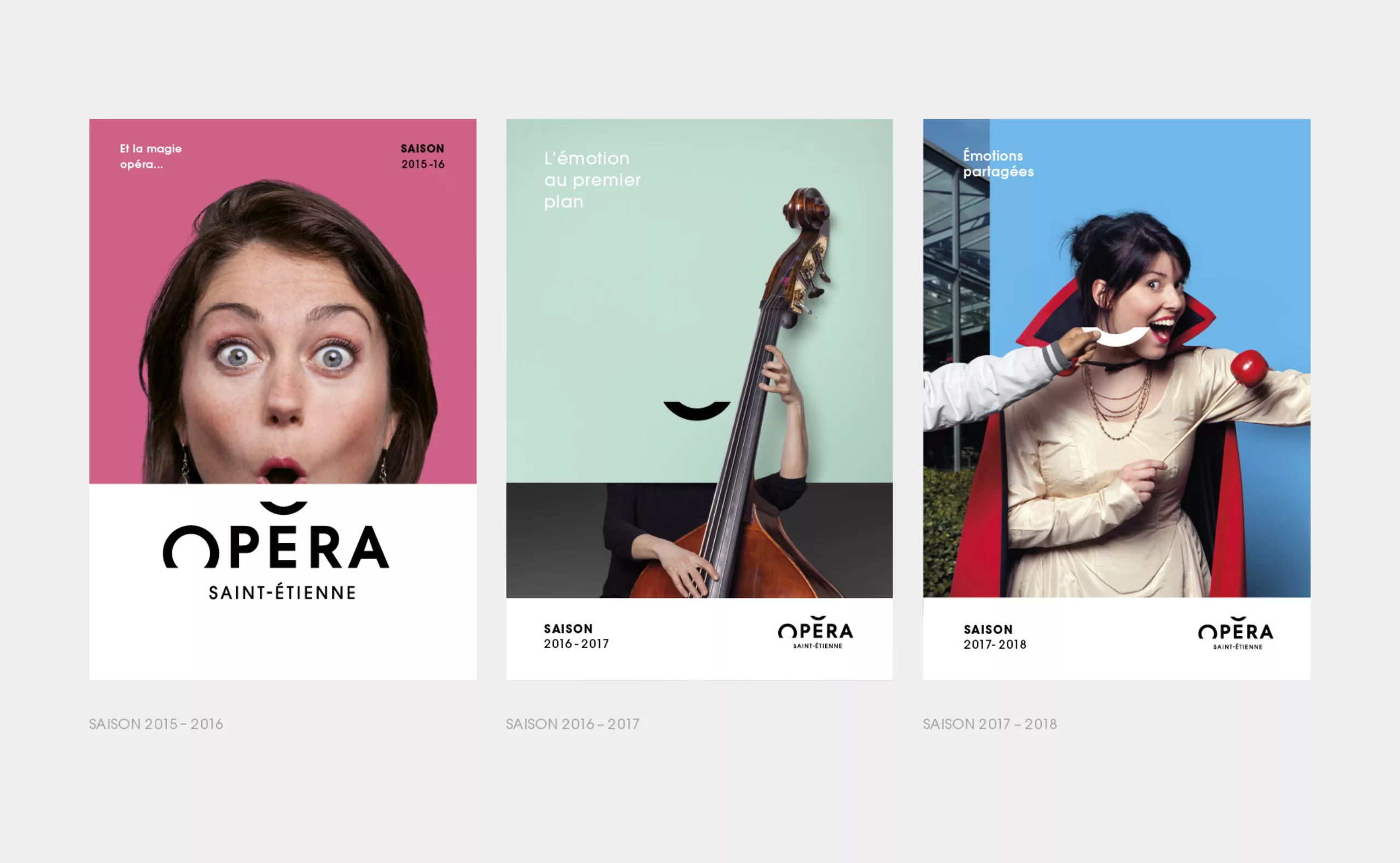 En 2015, nous concevions l’identité visuelle de l’opéra. Un logo typographique décrivant autant le bâtiment (avec son accent en forme de pagode) que la mission de cet opéra (accueillir et divertir tous les publics). Au fur et à mesure des saisons, le challenge était de poursuivre et renouveler cette histoire. Pour la première édition, nous mettions en avant les agents, puis l’orchestre l’année suivante. En 2017, nous avions décidé de mélanger les agents, les musiciens et les publics !