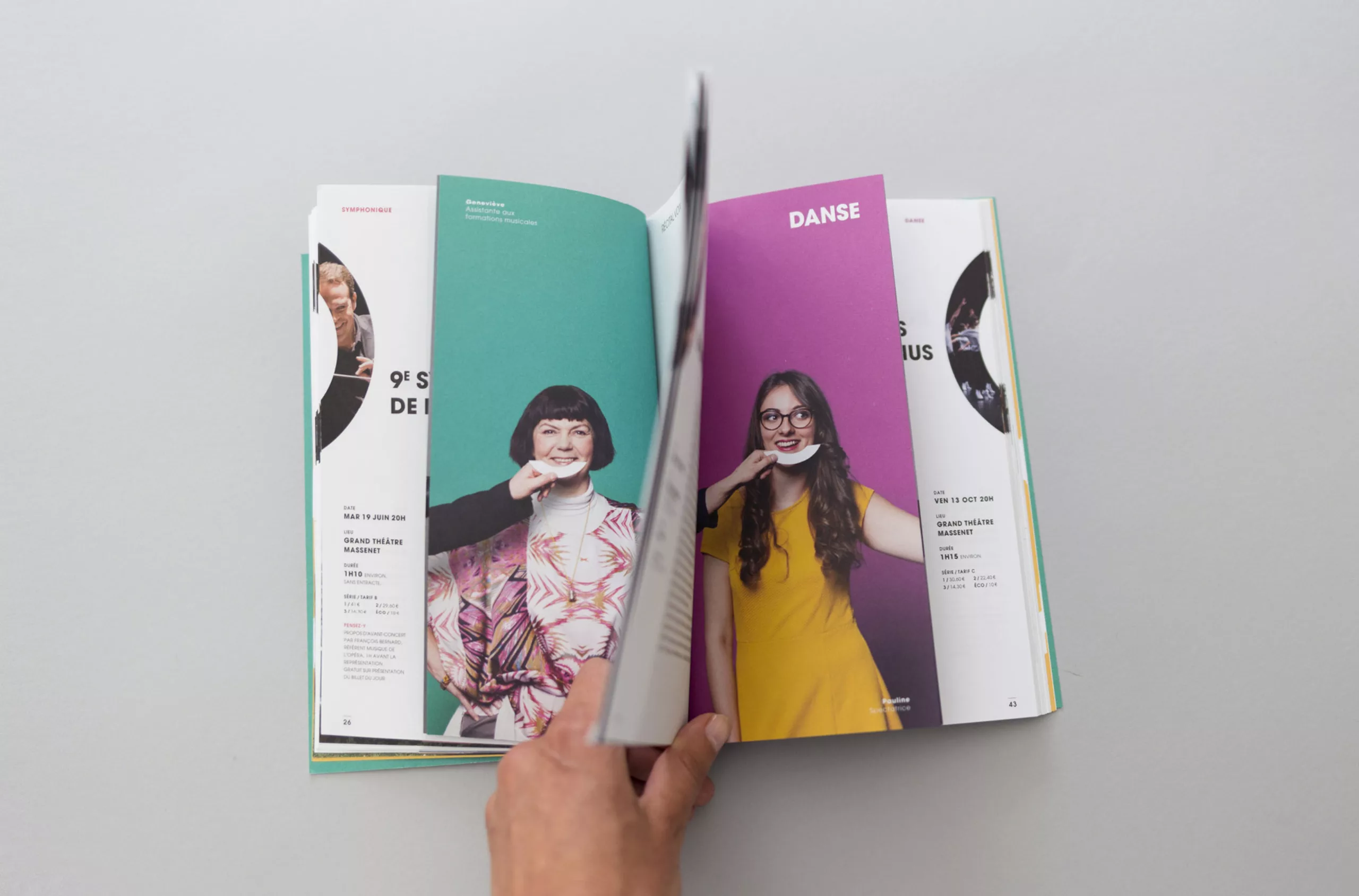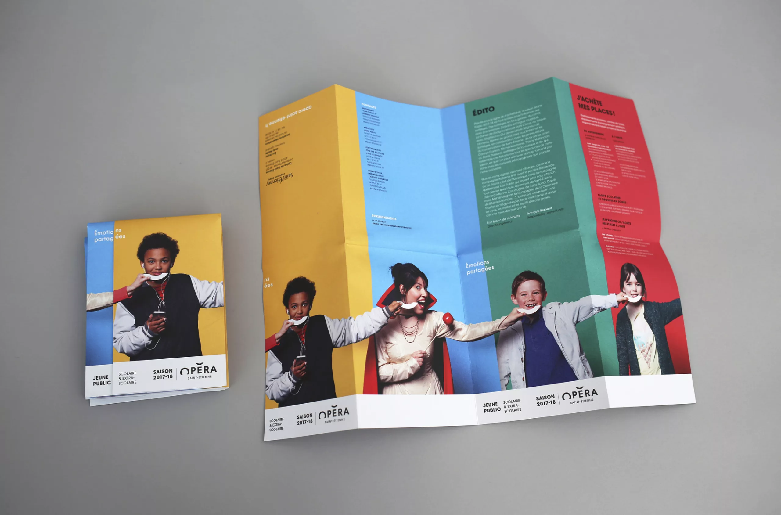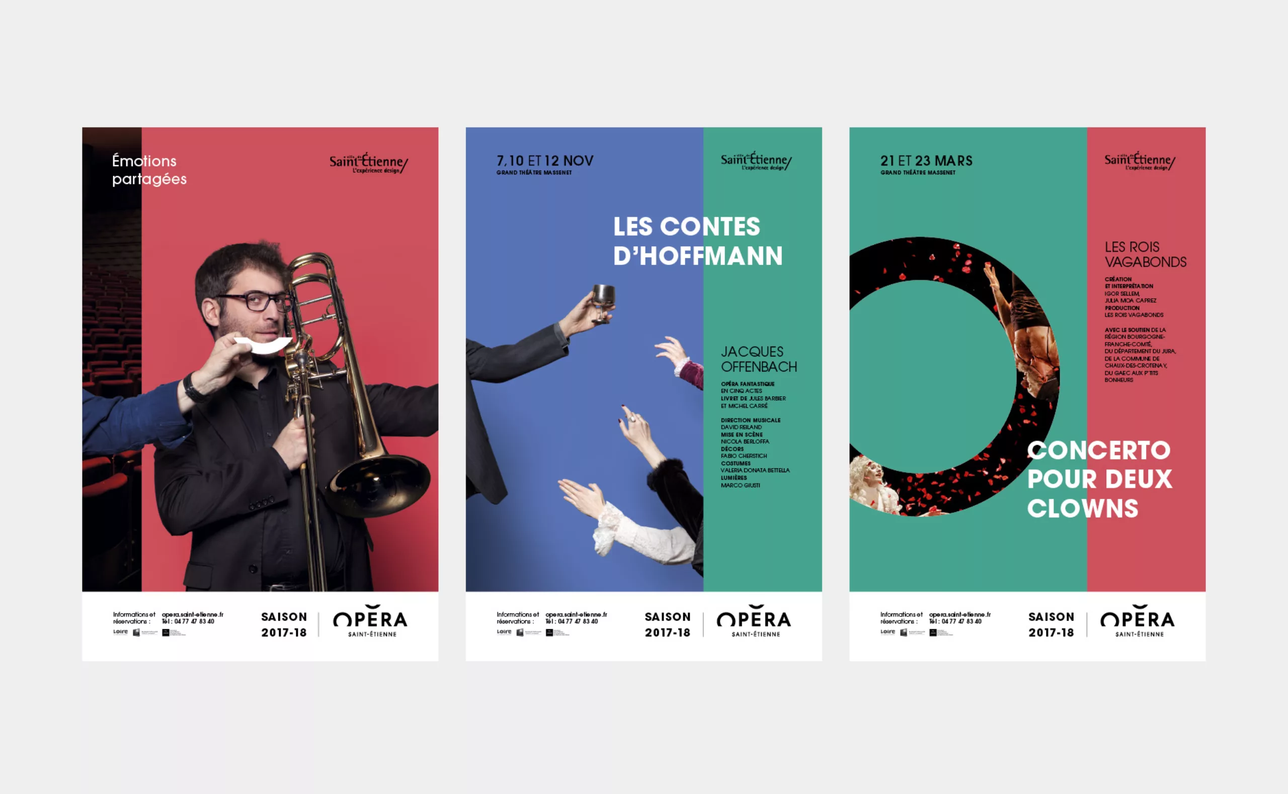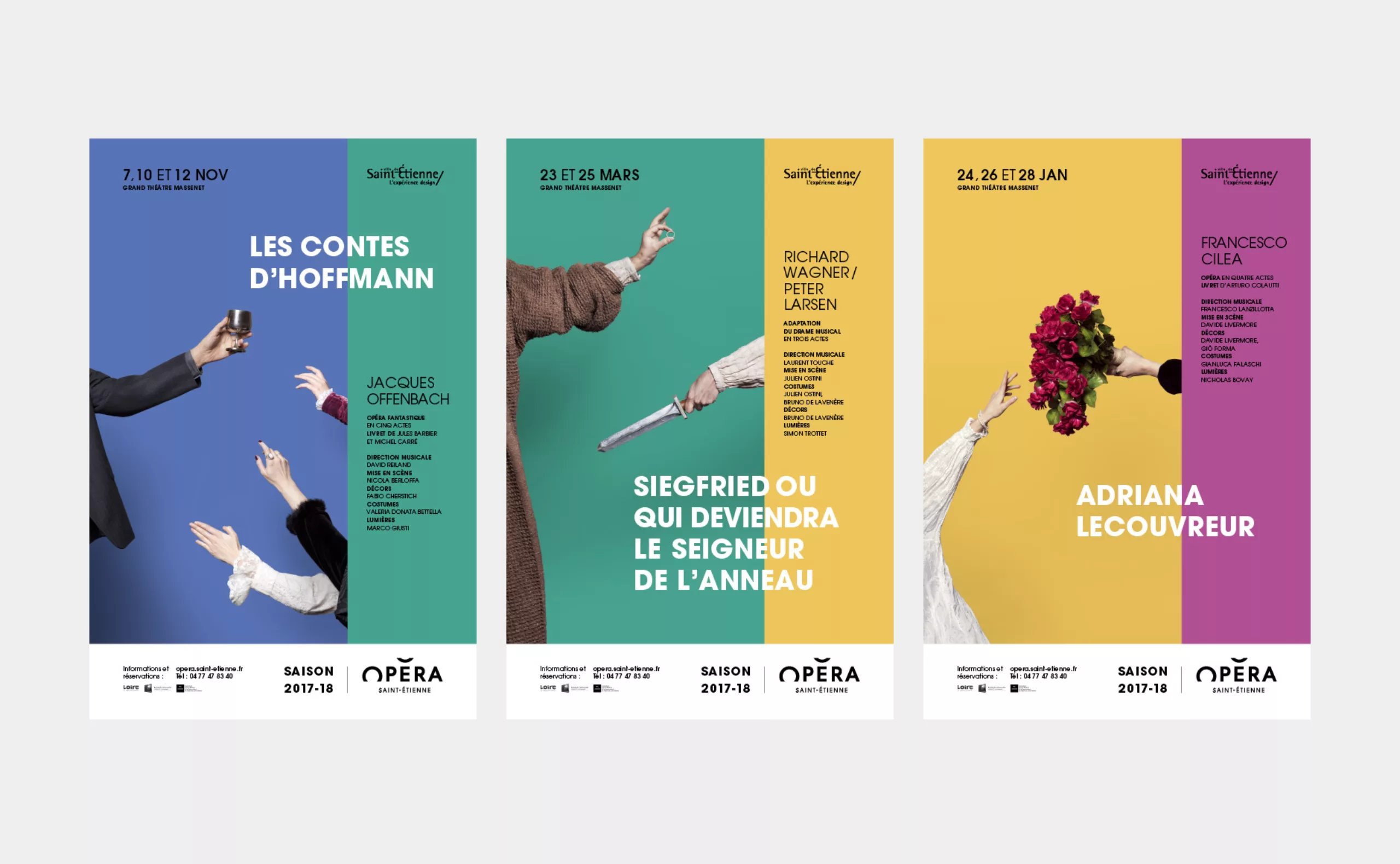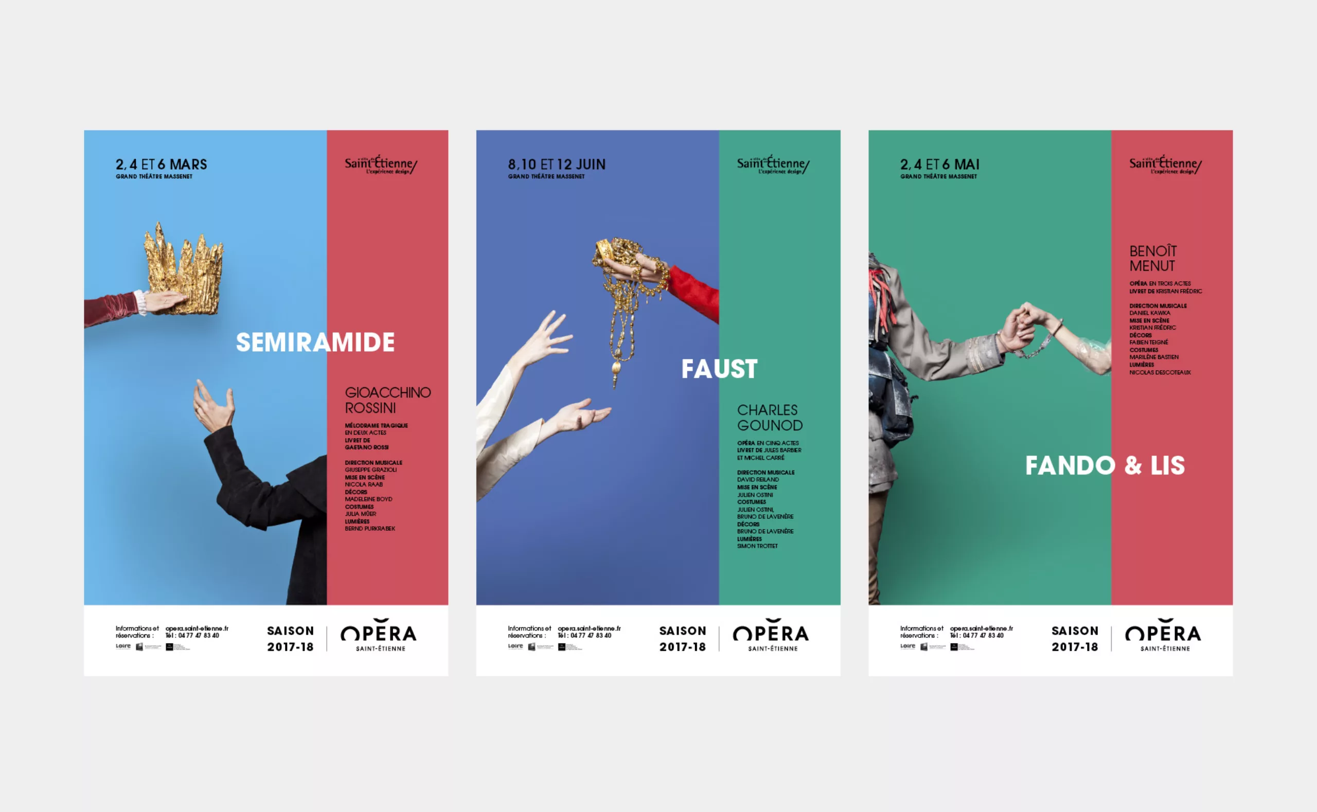 En 2015, nous concevions l’identité visuelle de l’opéra. Un logo typographique décrivant autant le bâtiment (avec son accent en forme de pagode) que la mission de cet opéra (accueillir et divertir tous les publics). Au fur et à mesure des saisons, le challenge était de poursuivre et renouveler cette histoire. Pour la première édition, nous mettions en avant les agents, puis l’orchestre l’année suivante. En 2017, nous avions décidé de mélanger les agents, les musiciens et les publics !