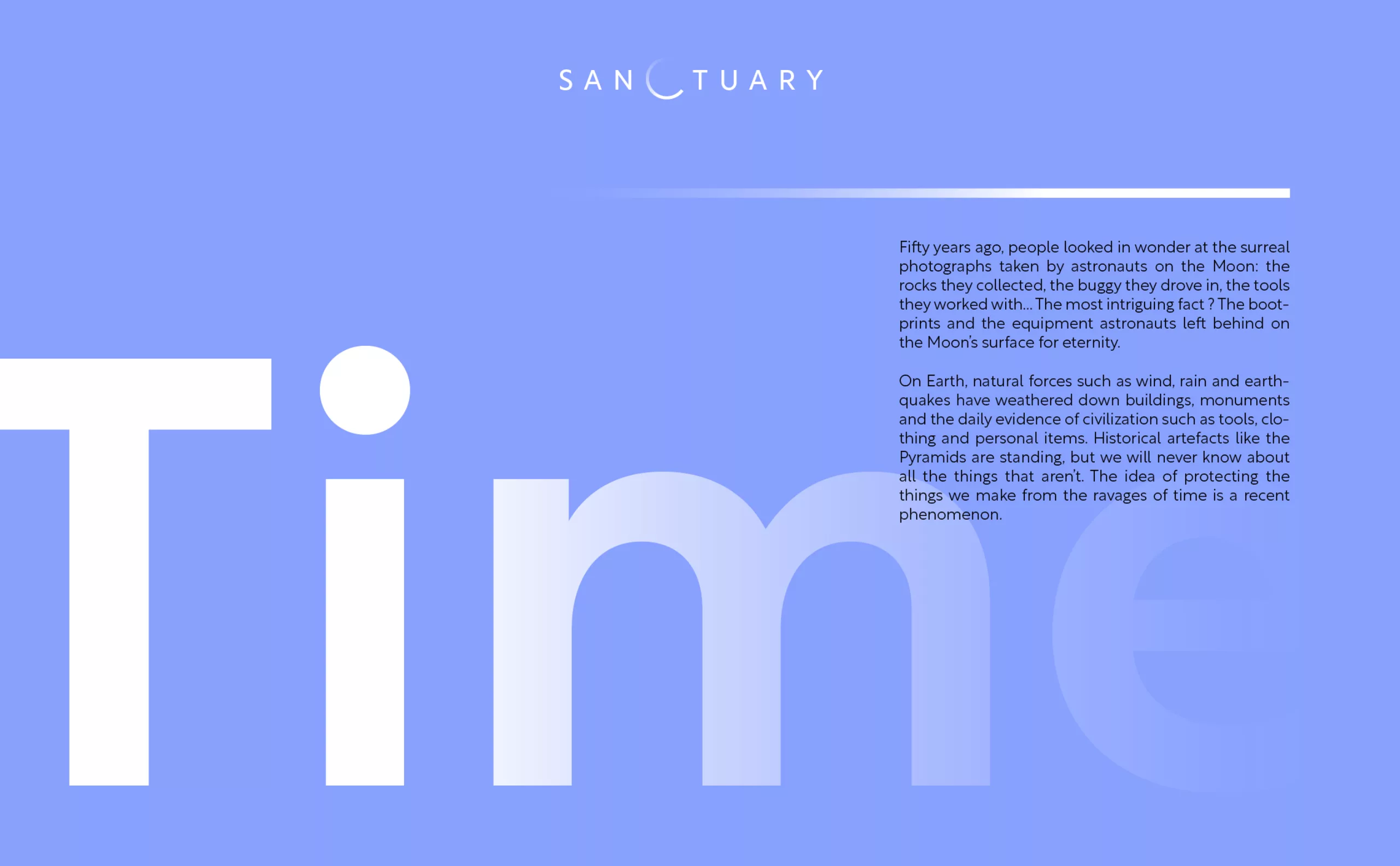 Sanctuary est une capsule temporelle qui contiendra et préservera une collection de disques de saphir ultra-durs gravés de milliards de pixels. Ensemble, ils porteront à travers le temps une cargaison précieuse en connaissances humaines issues des arts et des sciences. Sanctuary a pour mission de décrire qui nous sommes, ce que nous savons et ce que nous faisons.