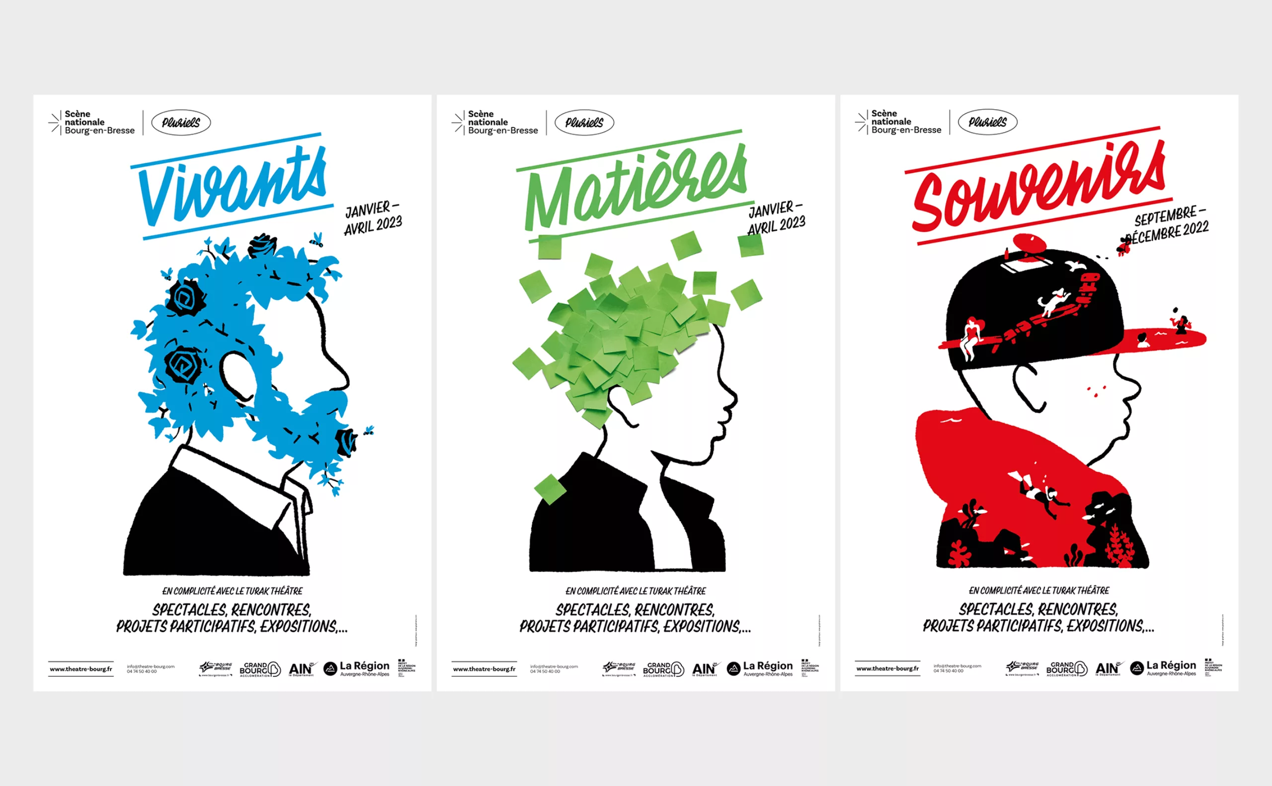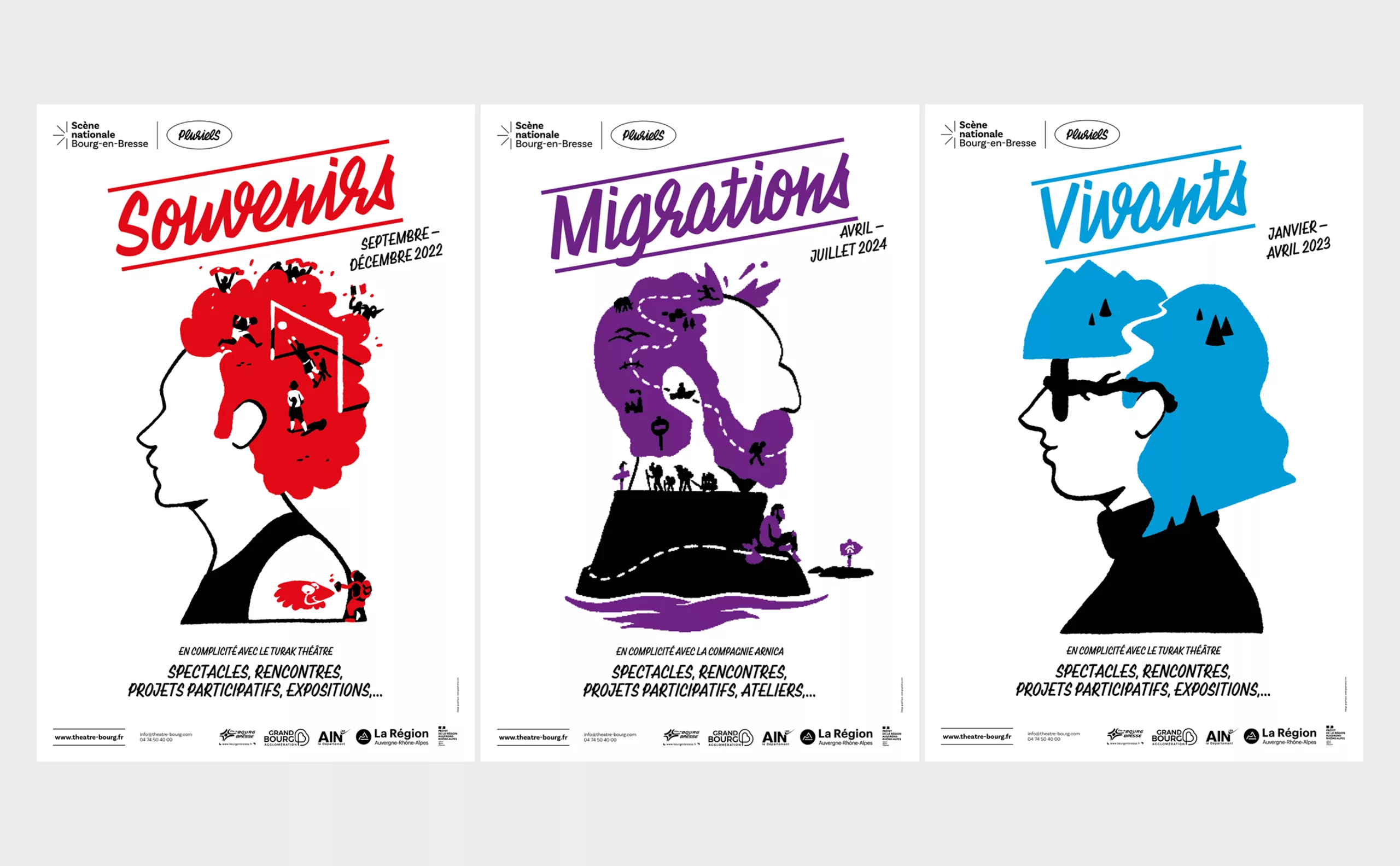 Dans le sillage de la période post-COVID, où le public retrouve progressivement ses repères dans les lieux culturels, la Scène Nationale de Bourg-en-Bresse fait le choix de proposer une programmation renouvelée désormais chaque quadrimestre intitulée “Pluriels”. Dans ce contexte de changement, l’agence Graphéine et les équipes du théâtre se sont unis pour repenser entièrement son identité. Les défis étaient multiples, allant de la communication d’un nouveau nom à une temporalité de programmation inhabituelle.
