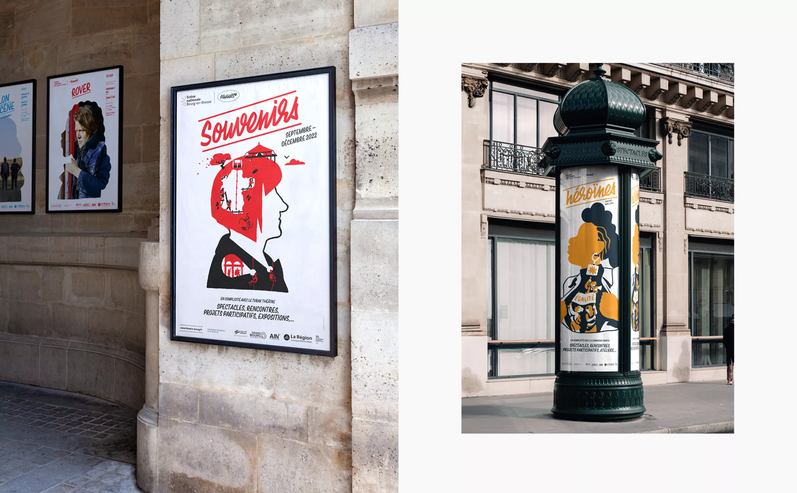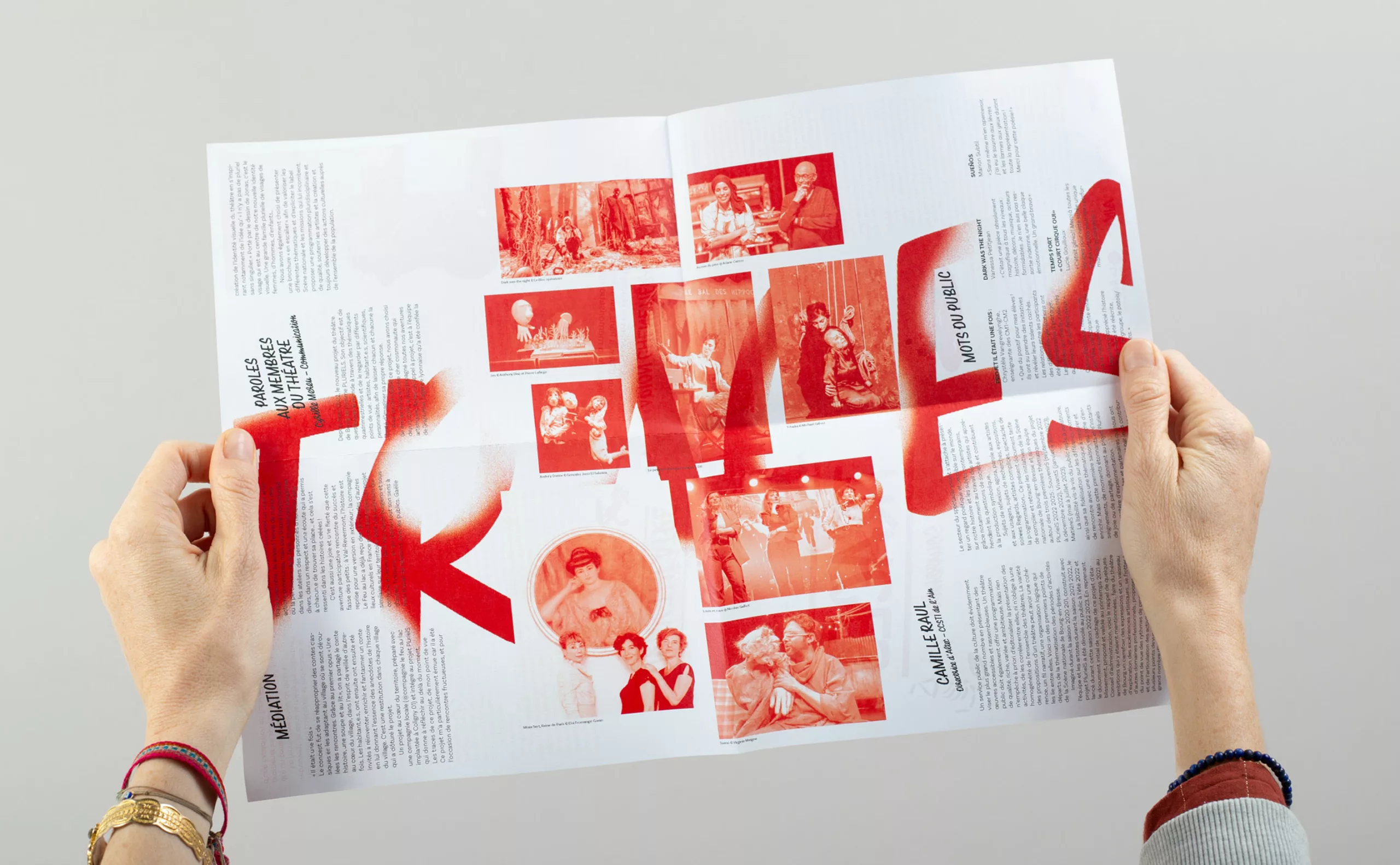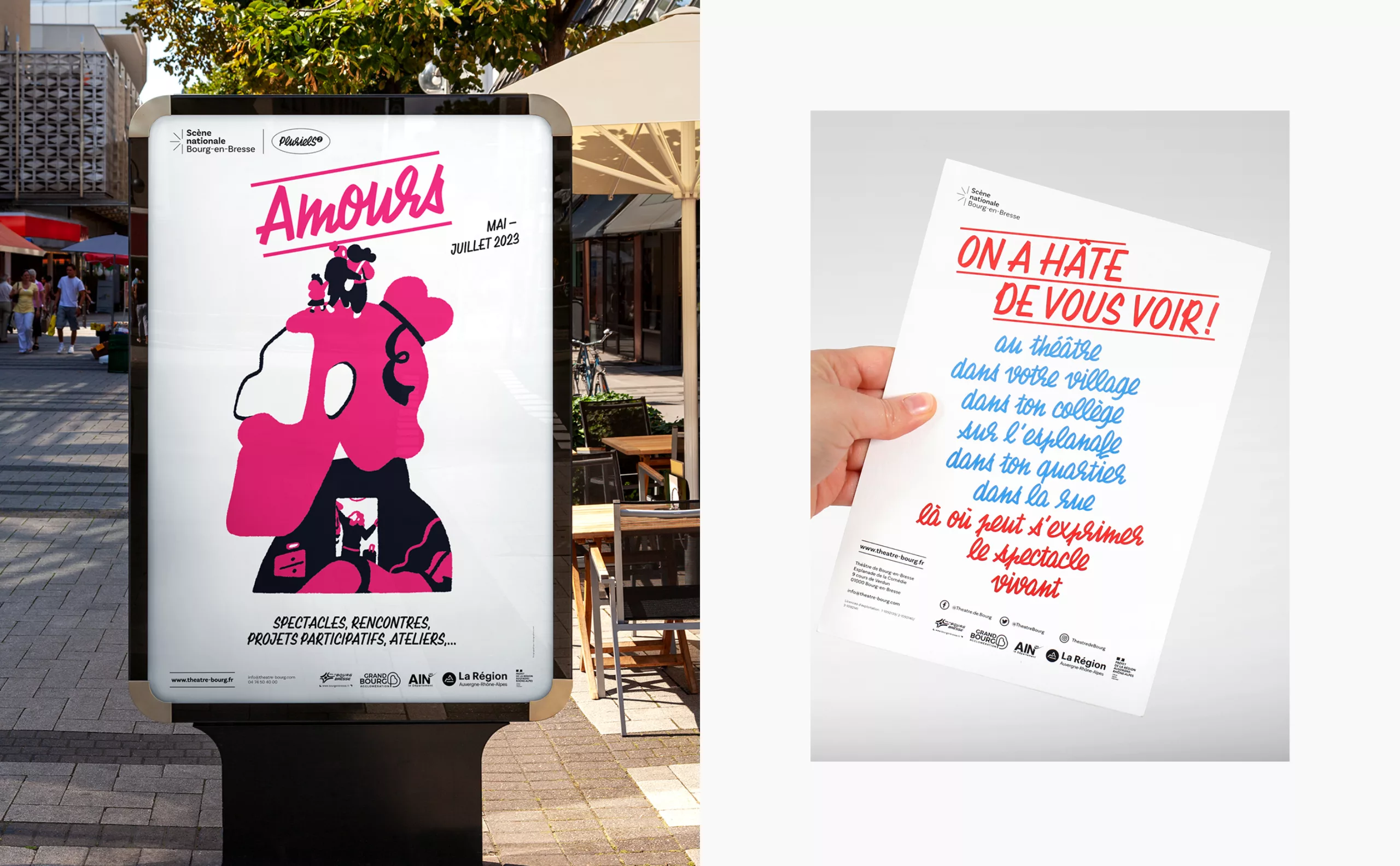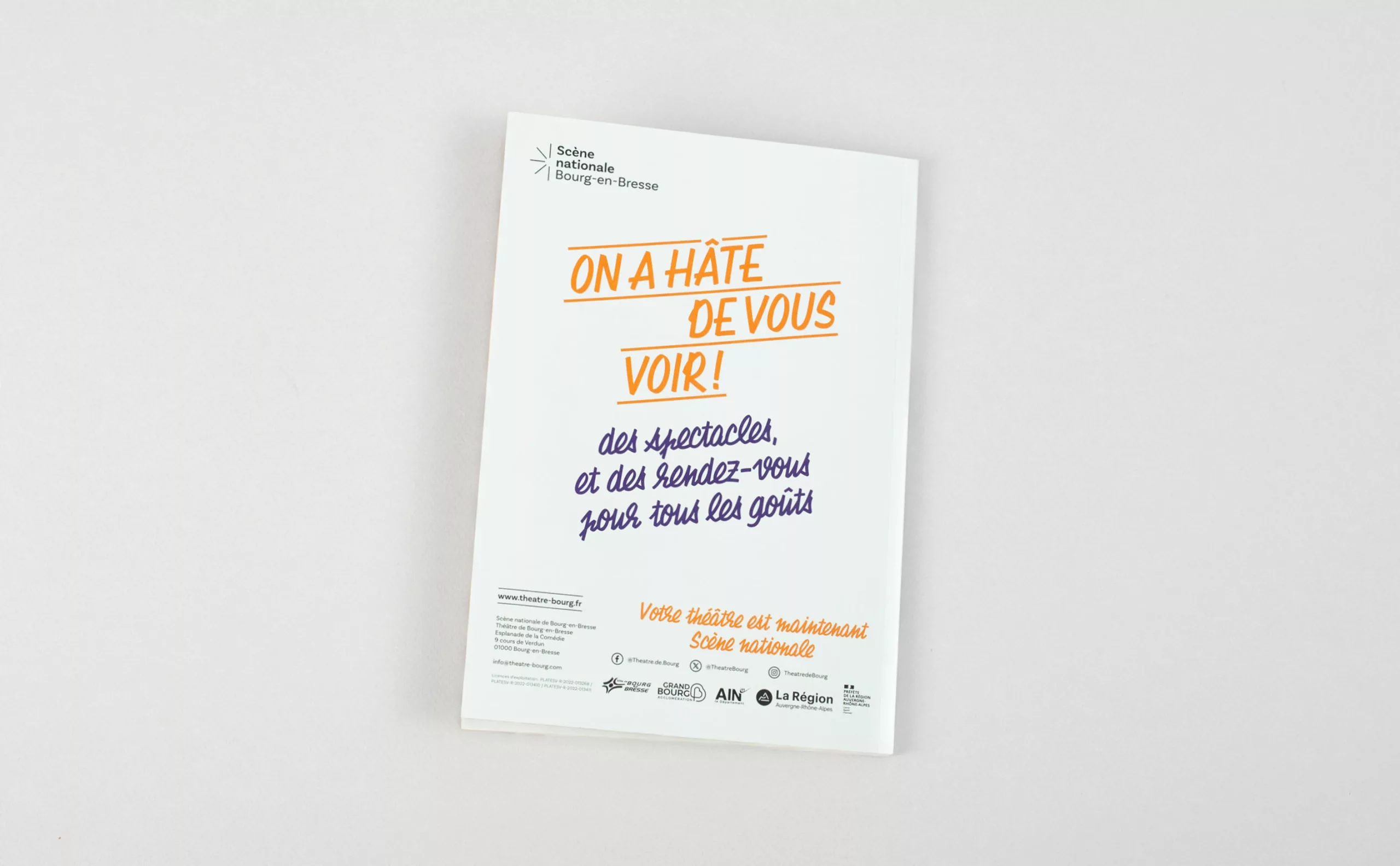 Il était pour nous évident que le concept créatif devait graviter autour du public, qui avait été trop longtemps absent. Les habitants de Bourg-en-Bresse et des environs deviennent ainsi les protagonistes de cette nouvelle communication. “Theatrum Mundi” (le grand théâtre du monde) s’impose comme une métaphore, suggérant que chaque individu joue un rôle, consciemment ou non, sur la vaste scène du monde. Puisant son inspiration dans la vie, les interactions humaines et le quotidien, le théâtre devient en quelque sorte un reflet de notre société. C’est pourquoi nous avons placé l’Humain – qu’il soit public ou collaborateur – au premier plan, car c’est lui qui insuffle vie et dynamisme à cette nouvelle Scène nationale de Bourg-en-Bresse.