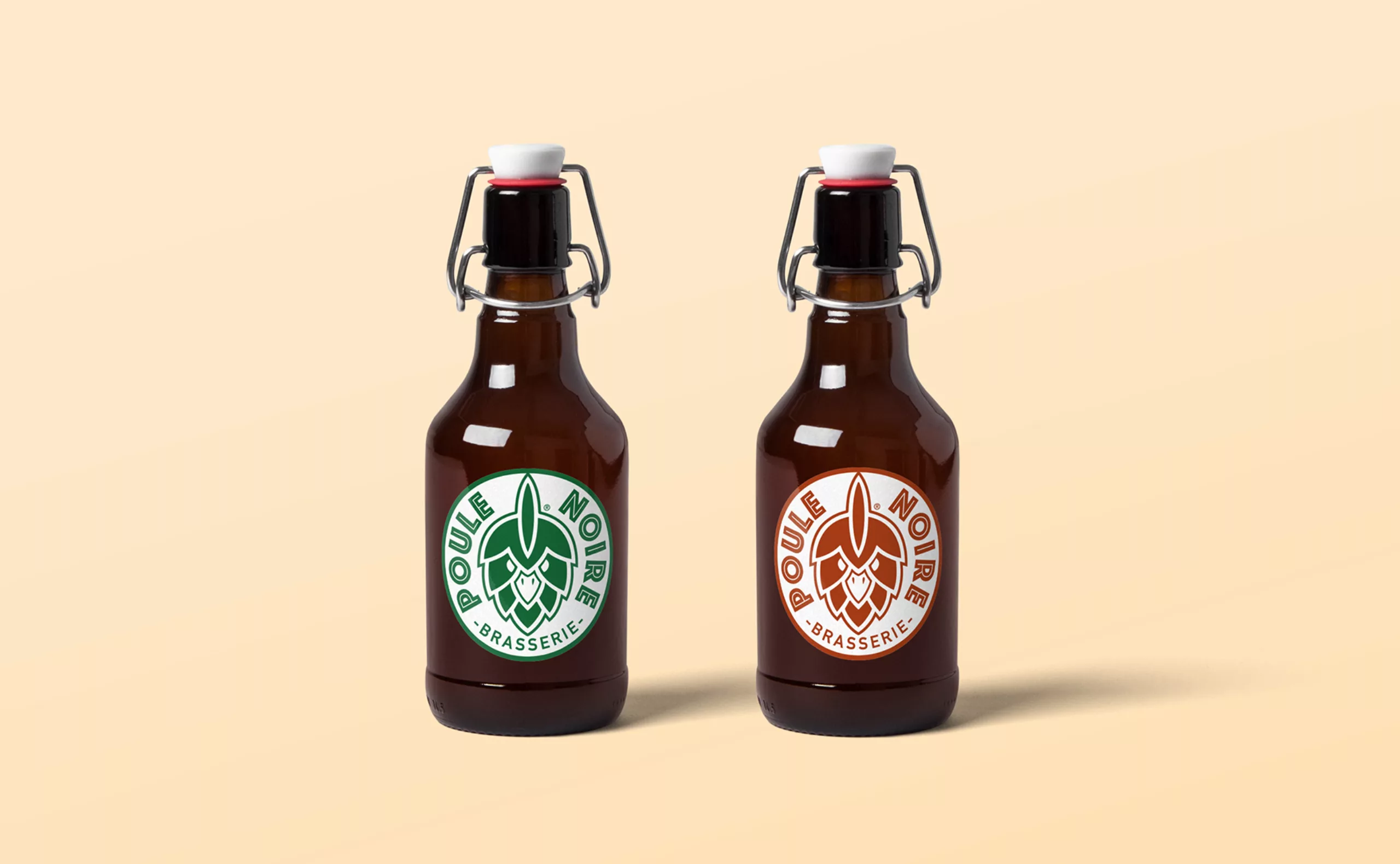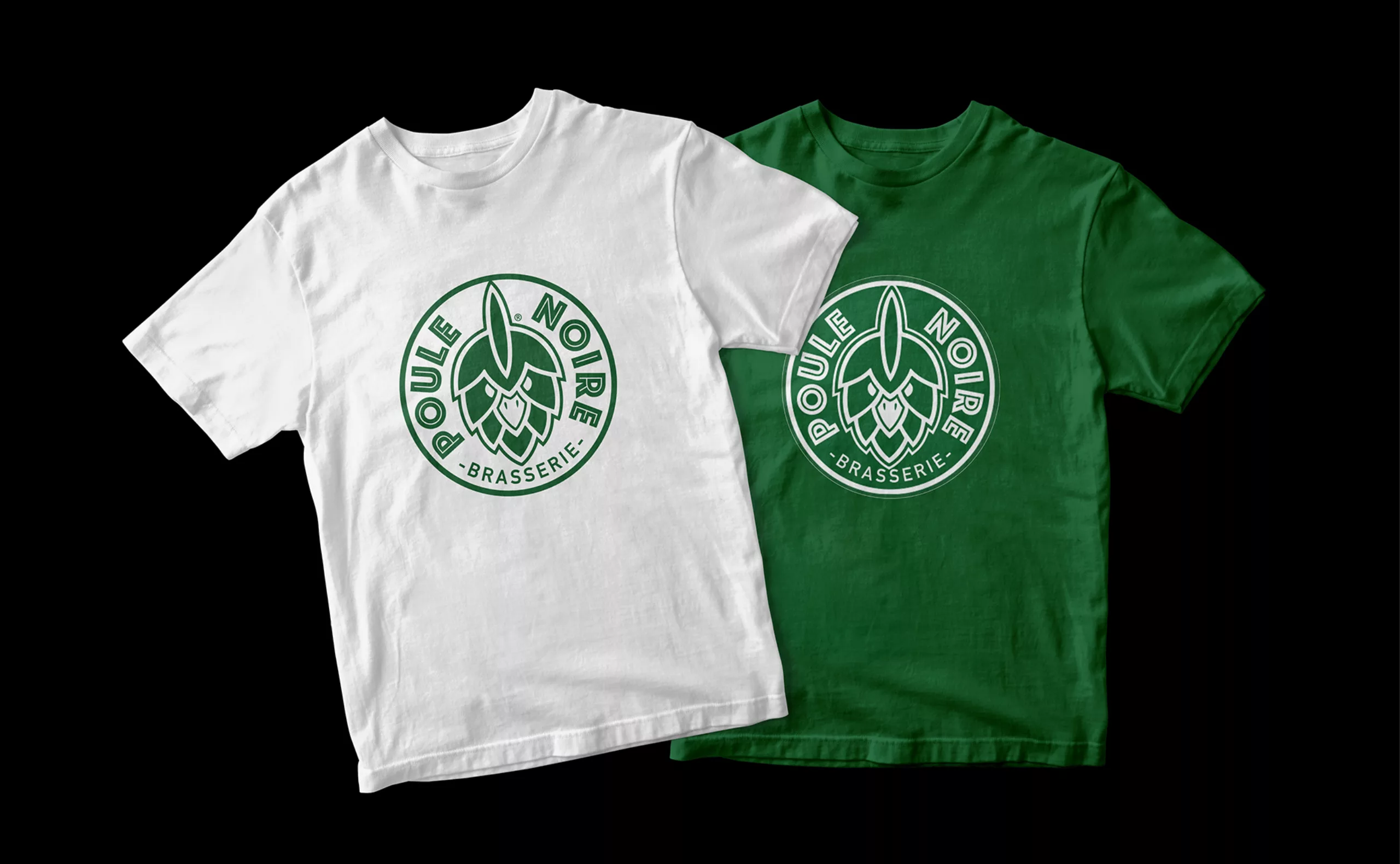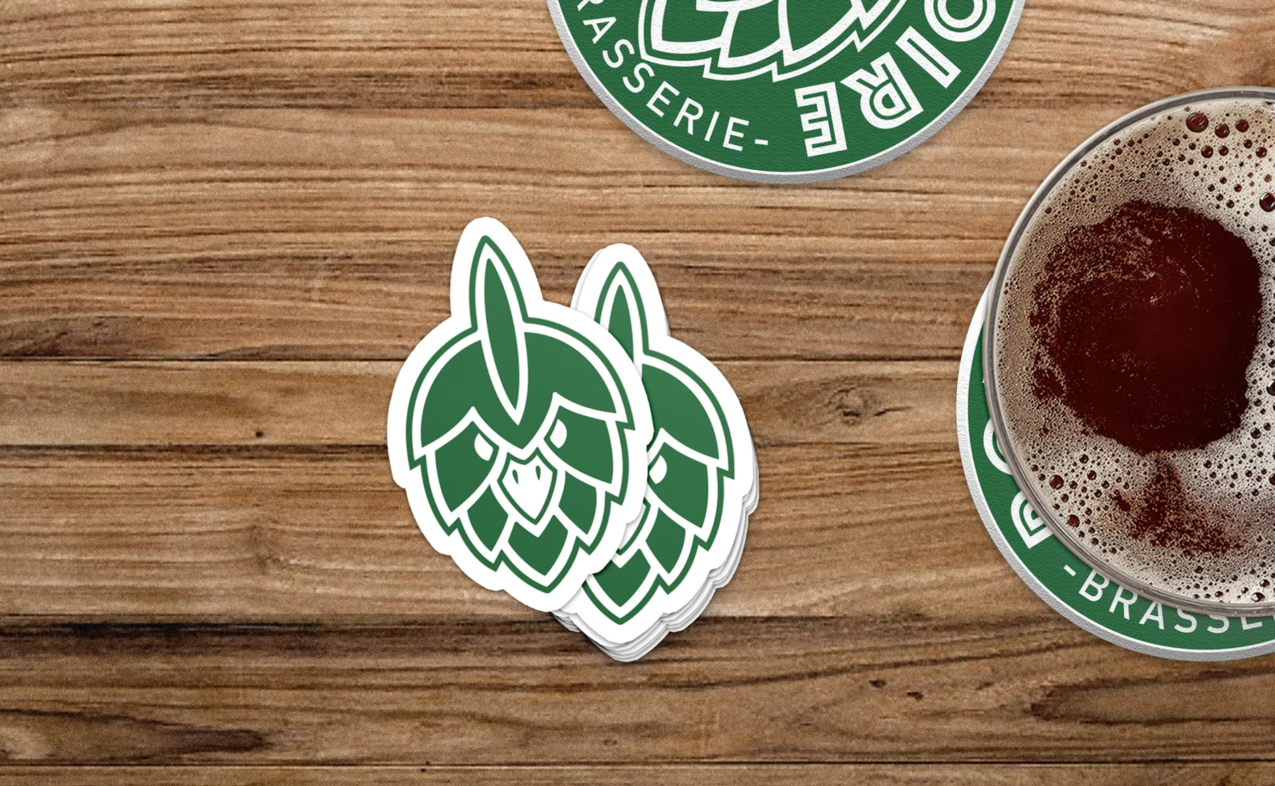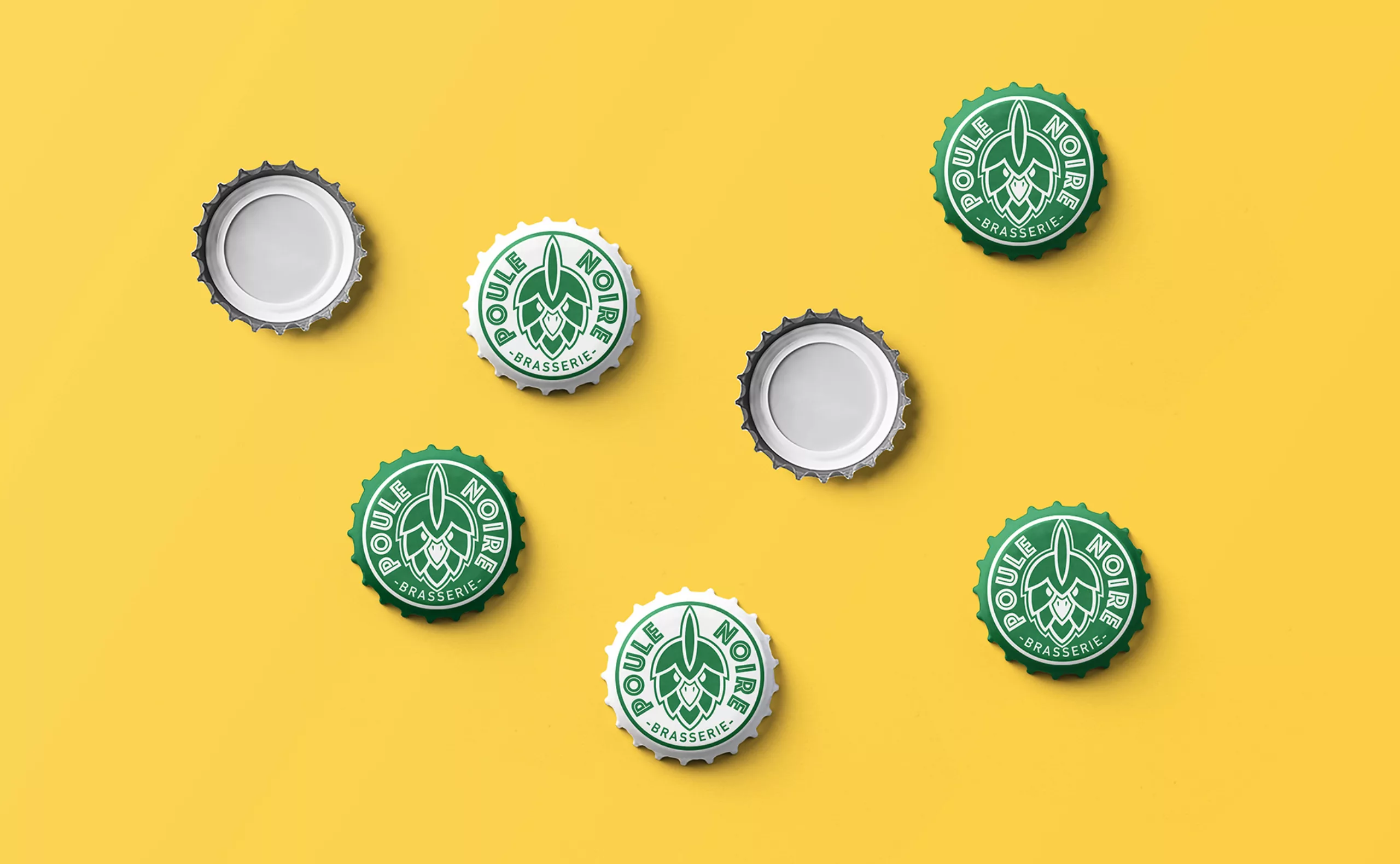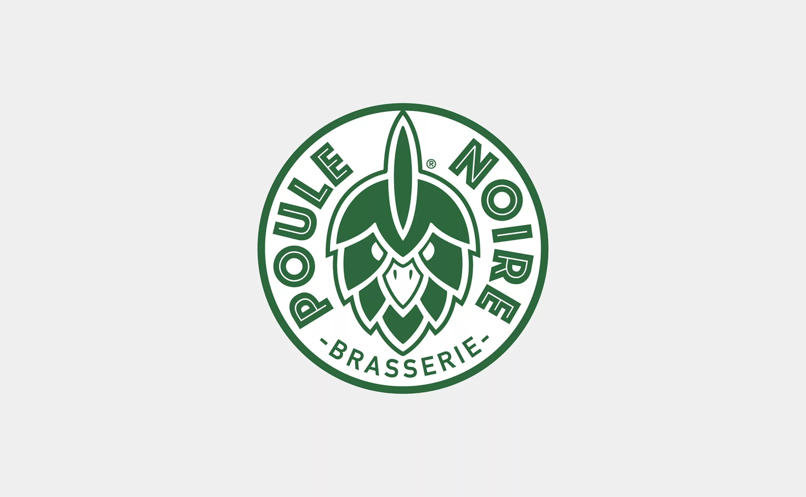 GastronomieIdentité visuelle d’une brasserie artisanale. Un logo qui associe l’image d’un grain de houblon et la tête d’une poule pour créer un logo synonyme de bières de caractère !