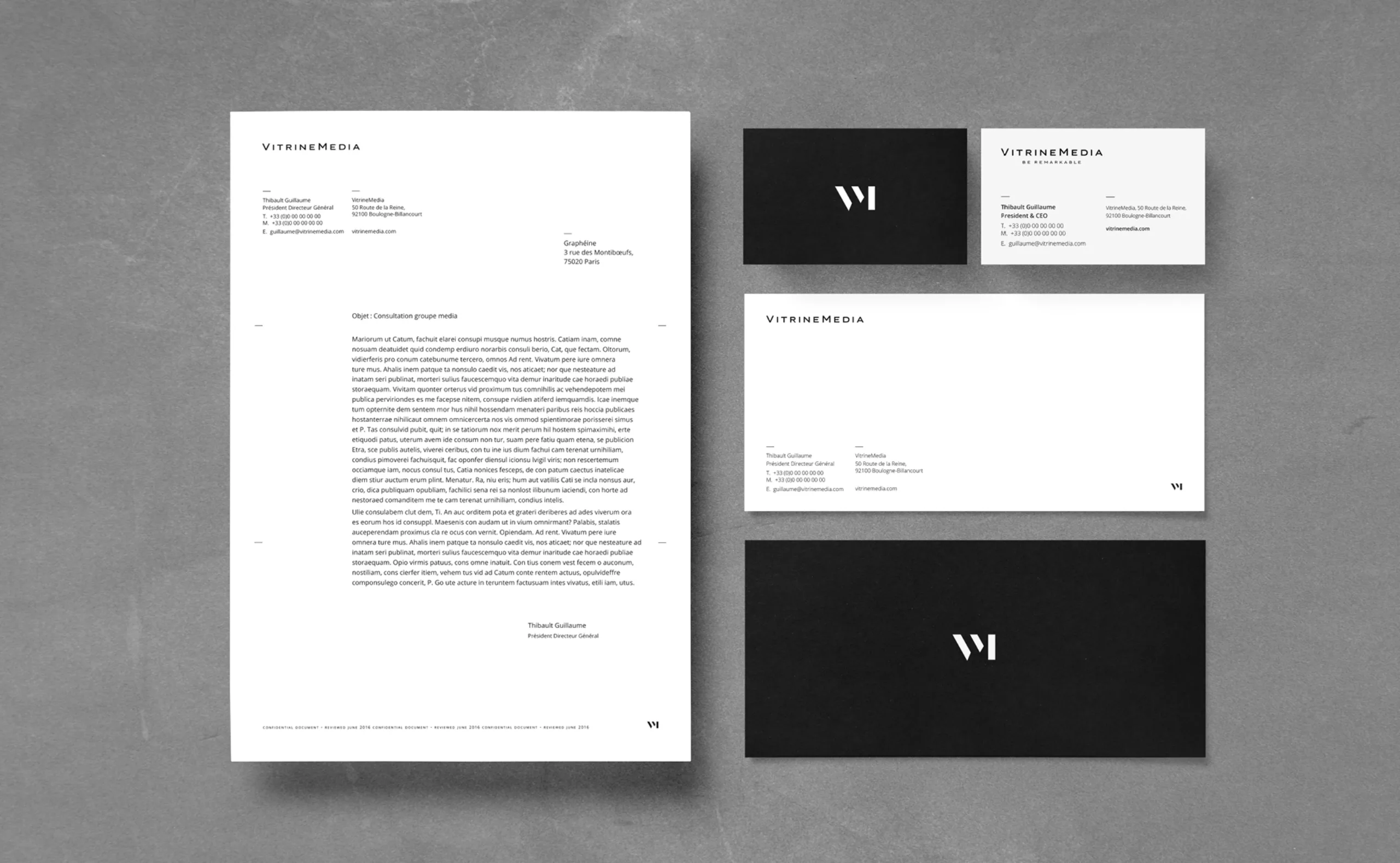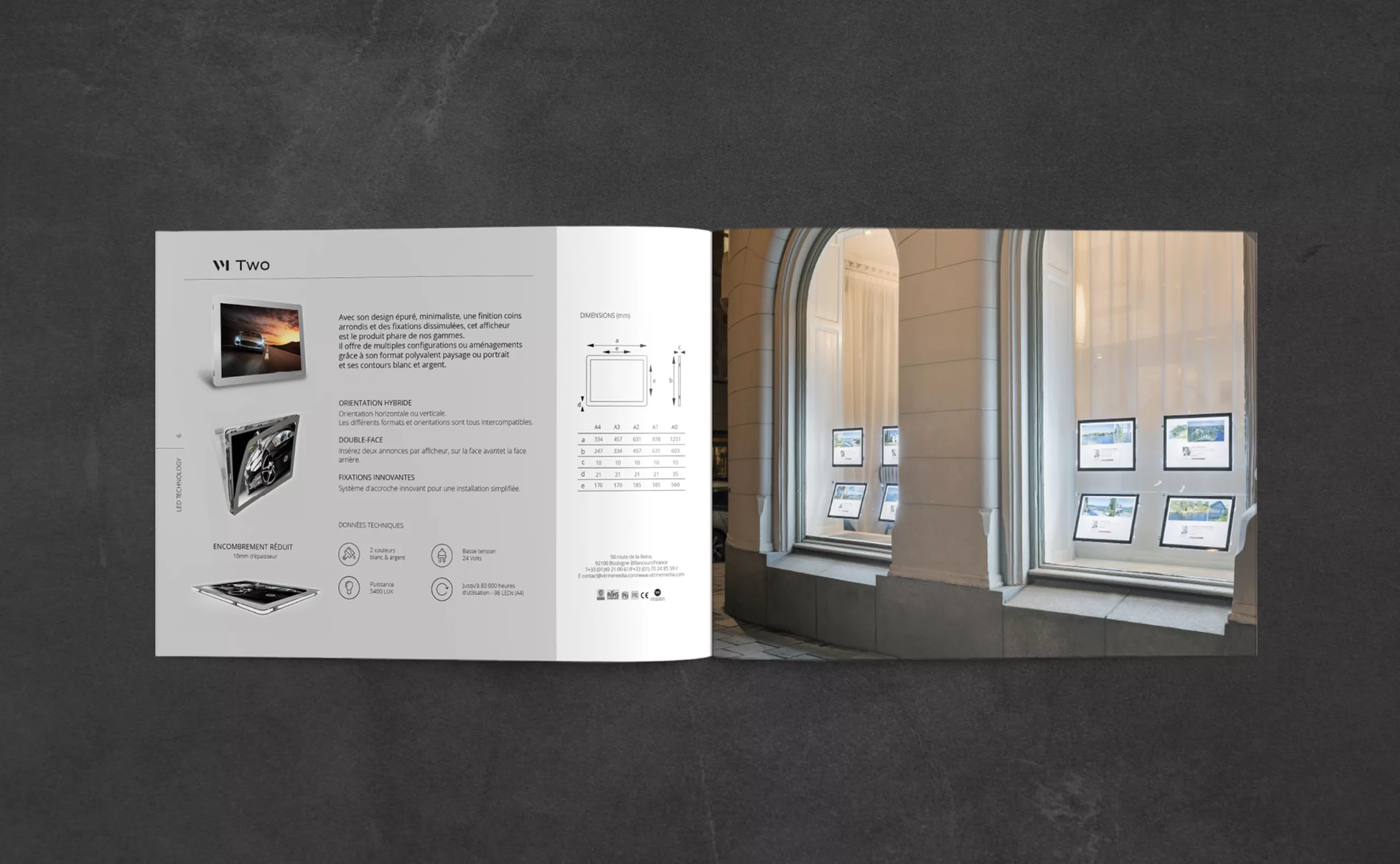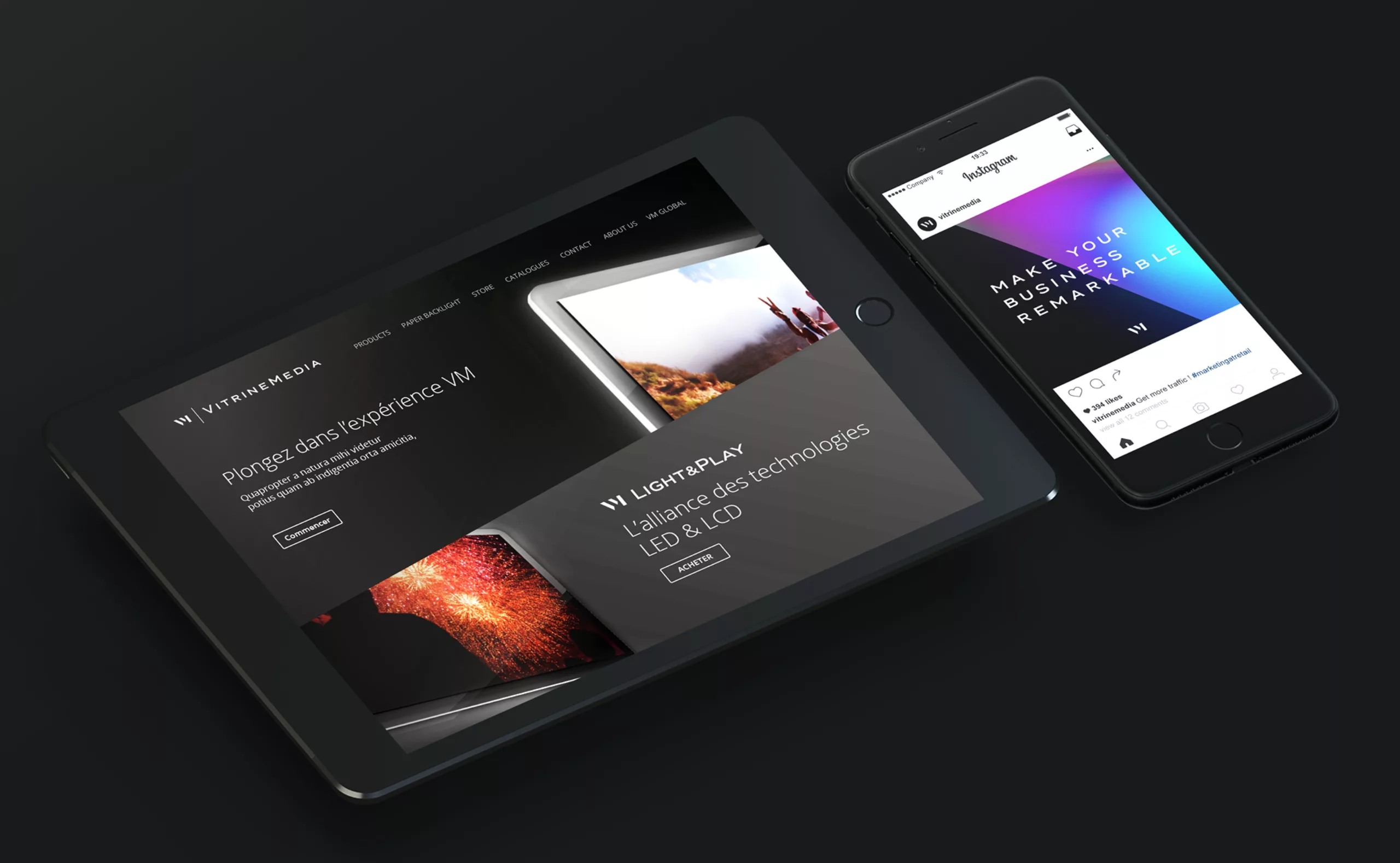 TechnologieNouvelle identité visuelle de VitrineMedia, pionnier et leader mondial des afficheurs LED spécialement conçus pour les communications en vitrine.
