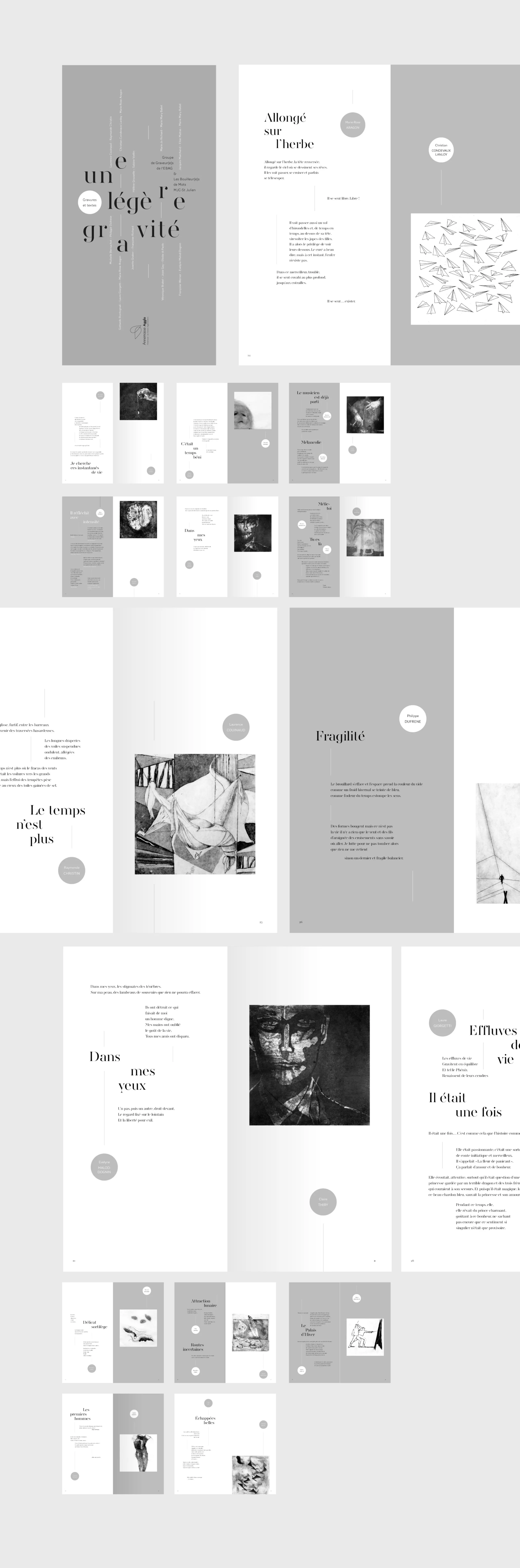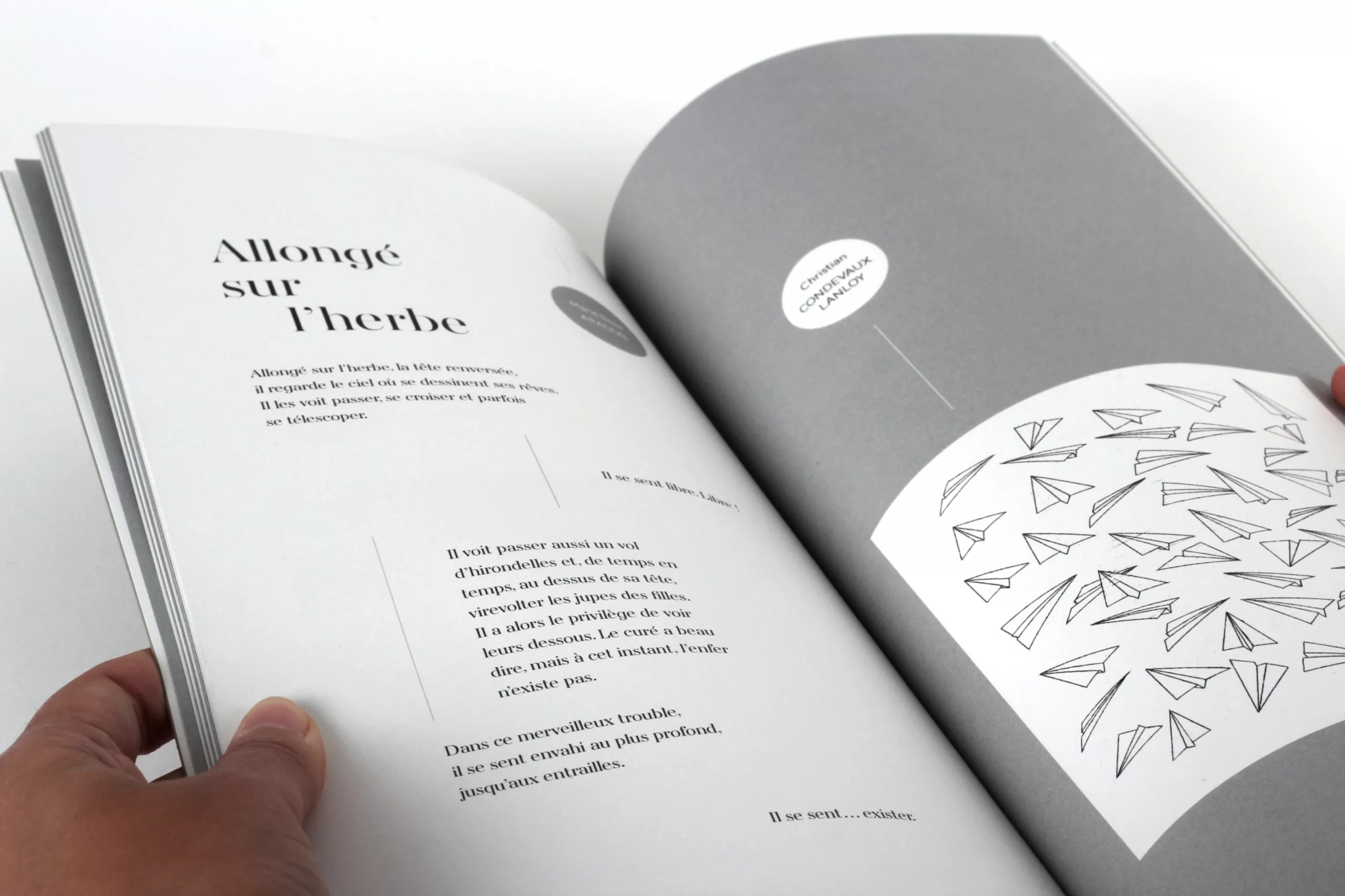 Notre travail consistait à mettre en page cet ouvrage d’art. Nous avons donc imaginé cette pluie de lettres en couverture. Comme un vent léger qui coule sur la page. Le nom des auteurs venant s’inscrire en vertical.