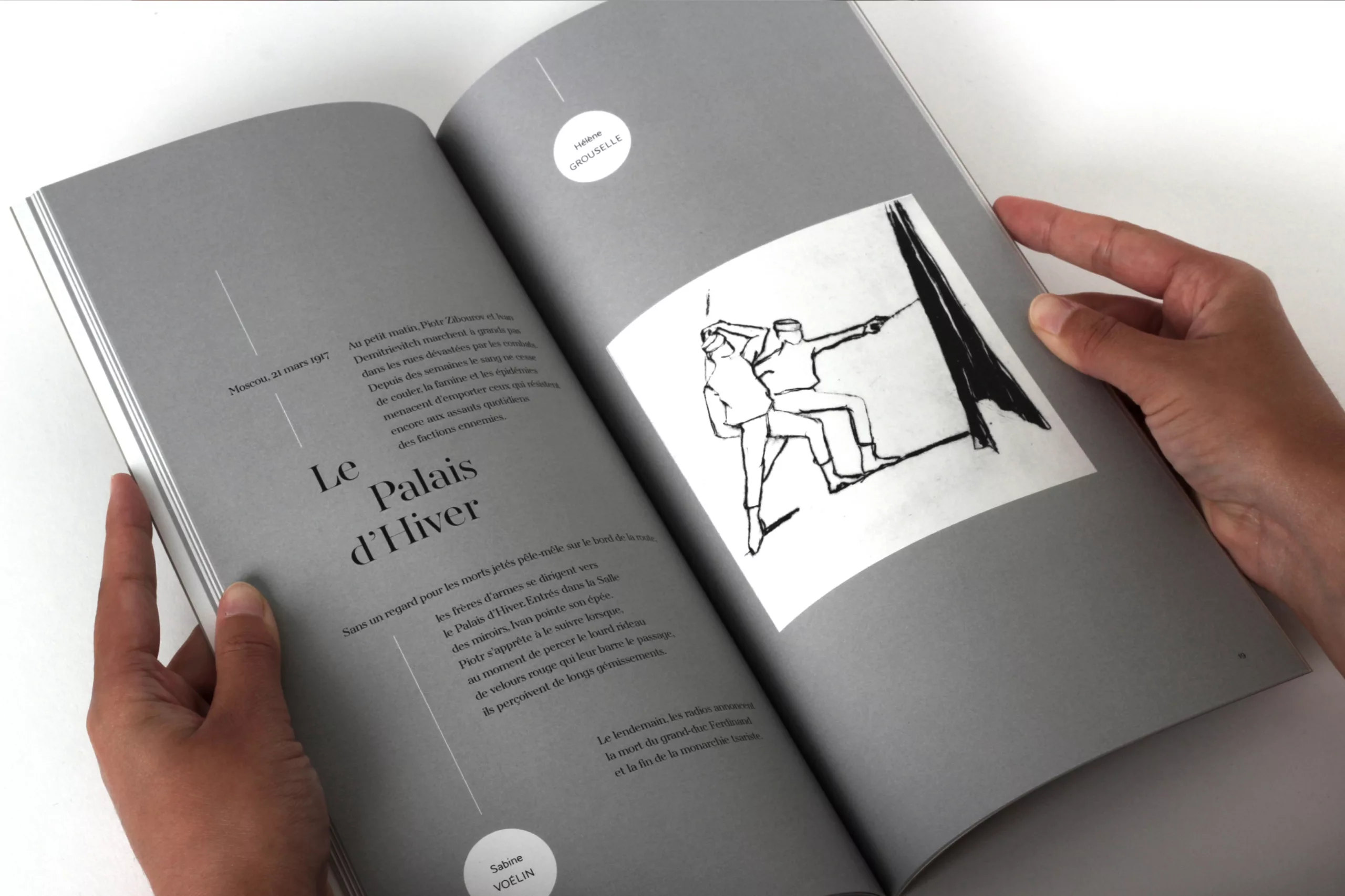 L’ensemble de l’ouvrage est imprimé en bi-chromie sur un papier gris brut, teinté masse.