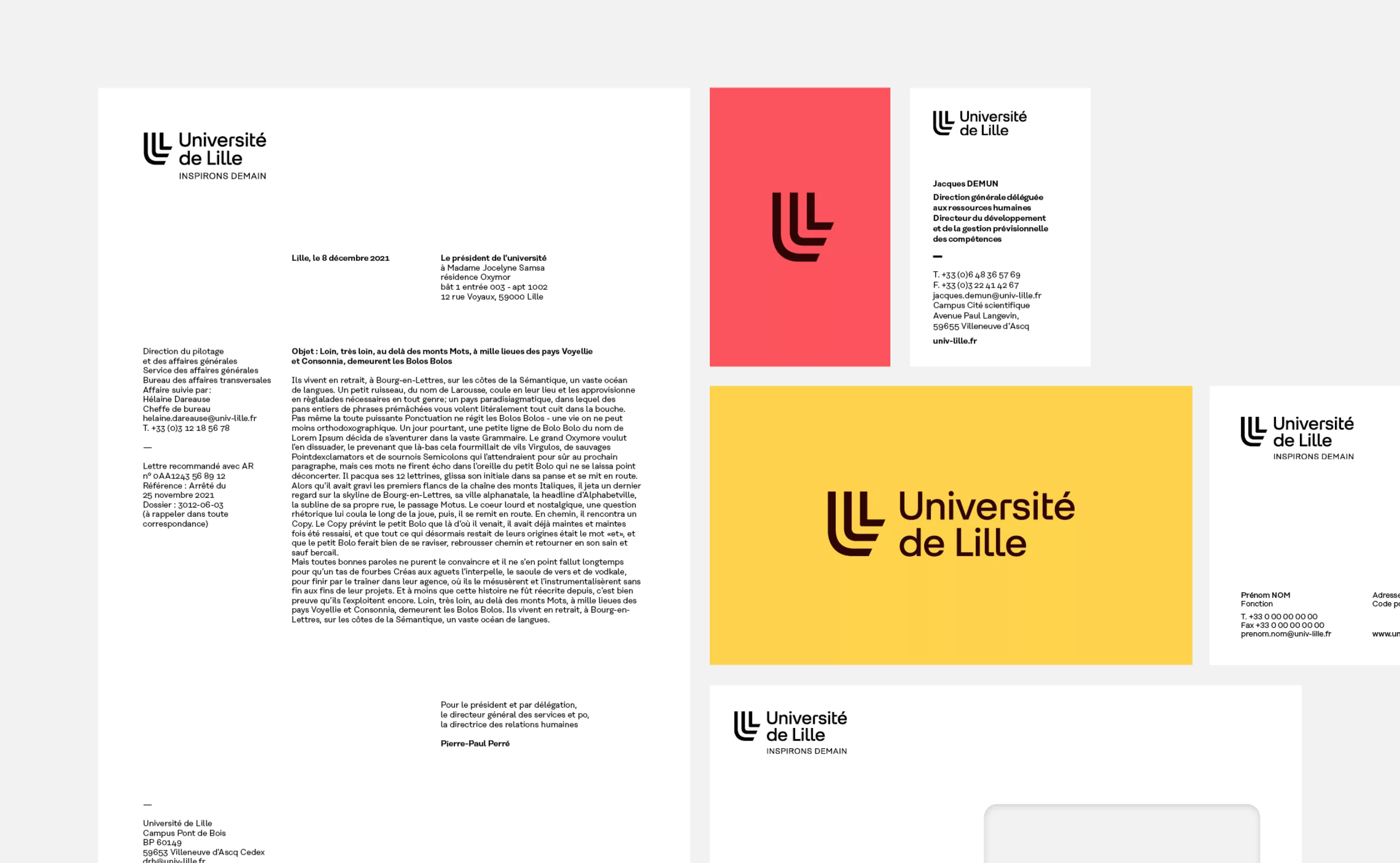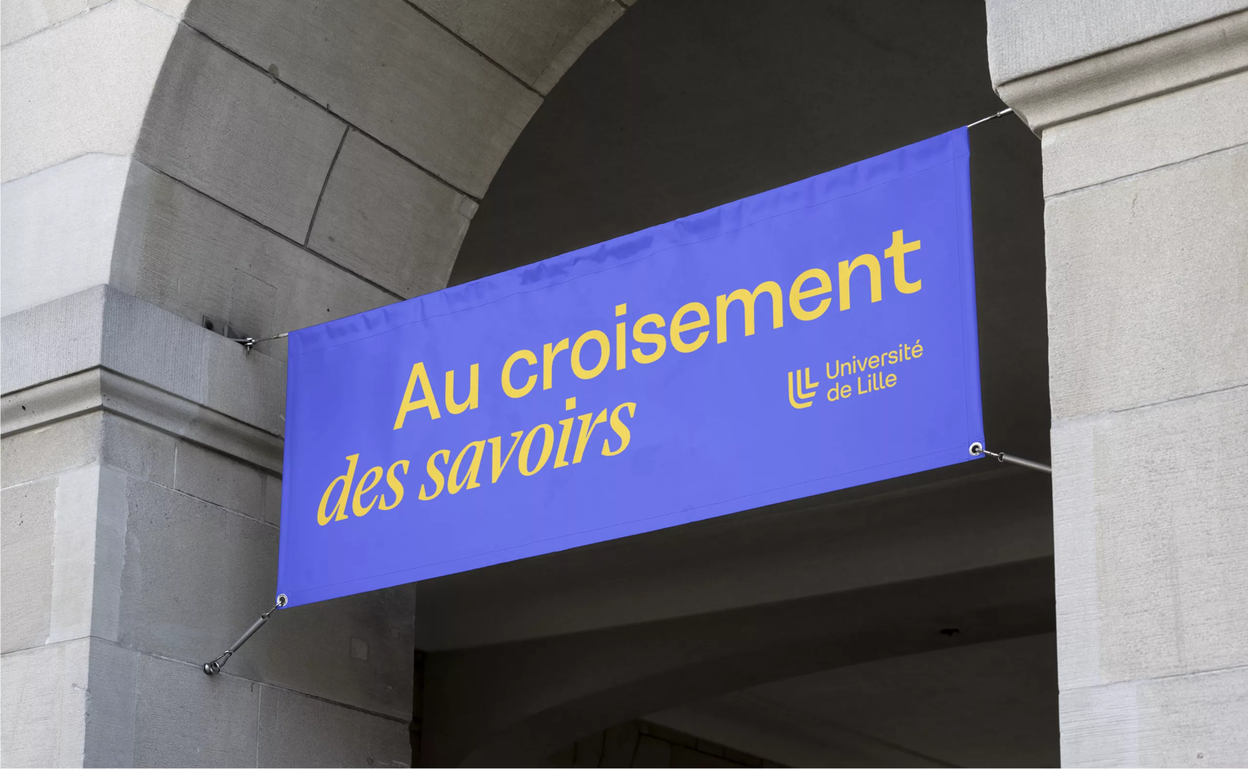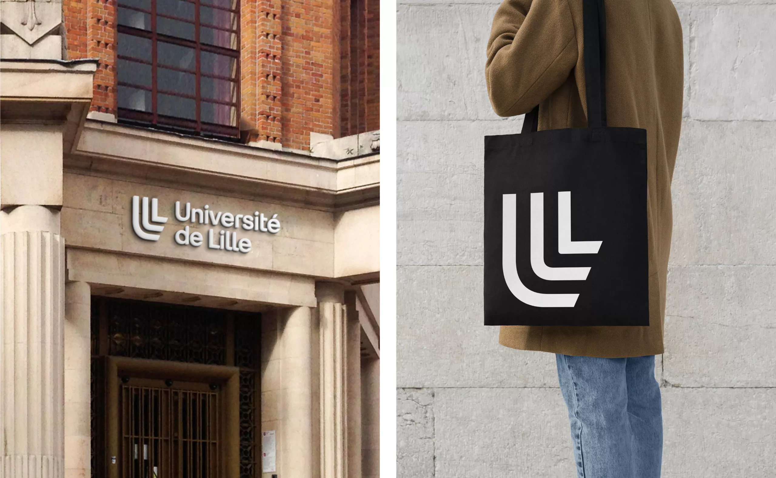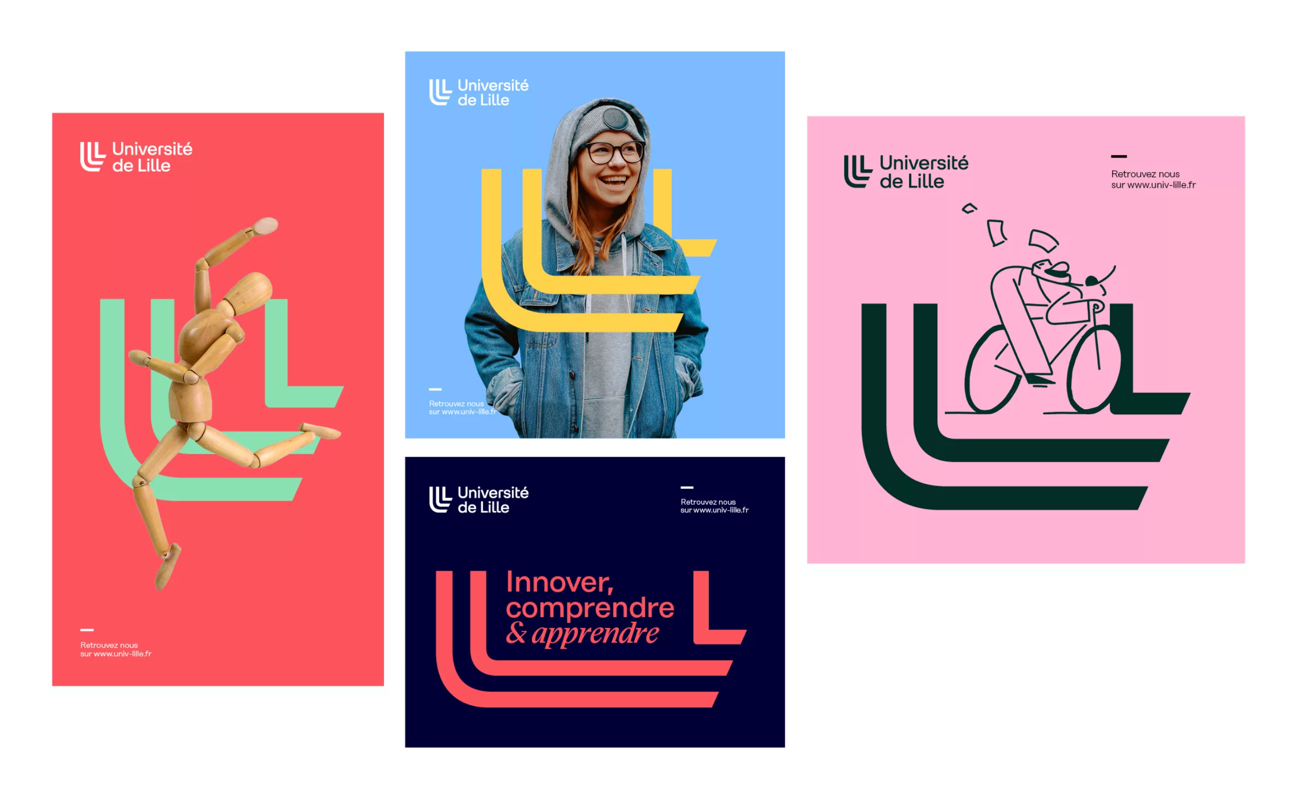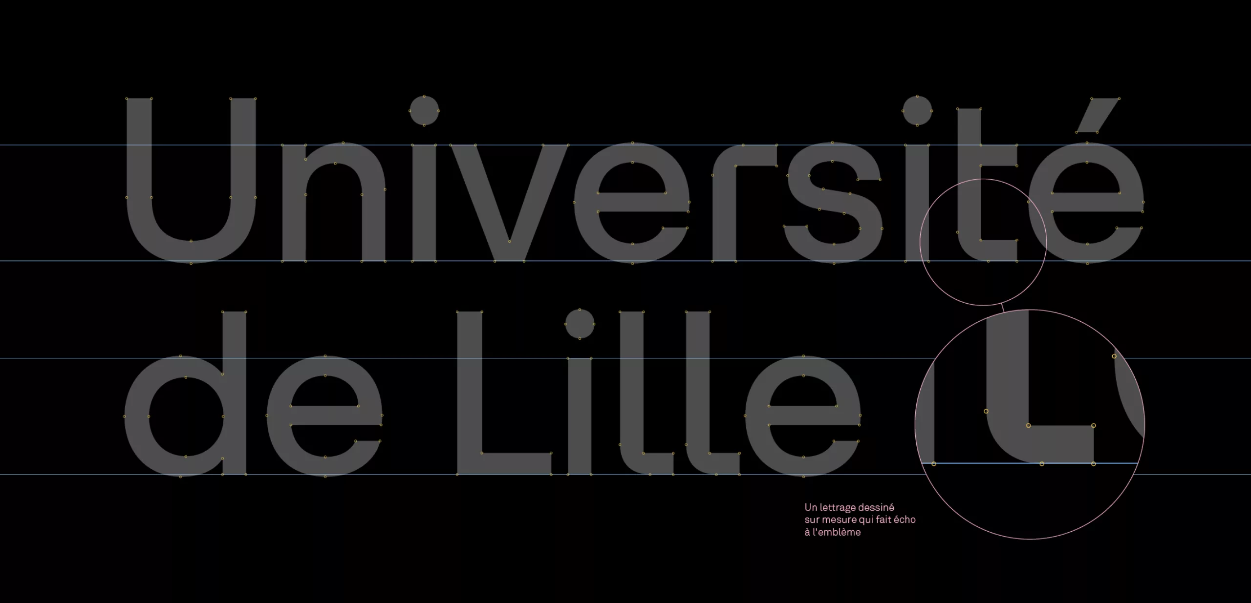 Le bloc typographique, dessiné sur mesure, a été pensé en harmonie avec l’emblème. On y retrouve de nombreuses similitudes formelles tel que la simplification des fûts et la définition de contres formes carrées qui rappellent les coupe de l’emblème. Ce logotype institutionnel permet une grande variété d’actions au sein du système visuel. La création de cette nouvelle identité a été réalisée en co-construction avec les équipes de l’Université de Lille lors de différents workshops. Des échanges précieux qui ont permis l’émergence et l’adhésion autour de ce projet d’identité visuelle.