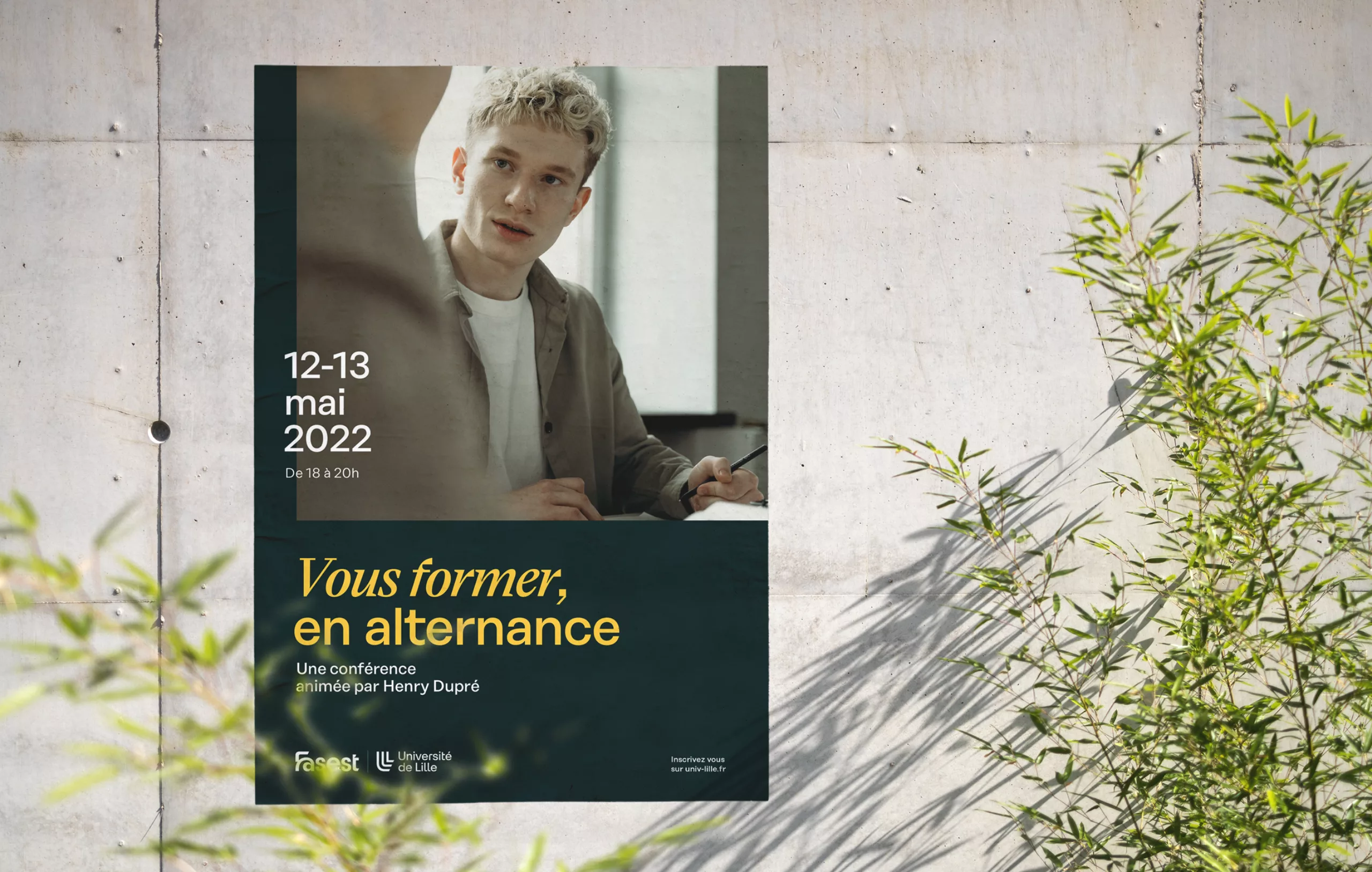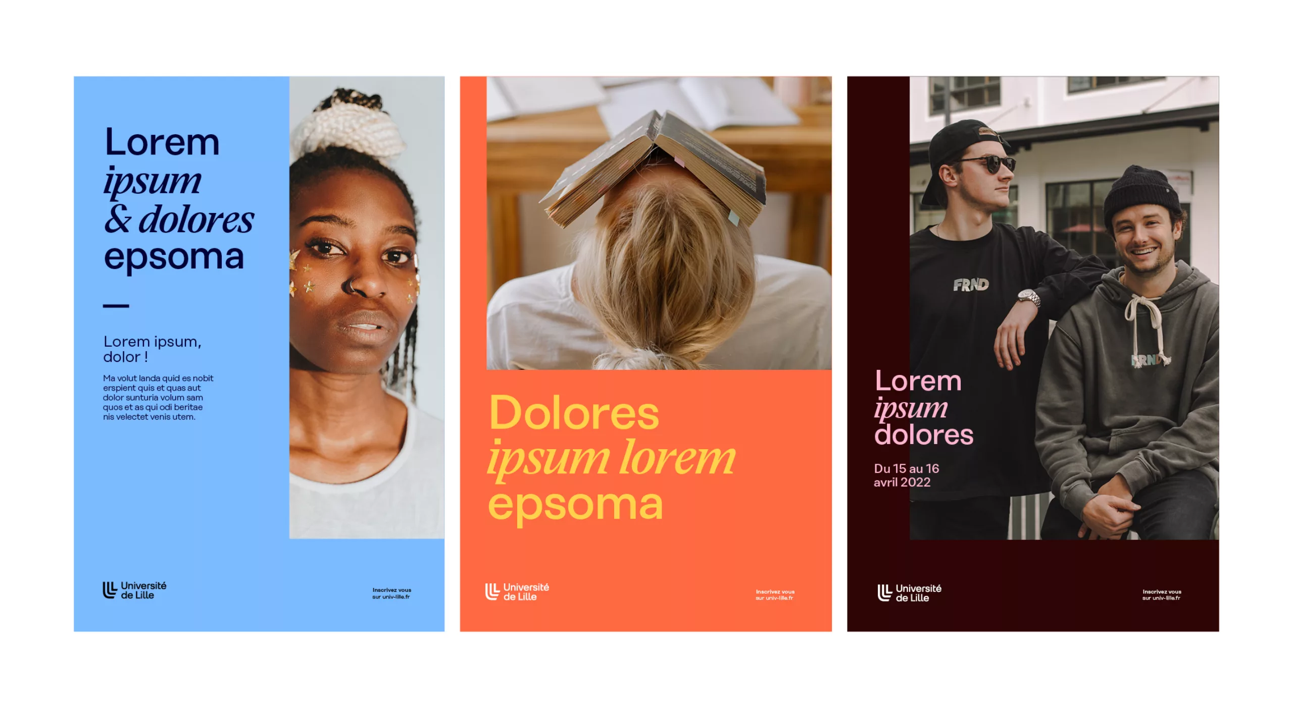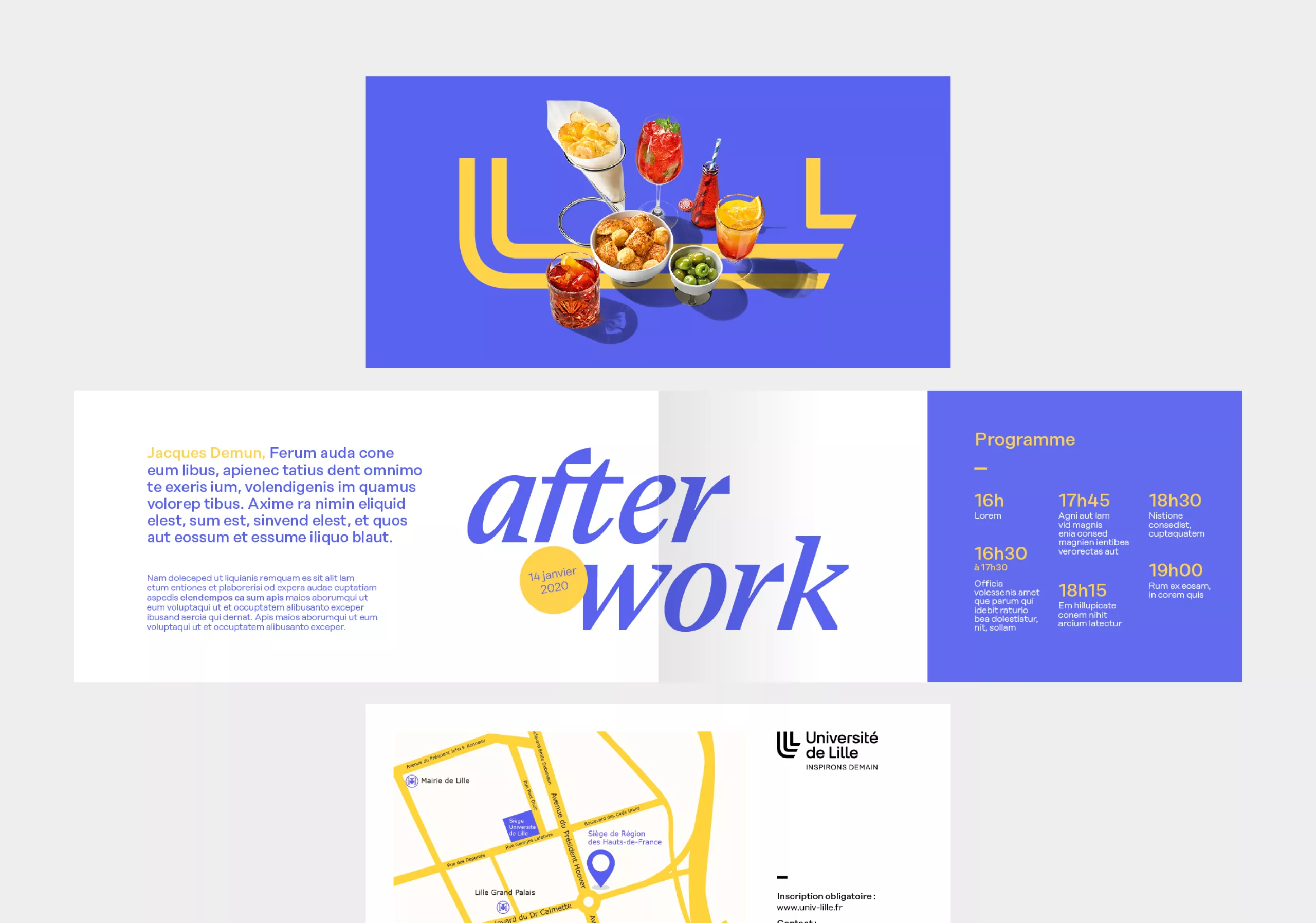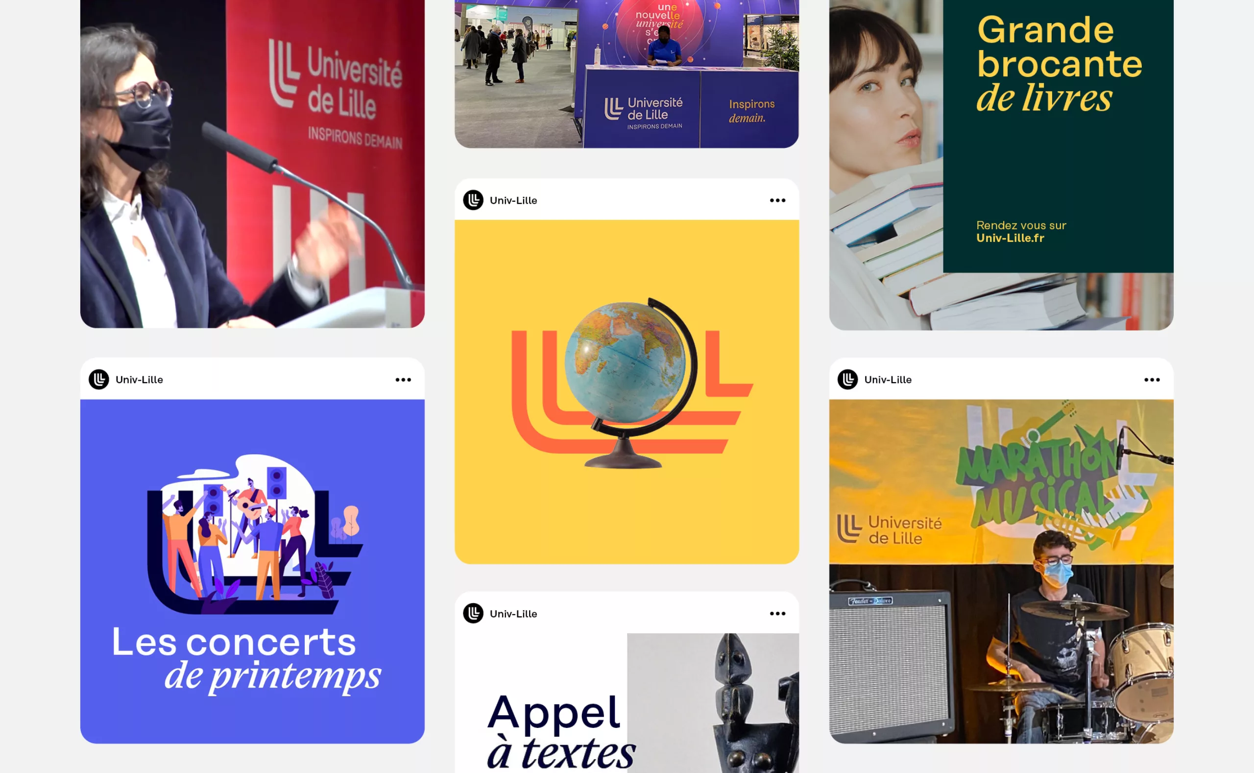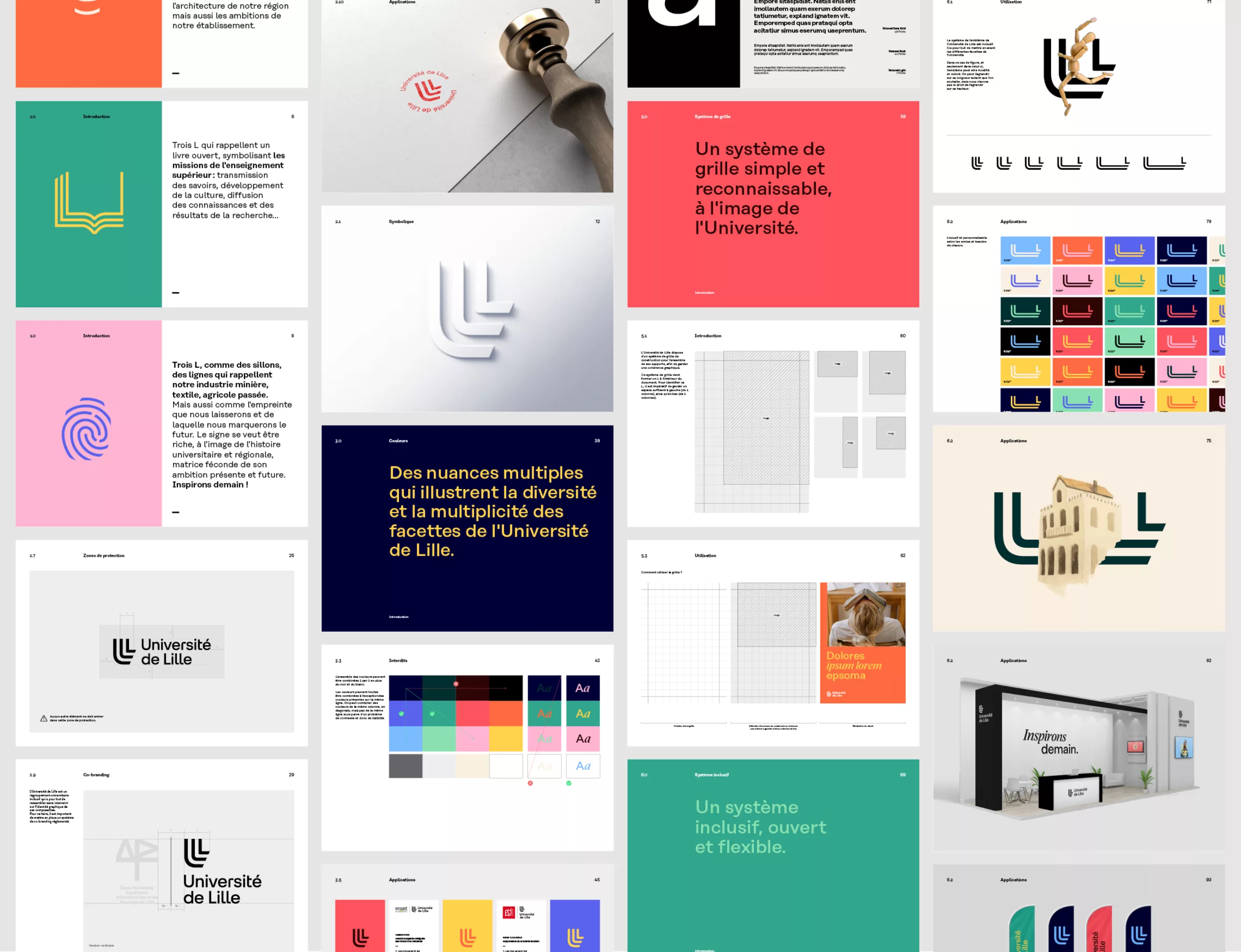 Le bloc typographique, dessiné sur mesure, a été pensé en harmonie avec l’emblème. On y retrouve de nombreuses similitudes formelles tel que la simplification des fûts et la définition de contres formes carrées qui rappellent les coupe de l’emblème. Ce logotype institutionnel permet une grande variété d’actions au sein du système visuel. La création de cette nouvelle identité a été réalisée en co-construction avec les équipes de l’Université de Lille lors de différents workshops. Des échanges précieux qui ont permis l’émergence et l’adhésion autour de ce projet d’identité visuelle.