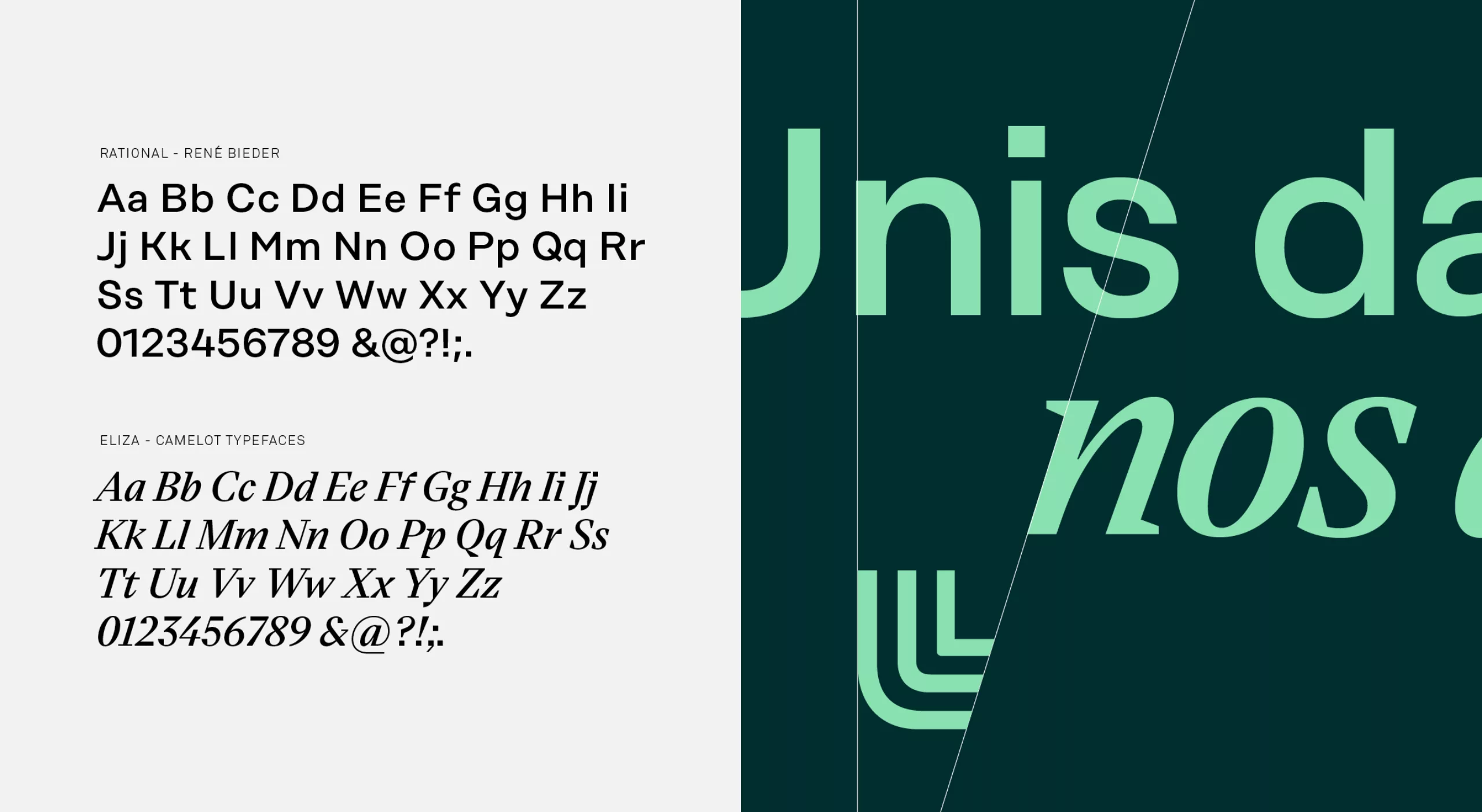 Deux typographies d’accompagnement sont utilisées au sein de la charte. La Rational de René Bieder et Eliza, de Camelot Typefaces. Leur association transcrit l’accord parfait entre tradition française et modernité Européenne. Ce duo donne du relief aux titres et son italique fait directement écho à l’emblème.