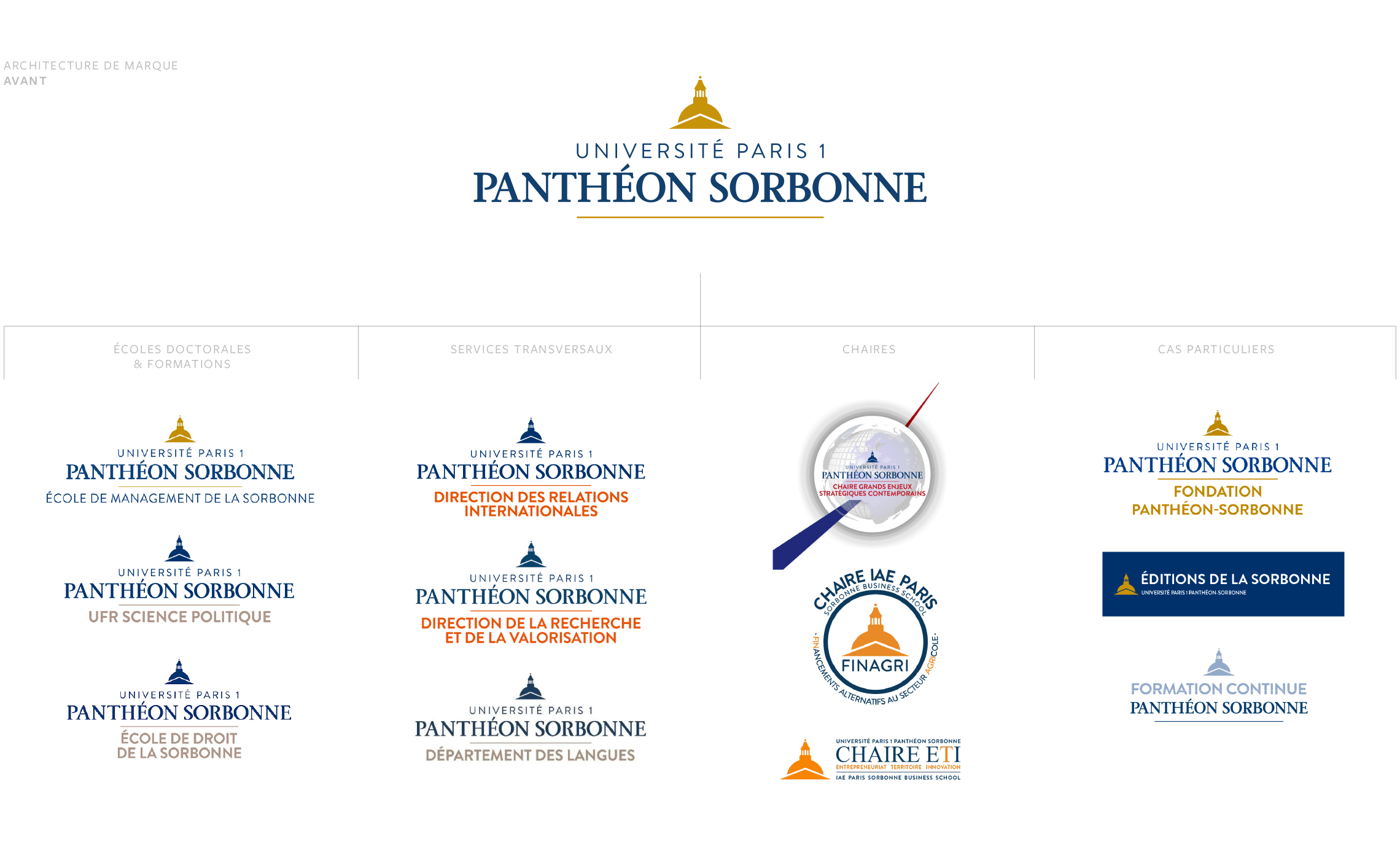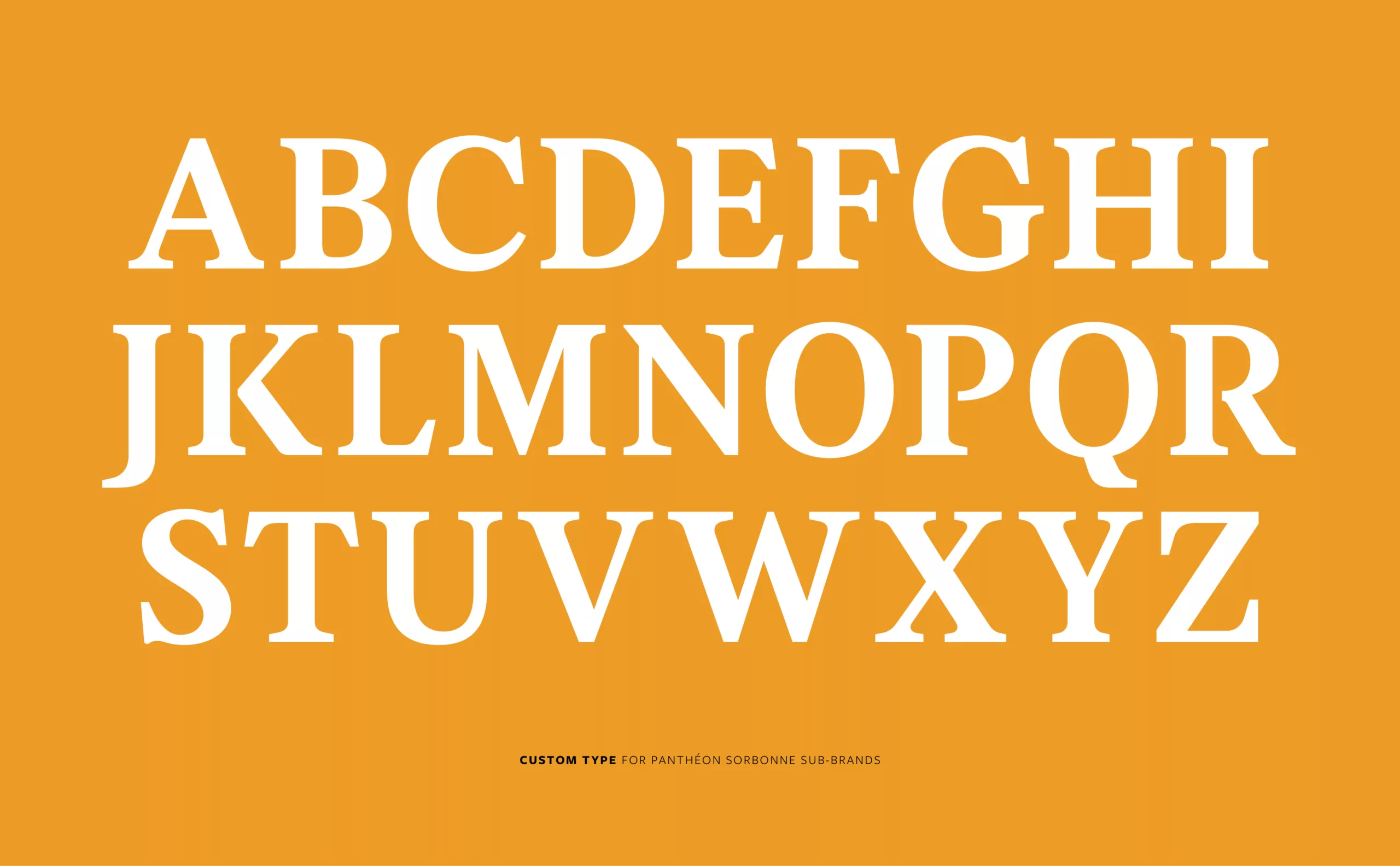 Un premier audit de l’existant nous fait constater la dilution de la marque universitaire. Plusieurs versions du bloc typographique et de l’emblème circulent, contrefaisant en interne même la marque Panthéon-Sorbonne. Pour optimiser l’encombrement du bloc typographique, nous le re dessinons sur mesure. Le style universitaire et statutaire initial du bloc est conservé. Chaque lettre et l’ensemble des ligatures sont repensés pour finaliser un logo lisible et compact.
