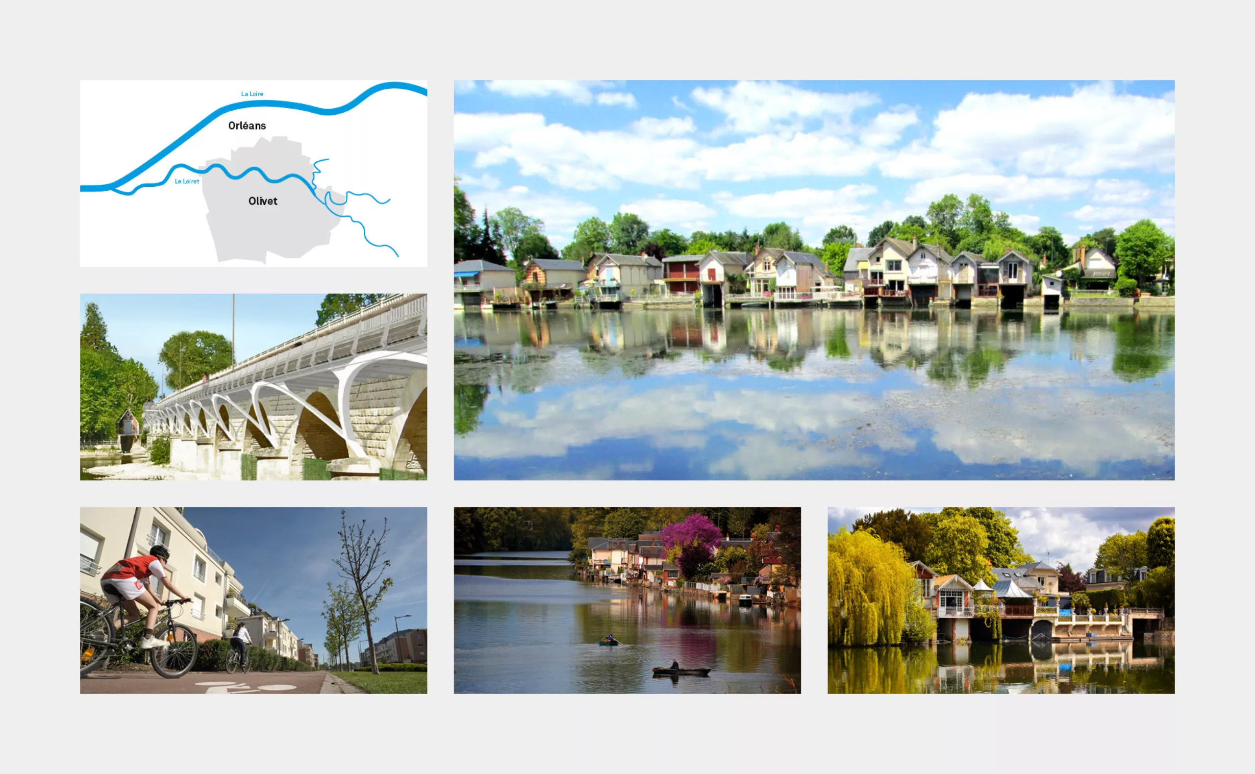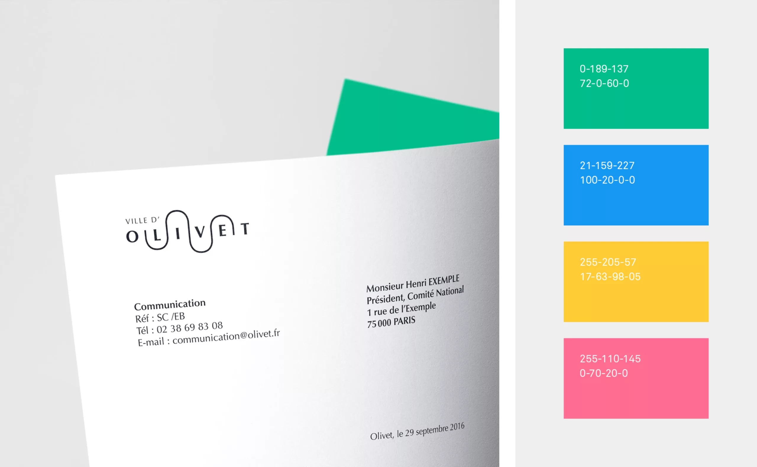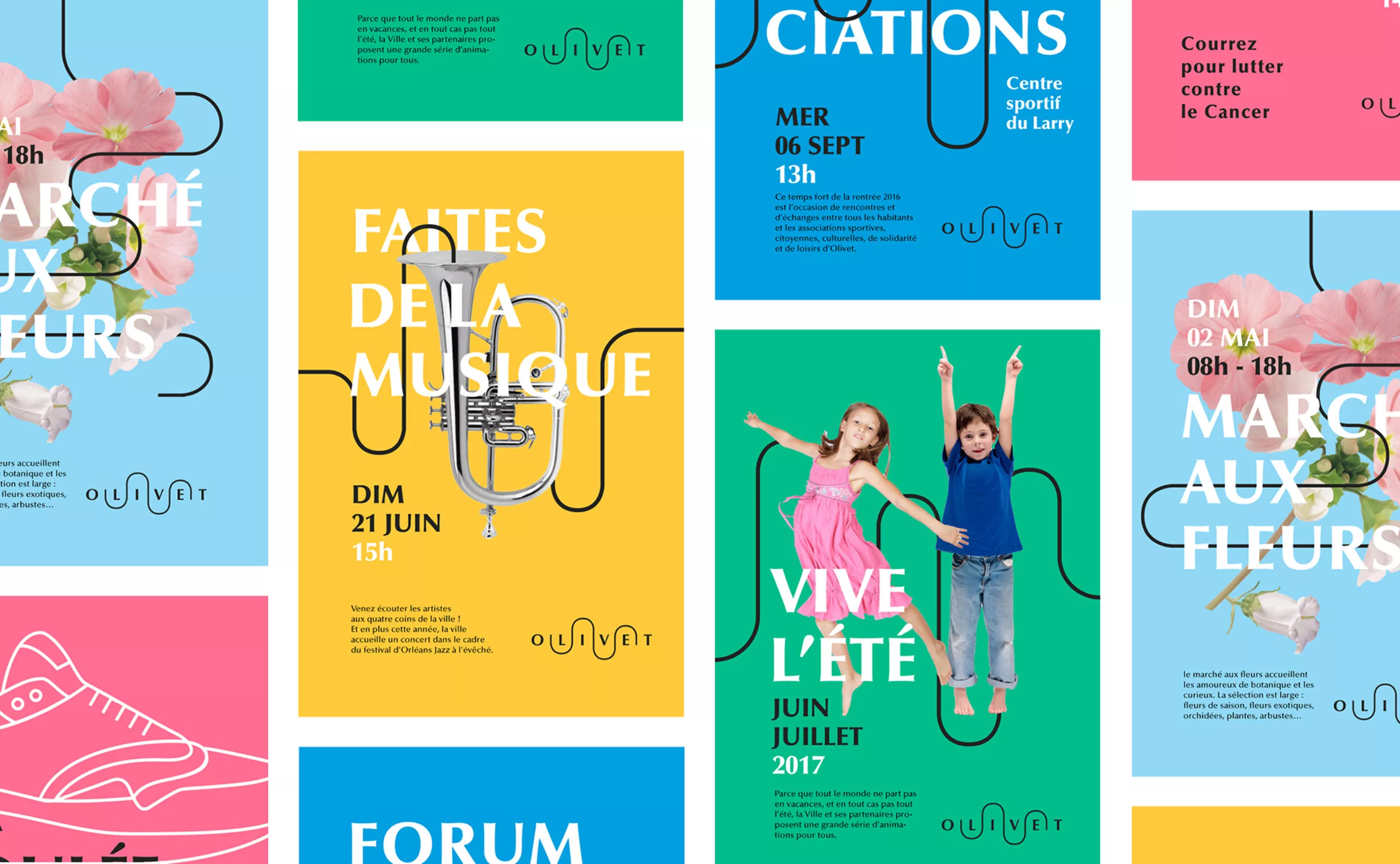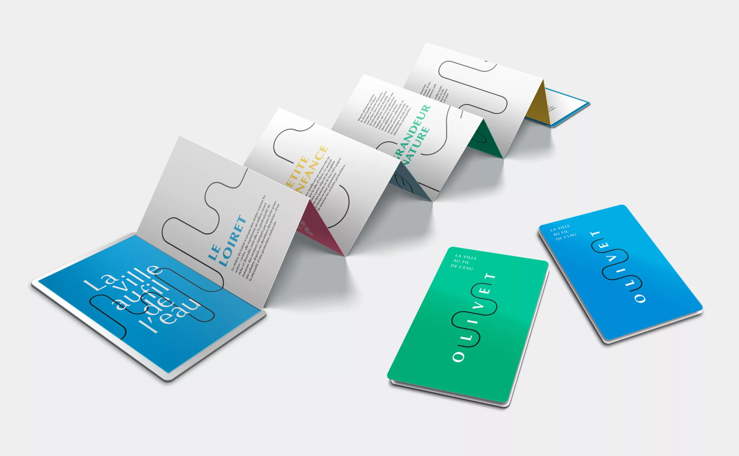 Olivet est une commune de 20 000 habitants située à proximité immédiate d’Orléans. Nous avons choisi de baser notre proposition d’identité visuelle (non retenue) sur sa situation géographique et sa proximité avec la rivière du Loiret, déterminante de l’identité de la ville. Notre travail s’inscrit naturellement dans la continuité de l’identité visuelle précédente.