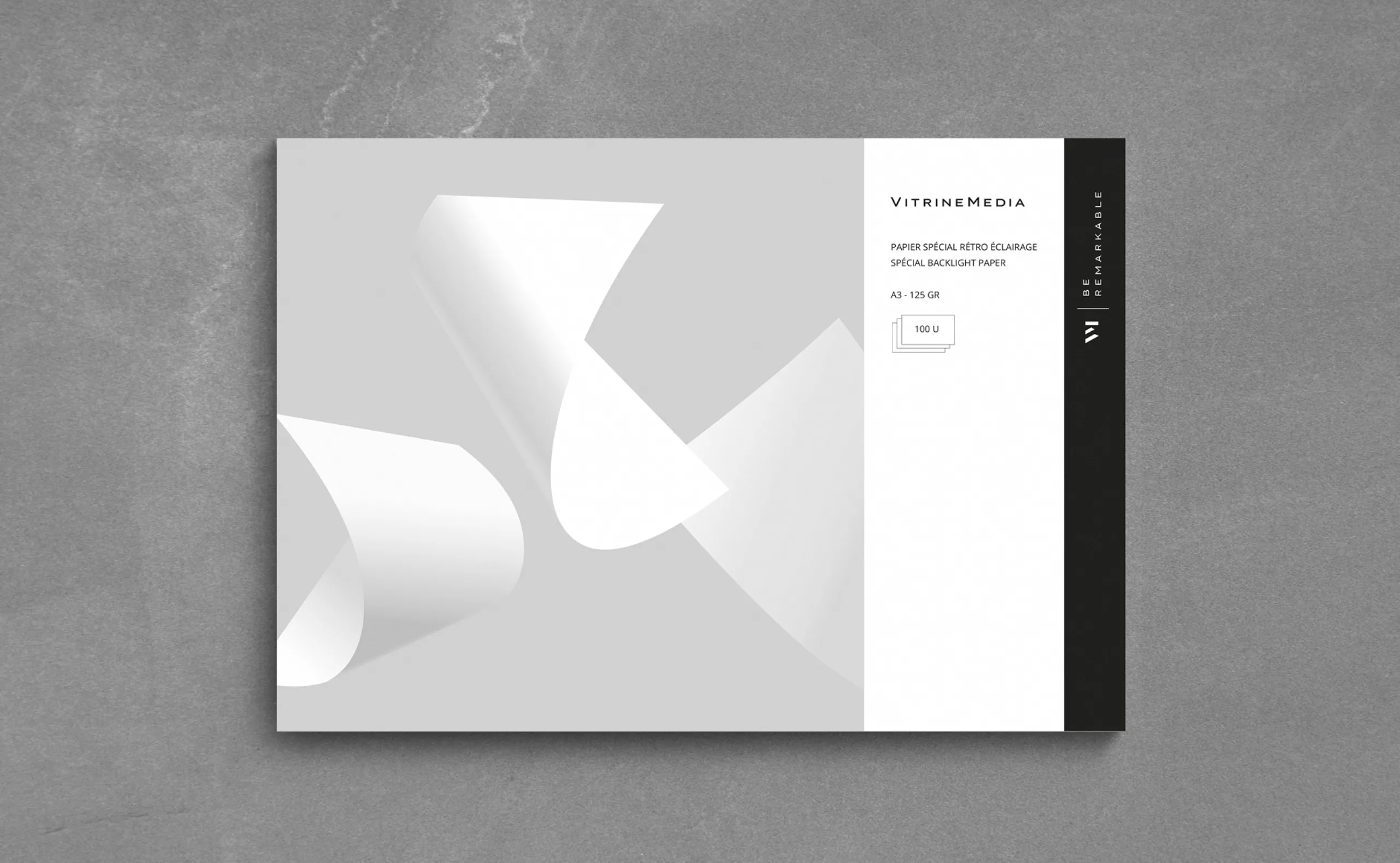 Son graphisme détourne le dessin des capitales Didones où le contraste aurait été poussé à l’extrême, jusqu’à la disparition complète des déliés. Ce jeu typographique provoque un effet optique proche de l’éblouissement. En jouant sur l’idée de fascination pour la lumière, le nouvel emblème traduit la promesse de VitrineMedia : “Make your Business Remarkable”.